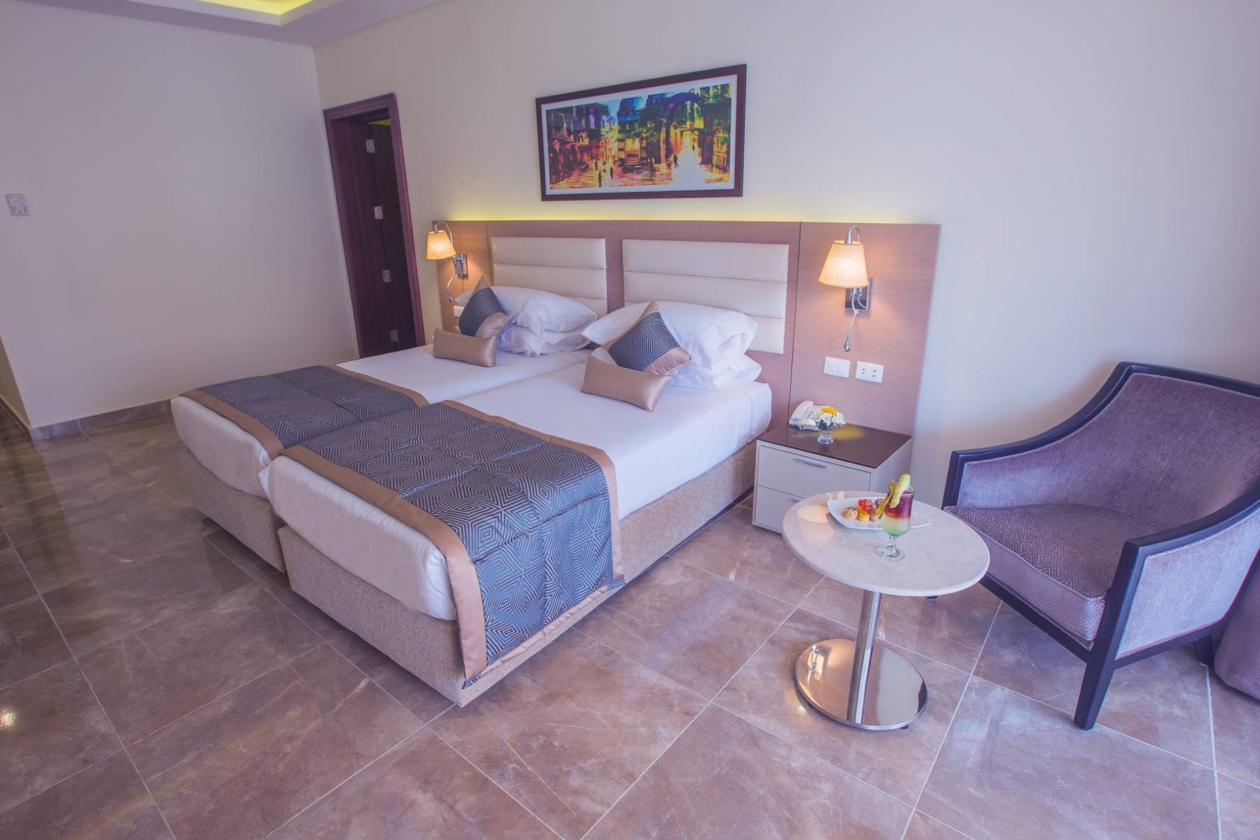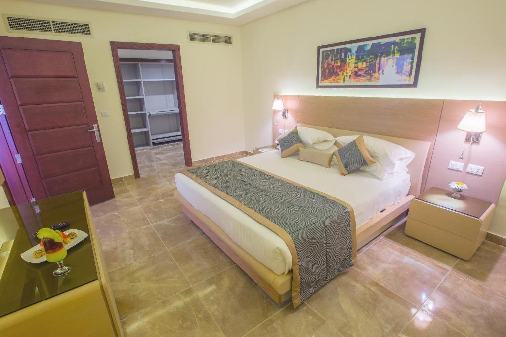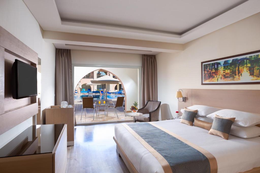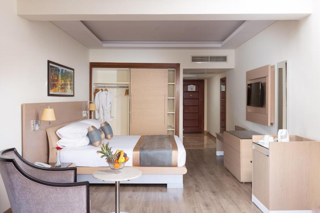 Smeštaj: Hotel ima ukupno 548 smeštajnih jedinica sve imaju klima uređaj, SAT LCD TV, sef, balkon/terasu, mini bar, fen za kosu. Mogu imati pogled na baštu ili na bazene. Standardne sobe su veličine oko 32m2 dok su porodične sobe veličine oko 50m2.