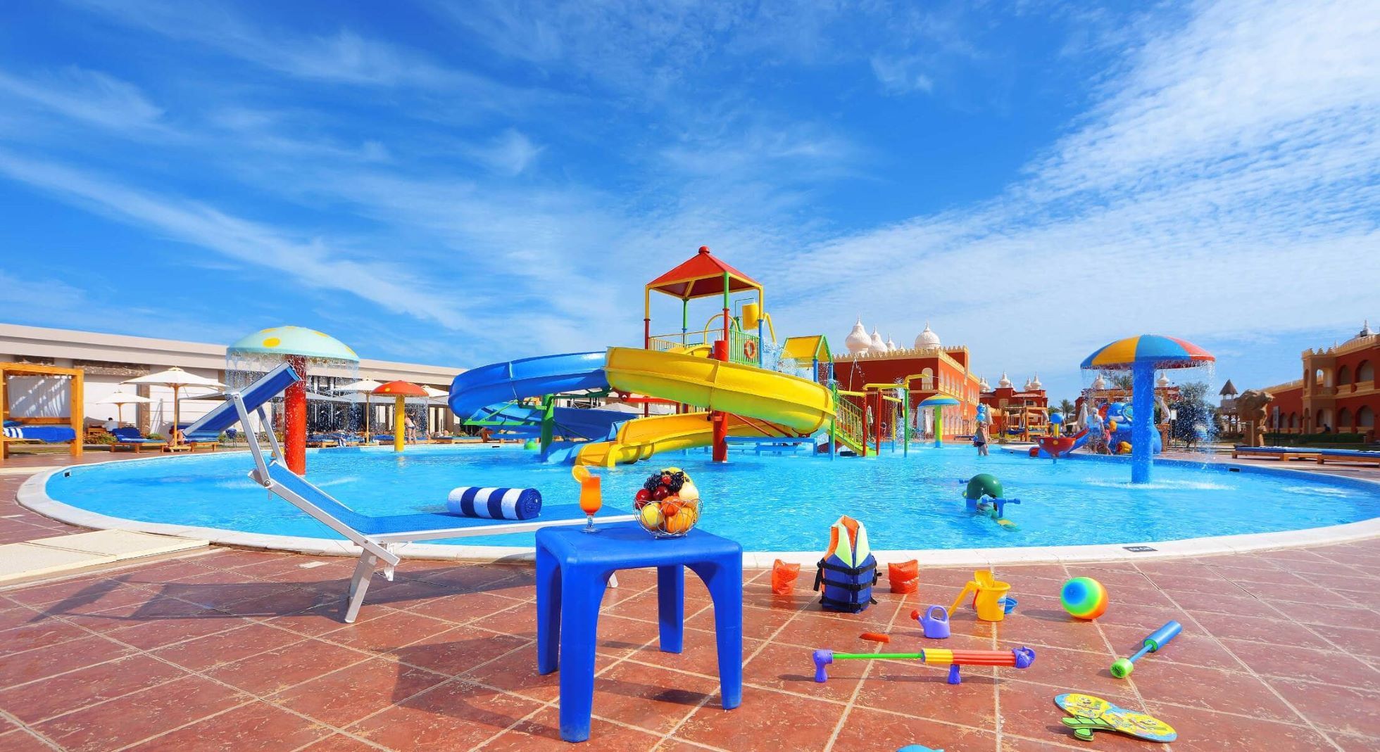 Hotel u ponudi ima 7 bazena – pet bazena za odrasle od kojih 3 imaju deo za decu i dva bazena za decu (tri bazena se greju za vreme zimske sezone), 6 tobogana za decu, vaterpolo, aerobik, boćanje, odbojku na plaži, fudbalski teren, dva terena za tenis, stoni tenis, mini golf, teretana, dnevnu i noćnu animaciju, Wi-Fi internet je besplatan u javnim prostorijama. menjačnicu, sef, suvenirnicu,