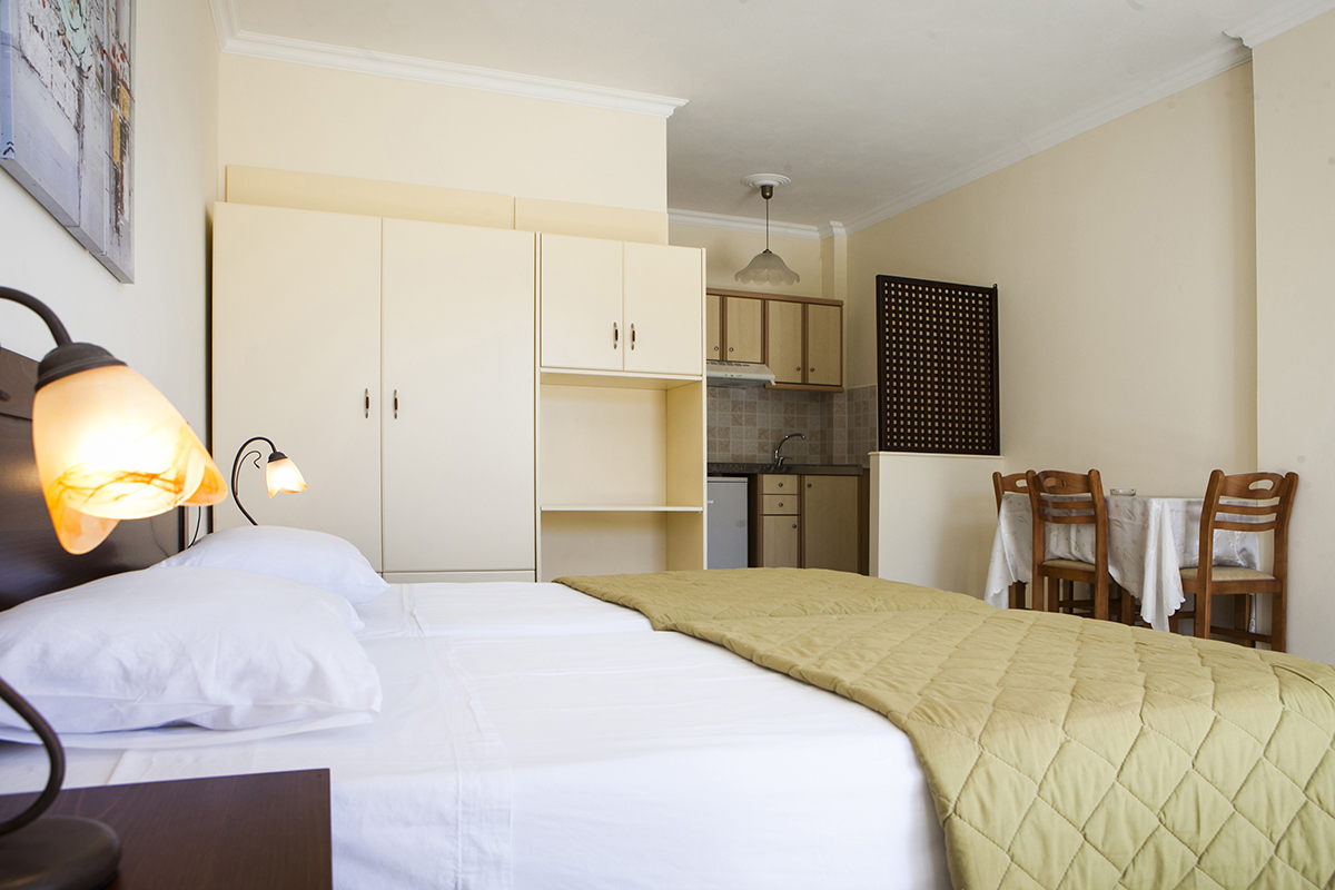 Dvokrevetni/trokrevetni studiji: poseduju adekvatan broj ležajeva, kuhinju, frižider, kupatilo sa tuš/wc, terasu sa garniturom za sedenje. Studiji se nalaze u prizemlju, na prvom i drugom spratu.