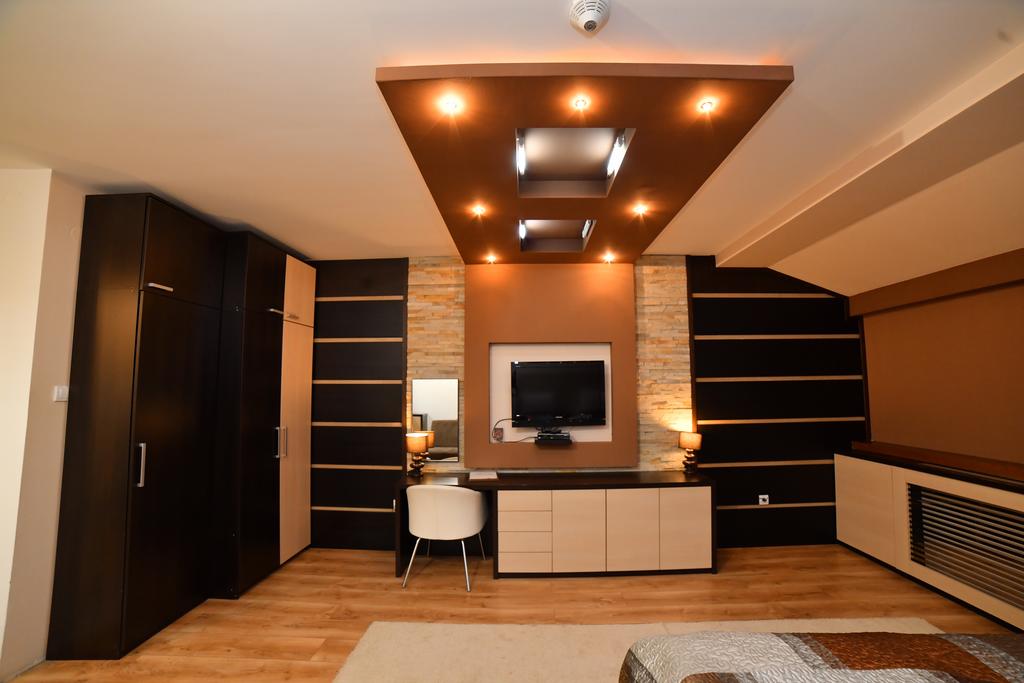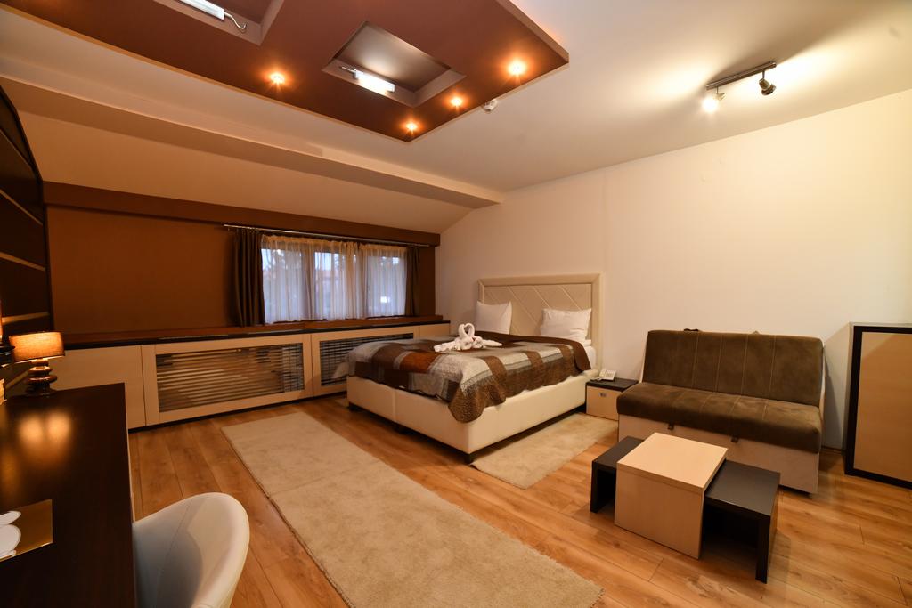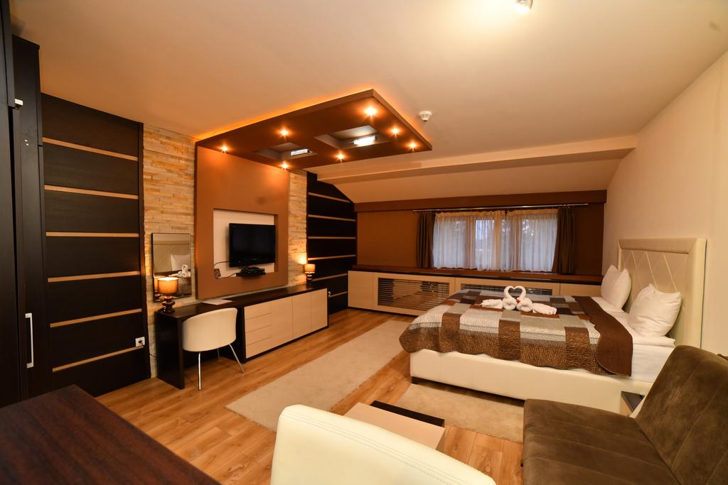 - Kraljevski apartman 4+2 (max 6 osoba):najluksuzniji deo ponude, apartman 140 m2 , sa spavaćom sobom sa francuskim ležajem + spavaća soba na spratu (francuski ležaj) + dnevni boravak sa zidovima obloženim dekorativnim kamenom i difuznom halogenom i LED rasvetom, kompletno opremljenom kuhinjom, dva kupatila (tuš, fen, sauna, jakuzzi, bademantil, papuče), smart TV u dnevnoj sobi + TV led u svakoj spavaćoj sobi, telefon, sef, minibar, wireless internet.Nalazi se u objektu Zoned 1.
