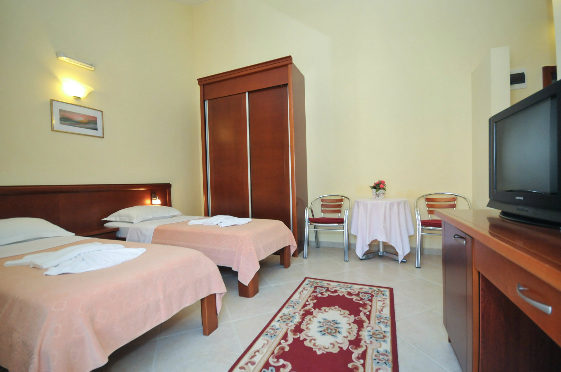 Trokrevetna soba: Broj osoba: 3, Broj kreveta:1 bračni, 1 kauč. Terasa, parking, klima uredjaj,grijanje, TV, peškiri, bezični pristup internetu