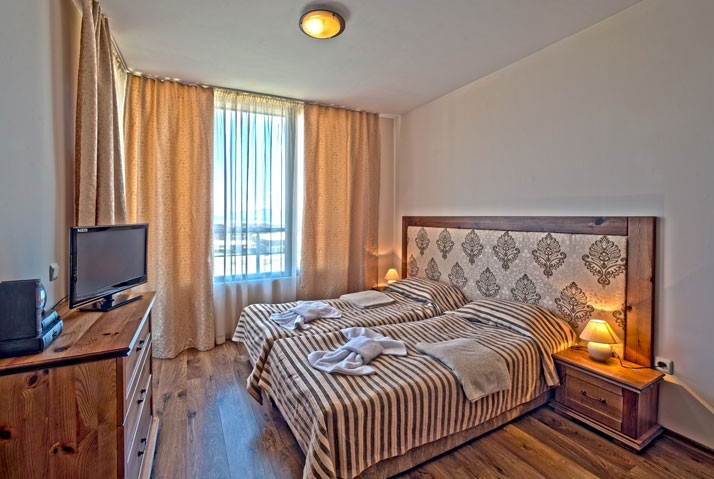 - Dvosobni apartman za smeštaj 4-6 osobe (4+2): 86 m2, dve odvojene spavaće sobe,jedna sa francuskim ležajem, a druga soba sa dva odvojena ležaja, dnevni boravak sa sofom na rasklapanje, kompletno opremljena kuhinja, kupatilo sa fenom za kosu, odvojeni toalet, balkon.