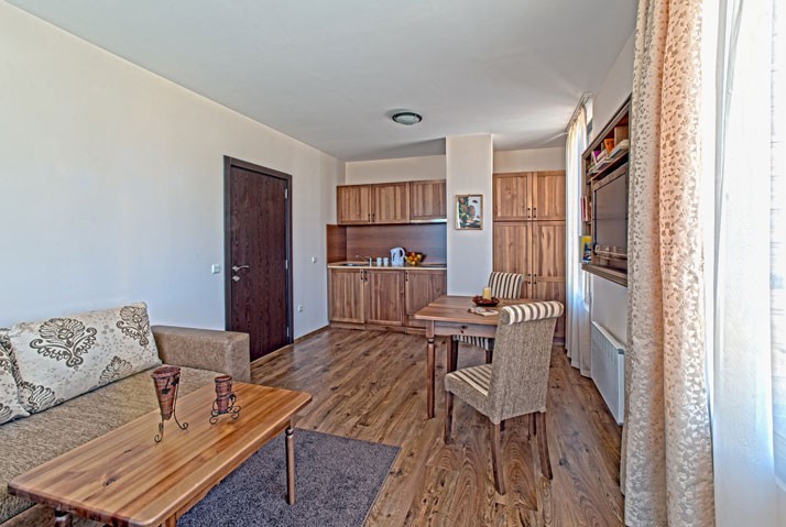 - Jednosobni apartman za smeštaj 2-4 osobe (2+2): 56-66 m2, spavaća soba sa francuskim ležajem ili dva odvojena ležaja, dnevni boravak sa sofom na rasklapanje, kompletno opremljena kuhinja, kupatilo sa fenom za kosu, sa balkonom ili bez balkona.