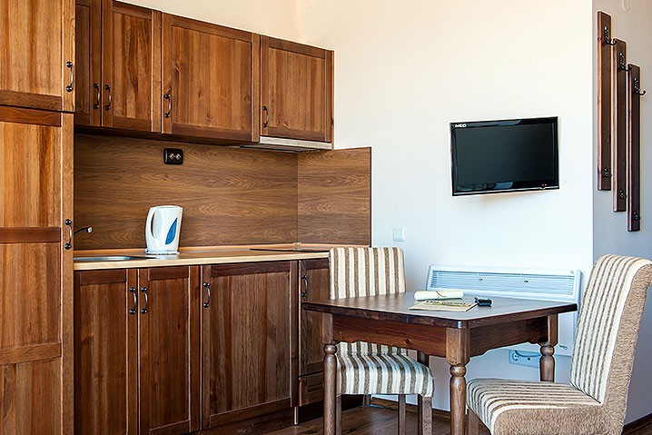 - Studio za smeštaj 2-3 osobe (2+1): 32-46 m2, dva odvojena ležaja ili francuski ležaj, sofa na rasklapanje, minibar, SAT TV, kompletno opremljena kuhinja, kupatilo sa fenom za kosu, sa balkonom ili bez balkona. Namenjen smeštaju maksimalno 2 odraslih i jedno dete do 11.99 god.