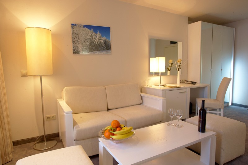 - Jednosobni apartman za 2-4 osobe: spavaća soba sa francuskim ležajem, dnevni boravak sa sofom na razvlačenje (nema vrata) za dve odrasle osobe i/ili dvoje dece.