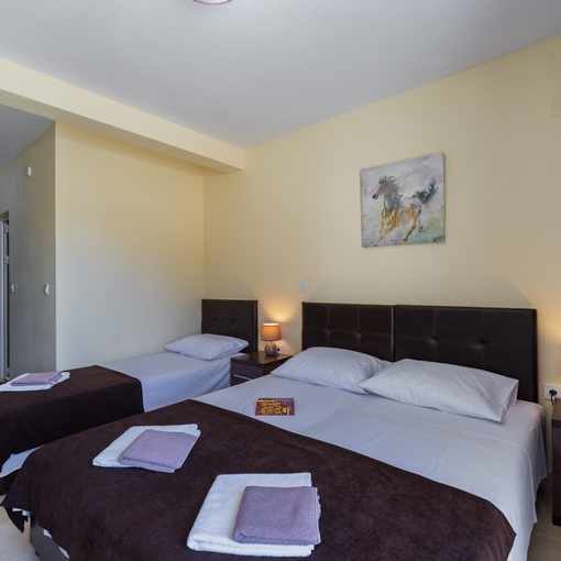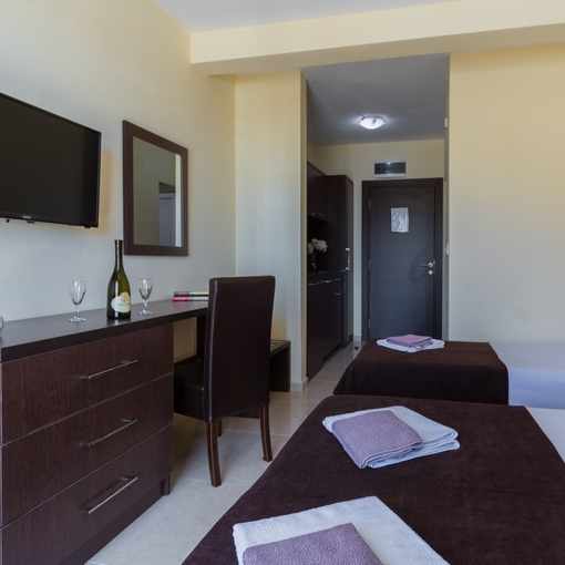 Hotel Adria Harmony gostima nudi standardne sobe i to jednokrevetne, dvokrevetne, trokrevtene četvorokrevetne sobe, kao i dupleks sobe. Sve sobe su klimatizovane i imaju terasu sa garniturom za sedenje, opremljene sopstvenim kupatilom sa tušem, SAT/TV, WiFi konekciju i frižider. Pogled iz sobe može biti na more, ili panoramu Čanja, ili brdo iznad.