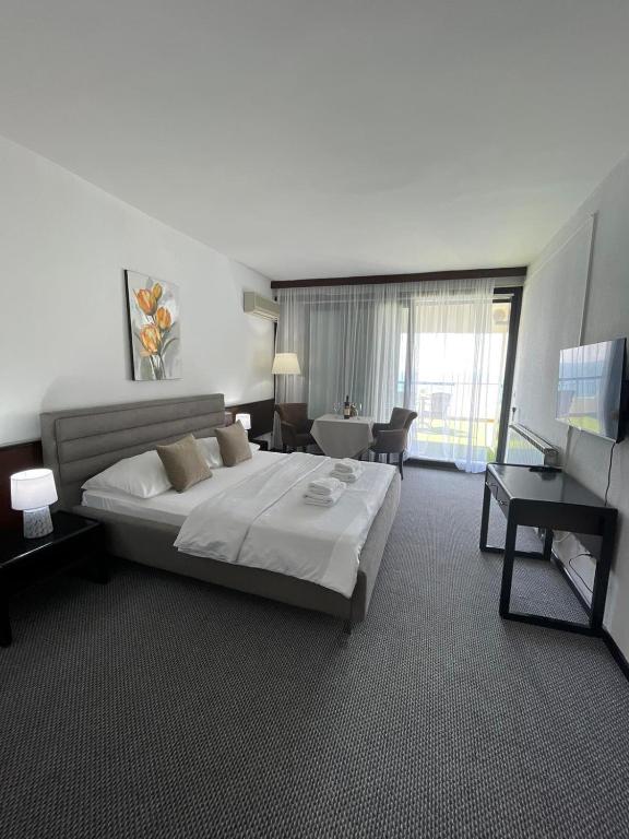 Hotelski sadržaji: Dva restorana, bar, kafe-bar na javnoj plaži, zatvoreni bazen, sauna, konferencijska sala, saloni i terasa za prijeme i koktele, izložbeni prostor, internet, TV sala, sef, parking, pešačke staze.