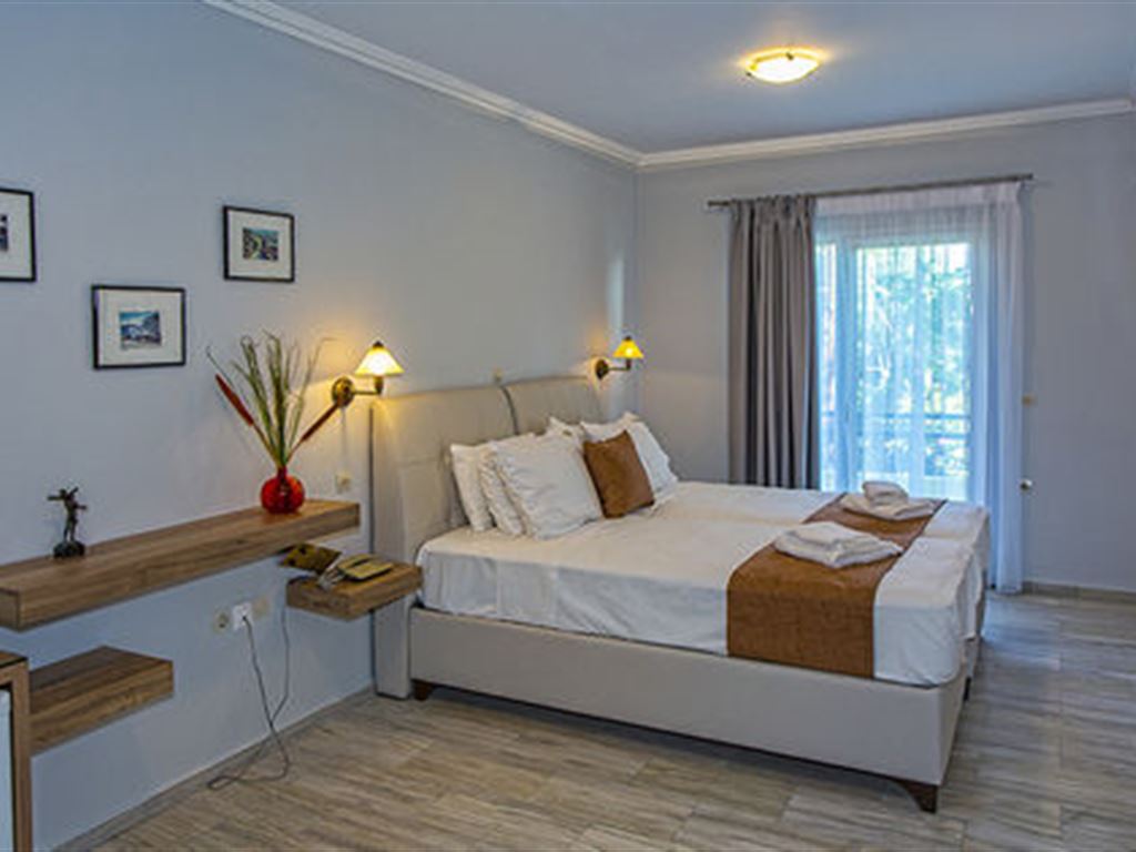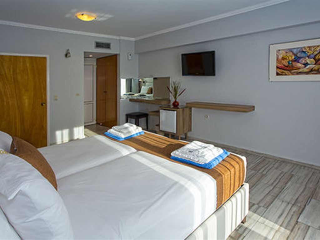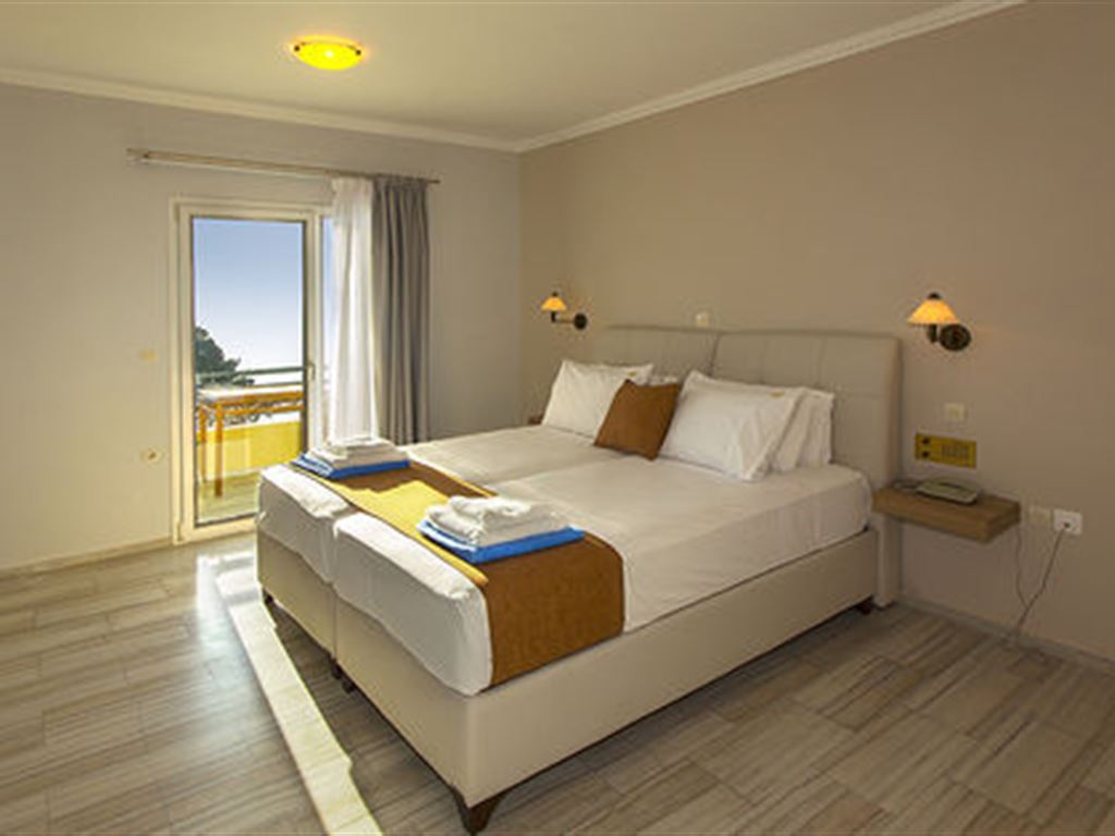 Sadržaj soba: sobe su renovirane, veoma prostrane, sve su nepušačke i imaju 2 kreveta ili bračni ležaj sa sofom, mini bar, TV, klima uređaj. Svi balkoni/ terase imaju balkonski nameštaj i prelep pogled na Jonsko more ili baštu.