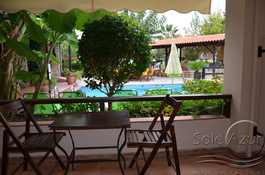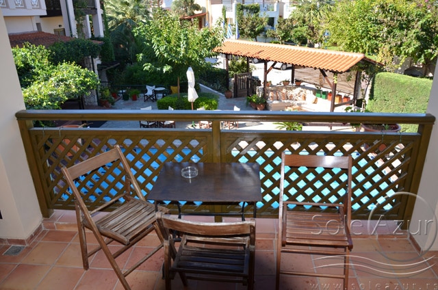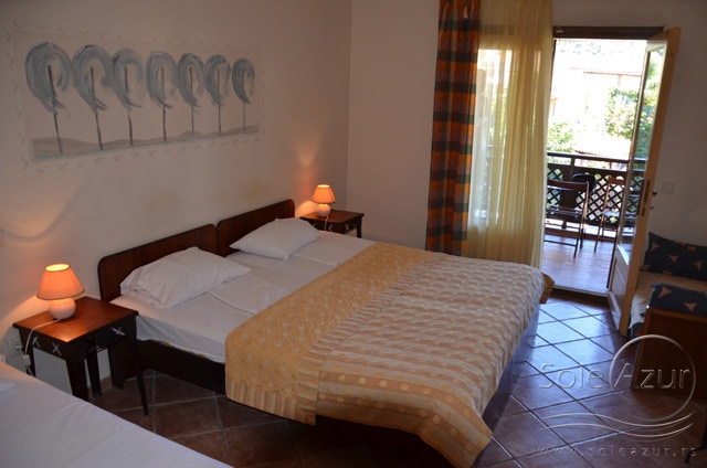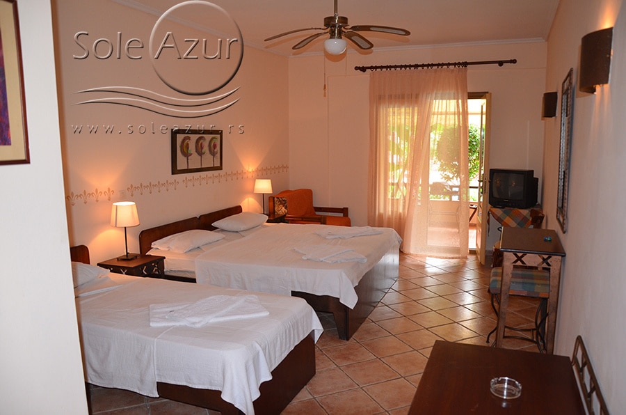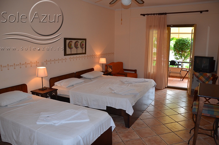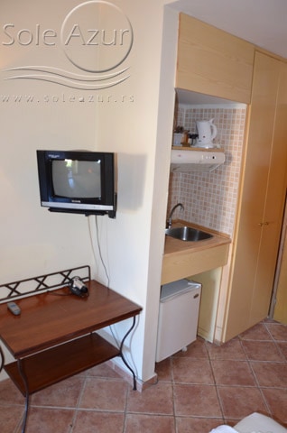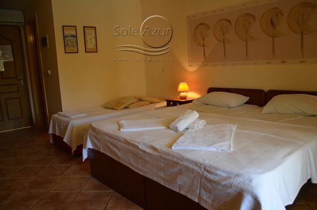 1/3+1 SOBA: koja u svom sastavu ima jedan francuski ležaj veličine 190x160cm, jedan singl standardni ležaj veličine 190x90cm, i foteljom na razvlačenje, koja kada se razvuče ima dimenzije 185x85cm. Klima uređaj (uključen u cenu) TV, ketler, kupatilo sa tuš/wc, fen za kosu i terasa sa setom od stola sa četiri stolice. Soba poseduje po dva peškira po osobi.