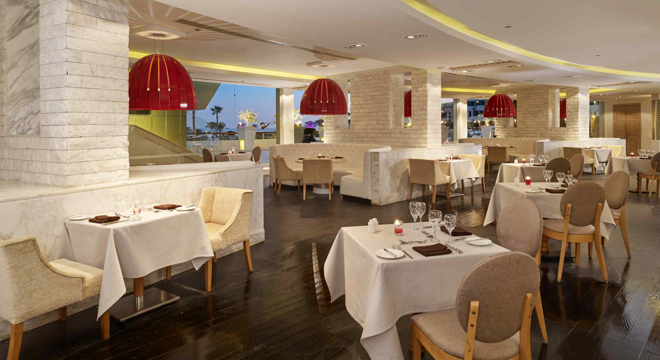 Hotelski sadržaj: Osim glavog restorana, hotel u ponudi ima i 5 vrhunskih a la carte restorana: Casa Bianca (italijanski), Gokan(japanski i azijski), Tiran Diner&Beach Bar, The Stone grill (jedinstven koncept kulinarstva - priprema hrane na kamenju), Serene Beach Club (restoran morskih specijaliteta), 7 tematskih barova, menjačnicu, servis za pranje i peglanje, prodavnice, rent-a car i salon lepote.