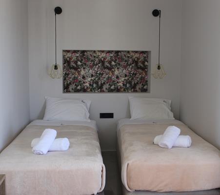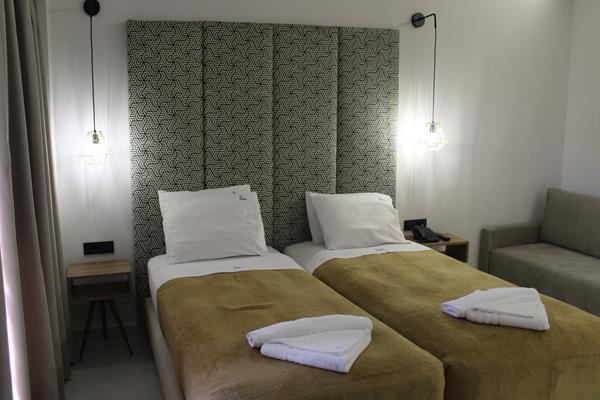 Smeštaj: Hotel raspolaže sa 48 prostranih studija i apartmana, koji nude funkcionalnost i udobnost potrebnu za savršen odmor. Svi smeštajne jedinice sadrže: flat TV, klima uređaj ( uz doplatu), Wi-Fi (besplatno), frižider i mini kuhinju sa ketlerom, rešo sa dve ringle, frižiderom, kupatilo, fen za kosu, balkon ili terasu. Studiji su kapaciteta do tri osobe, dok se u apartman sa jednom sobom može smestiti maksimum četiri odrasle osobe, ili dvoje odraslih i dvoje dece. Studiji se sastoje od jedne prostorije u kojoj se nalazi jedan bračni ležaj ili dva singl ležaja, kao i jedan singl ležaj i dve fotelje. Apartmani se sastoje od jedne spavaće sobe sa francuskim ležajem i odvojenog dela sa dva kreveta i opremljenom kuhinjom, površine su oko 35 m2. Kuhinja poseduje ketler, šporet i frižider. Zamena posteljine se vrši svaki treći dan, dok se zamena peškira vrši svaki drugi dan. Krevetac za bebu je na raspolaganju gostima besplatno ( dobija se na upit).