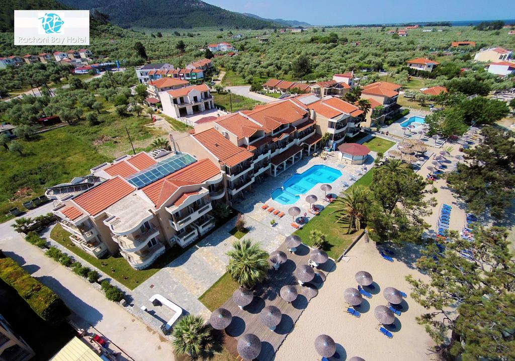 Hotel Rachoni Bay Resort 3* (Skala Rahoni,Tasos) je novoizgrađeni deo kompleksa u čijem sastavu se još nalaze i hotel Rachoni Beach koji su građeni u ranijem periodu. Nalazi se u malom mestu Skala Rahoni udaljenom 12 km od glavnog grada Limenasa. Privilegija ovog hotela se ogleda u tome što je lociran direktno na peščanoj plaži na kojoj se čak može naći i prirodni hlad.