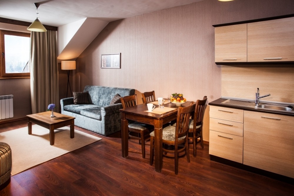Besplatne usluge: korišćenje zatvorenog bazena sa odeljkom za decu, finska sauna, parno kupatilo, hamam, relax soba, fitnes, dva đakuzija za 8 osoba, VIP đakuzi, masaža, skijašnica, internet, sef u apartmanima, igraonica za decu i animacija za decu uzrasta 4-14 godina, prevoz do gondole, parking