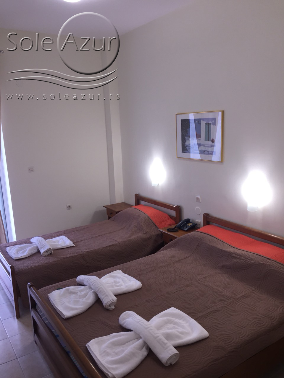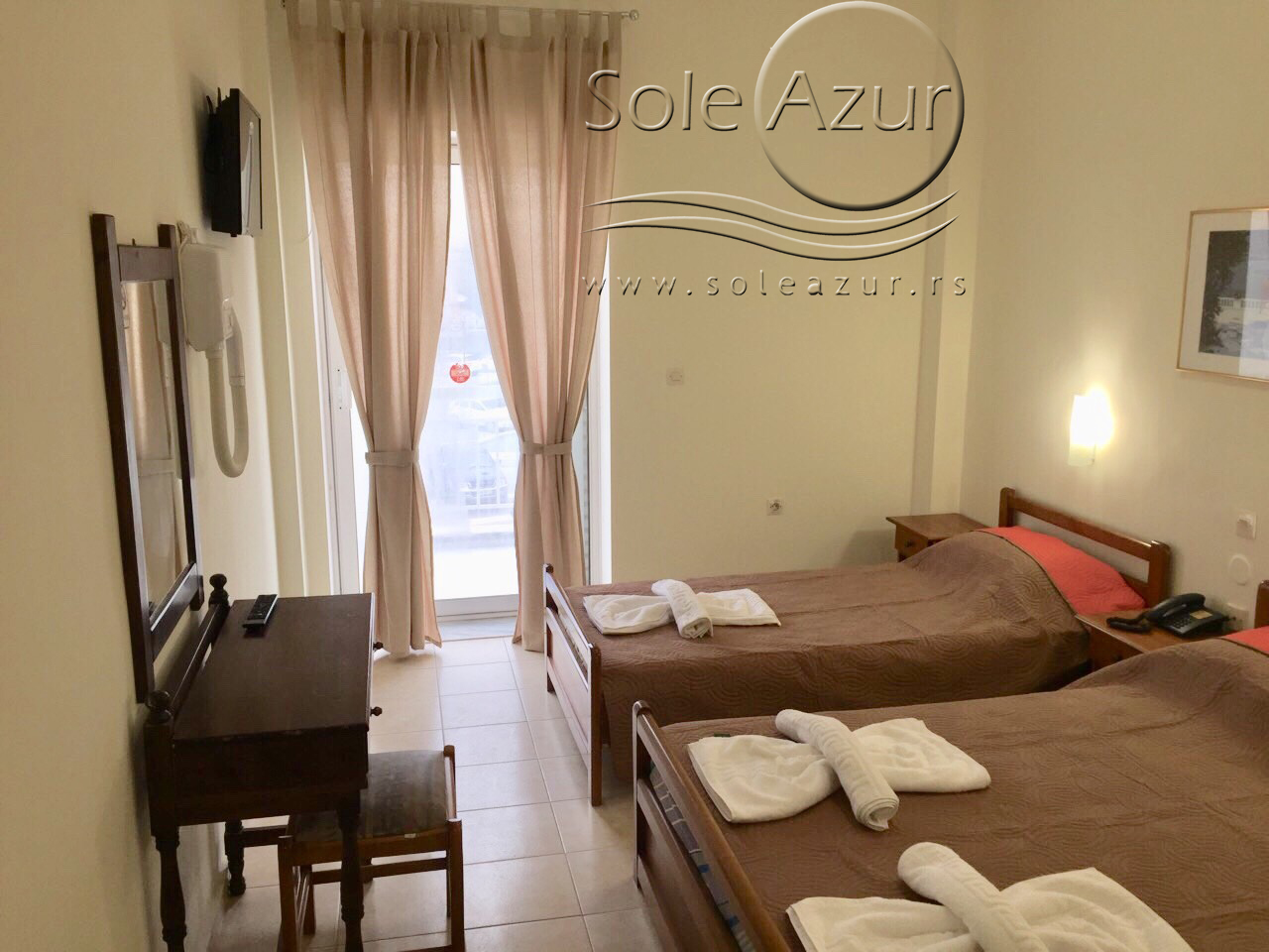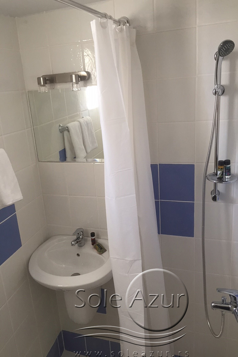 STANDARD SOBE: Standard sobe se nalaze na prvom spratu Simotel Ermis 3* hotela. Sve standard sobe su renovirane, sa tim da je nameštaj u sobi starijeg datuma. Sobe su opremljene za smeštaj 2-3 osobe i poseduju jedan francuski ležaj i jedan singl ležaj. Sobe poseduju ormar, dva noćna stočića, mali frižider, ketler, TV, klima uređaj, sto sa ogledalom. Kupatilo je potpuno renovirano i poseduje tuš sa zavesom. Pogled iz standard sobe je dvostrano orjentisan. Izlazi se na veliku terasu, koja je opremljena sa stolom i dve/tri stolice i ima pogled na zadnji dvorišni deo hotela i sa druge strane pogled je prema gradu.