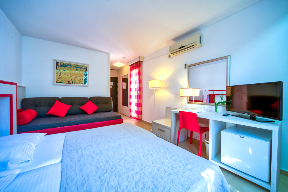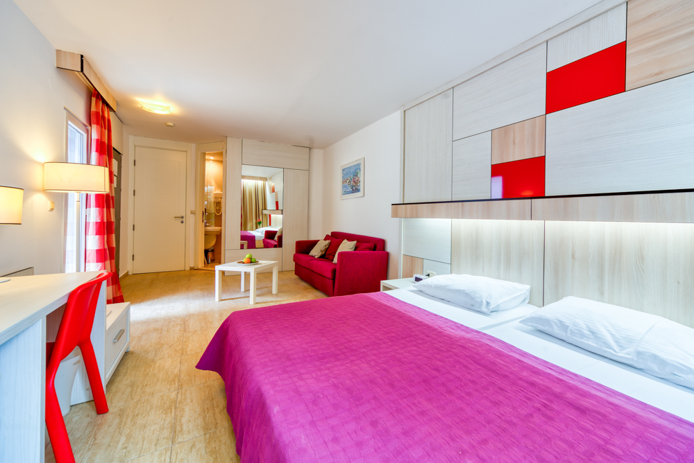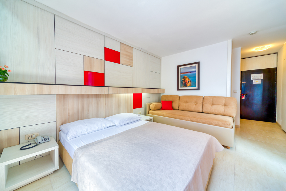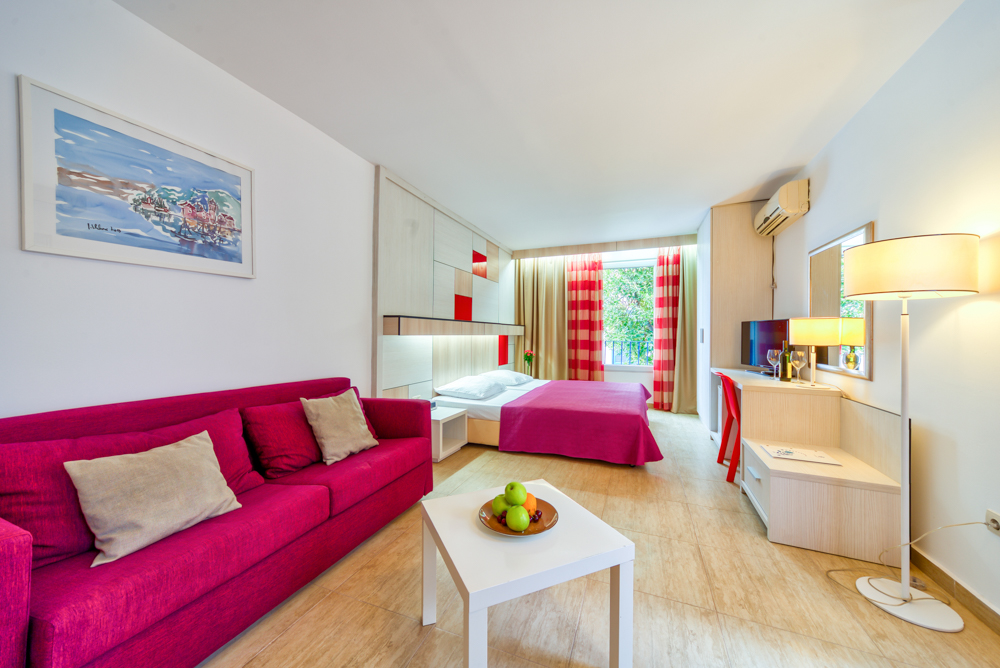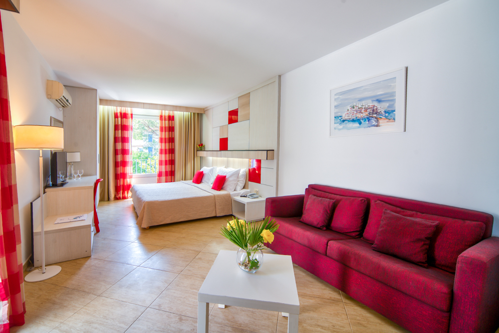 Studio apartman: Prostrani dvokrevetni apartman. Velika soba sa francuskim ili odvojenim krevetima i garniturom za sedenje. Sofa ima mogućnost razvlačenja. Smeštaj na sofi je za dvoje dece do 12 godina ili jednu odraslu osobu. Terasa na upit sa doplatom. Sobni sadržaj: sef,telefon, klima, sto, kablovska televizija, plazma TV, internet bez doplate (u sobama i na javnim površinama), servis za buđenje/AlarmMini, frižider (mini bar na upit), utičnica pored kreveta,dječiji krevetac (uz doplatu), orman.