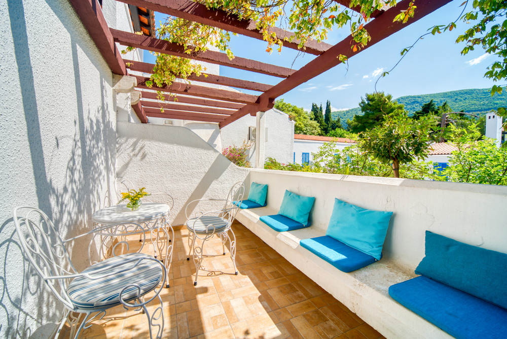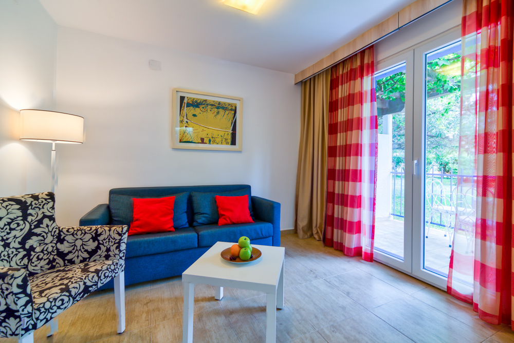 Porodični apartman sa terasom: Apartmani prilagođeni porodičnim aranžmanima. Smeštajna jedinica poseduje dve prostorije. Prostrane spavaće sobe opremljene razdvojenim ležajevima i sofom za sedenje (mogućnost razvlačenja). Standardno kupatilo sa opremom. U okviru apartmana je i balkon sa mobilijarom za sedenje i pogledom na lepo uredjene vrtove resorta. Sobni sadržaj: sef,telefon, klima, sto, kablovska televizija, plazma TV, internet bez doplate (u sobama i na javnim površinama), servis za buđenje/AlarmMini, frižider (mini bar na upit), utičnica pored kreveta,dječiji krevetac (uz doplatu), orman.