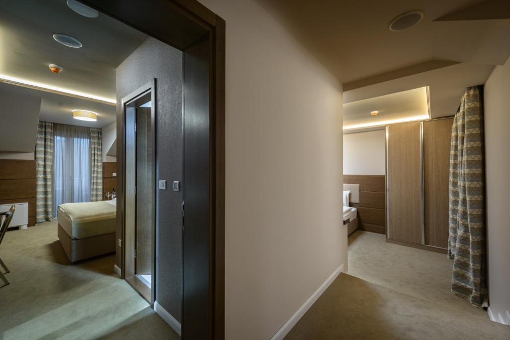 Deluxe spa soba - Još jedna specifična smeštajna jedinica u ponudi hotela, u opremljena privatnom saunom, hidromasažnom kadom u sklopu kupatila, odvojena staklenim zidom od spavaćeg dela u kojem je francuski ležaj dimenzija 200x220.
