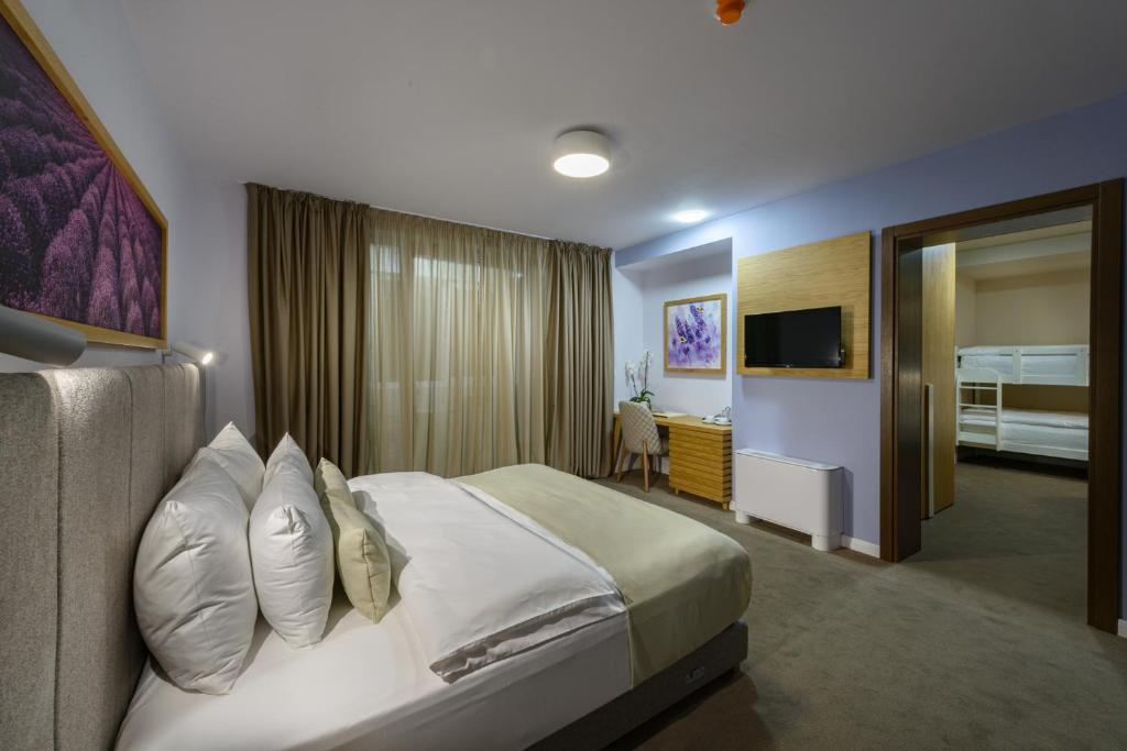 Porodična soba - Smeštajna jedinica sa dve odvojene spavaće sobe i terasom, idealna za porodicu sa dva manja deteta. U jednoj sobi je francuski ležaj dimenzija 160x200, dok je u drugoj francuski ležaj za jednu osobu dimenzija 140x200 ili dva twin kreveta 100x200.