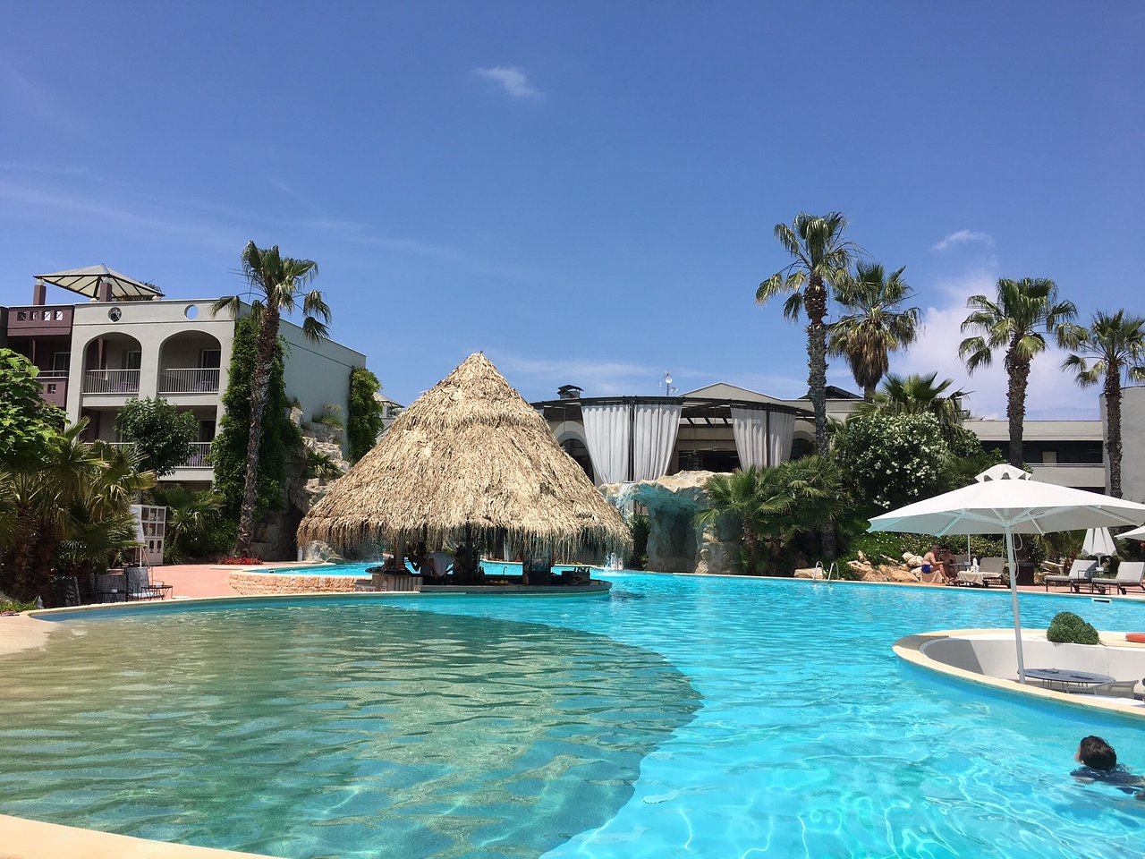 Sadrzaj hotela; parking, bazen sa barom, dečiji bazen, recepcija, wi-fi Internet u javnim delovima hotela (uz doplatu na licu mesta), 2 restorana i taverna, fitnes klub i teretana (uz doplatu na licu mesta), teniski teren (uz doplatu na licu mesta), teren za odbojku na plaži, lobi bar, welness centar (za razne tretmane i masaže – uz doplatu na licu mesta), mini market, igralište i mini klub za decu… Suncobrani i ležaljke oko bazena su uključeni u cenu, a na plaži se doplaćuju oko 7 eur dnevno (set: 2 ležaljke i suncobran). Peškiri za plažu se iznajmljuju uz depozit.