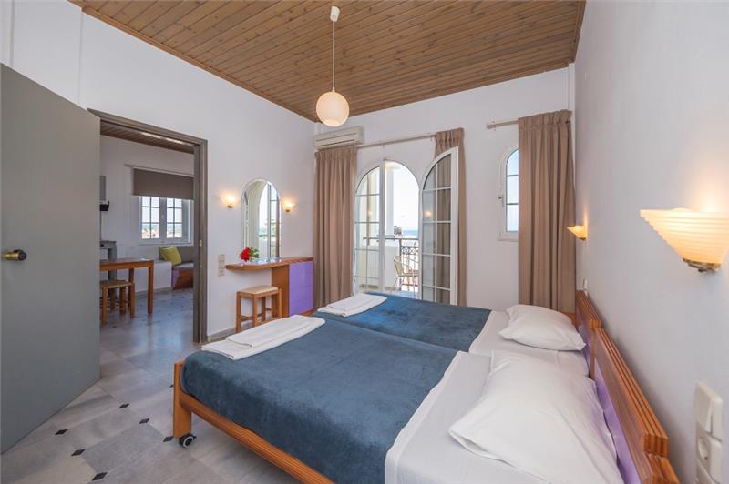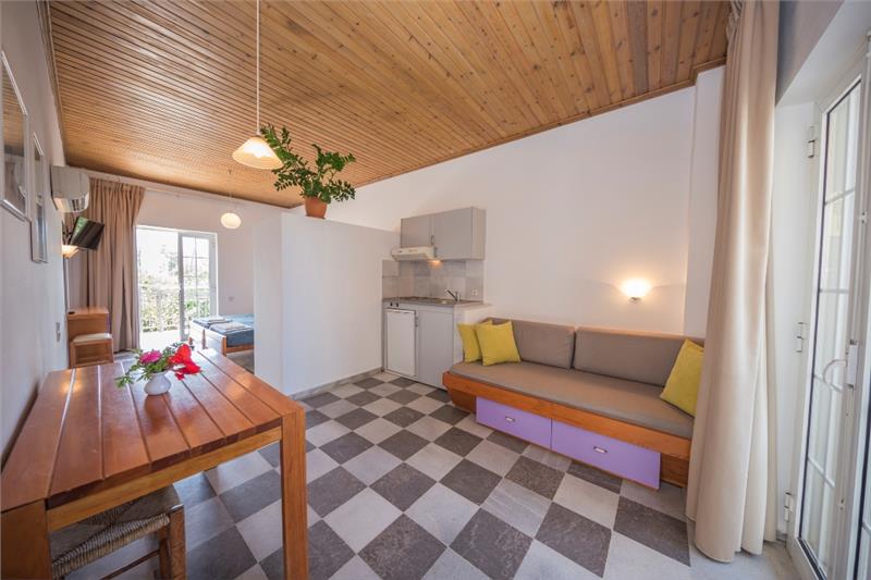 Apartmani: imaju dnevnu i odvojenu spavaću sobu, kupatilo, klima (uz doplatu), sef (uz doplatu), sat TV, mini kuhinju opremljenu osnovnim posuđem za kratku pripremu laganih obroka uz vremenski minimalno kuvanje, frižider, trpezarijski sto, balkon/terasa sa garniturom za sedenje.