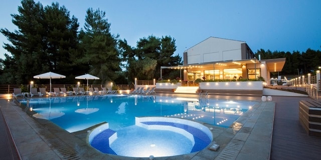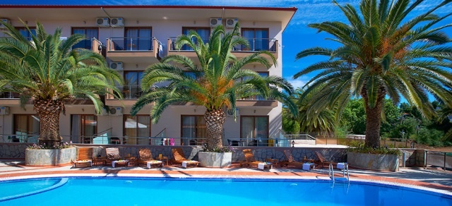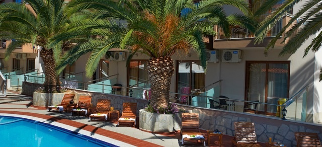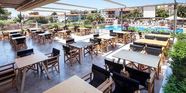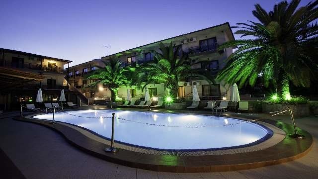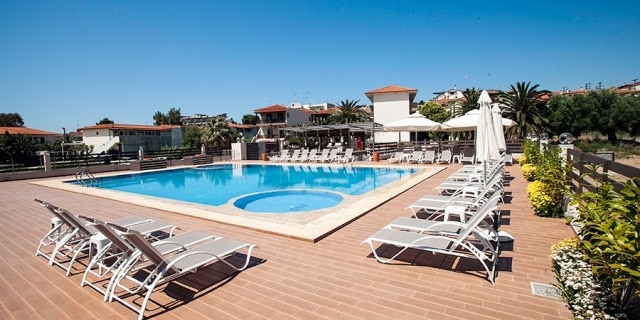 Sadržaj hotela: recepcija, bar, restoran, sala sa kaminom, otvoren bazen, bazen sa delom za decu, lobi, wi-fi Internet u javnim delovima hotela… Suncobrani i ležaljke oko bazena su uključeni u cenu, a na plaži se doplaćuju oko 6 eur (set: 2 ležaljke i suncobran).