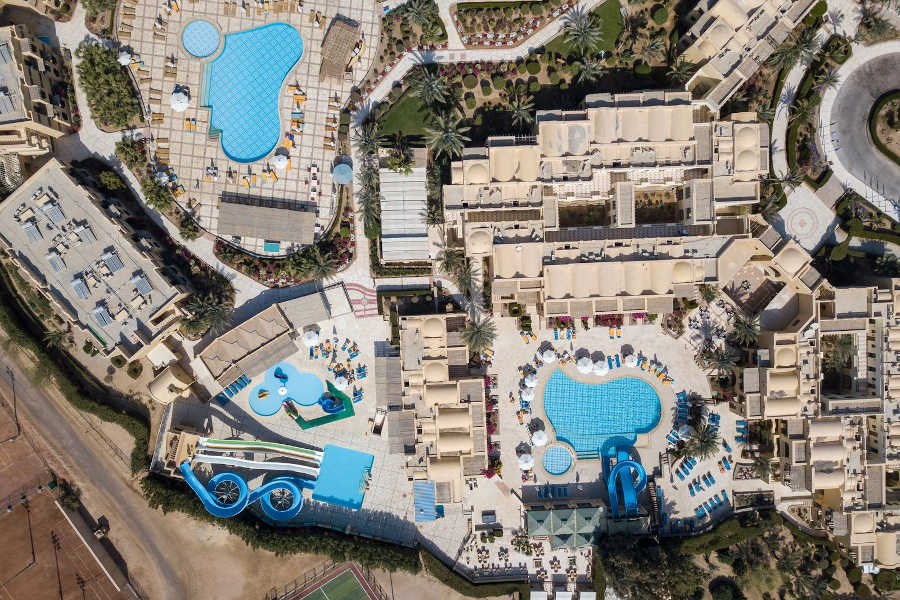 Hotelski sadržaj: Recepcija, više restorana (glavni restoran Sunny i a la carte restoran italijanske kuhinje Dolce Vita i a la carte restoran belgijske kuhinje Chez Pascal), bar, snack bar, više otvorenih bazena, Aqua park - tobogani, Wi-Fi internet, na javnim mestima u hotelu-recepciji, Wellness centar (fitnes, parno kupatilo, masaža, sauna, razni tretmani itd.), animacija, aerobik, pikado, stoni tenis, bilijar, teniski teren, razni sportovi na vodi, dečiji klub i igralište itd. Hotelska privatna peščana plaža ima ležaljke i suncobrane na plaži, koji su besplatni.