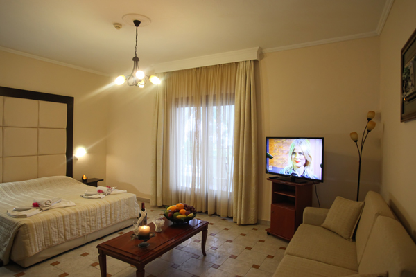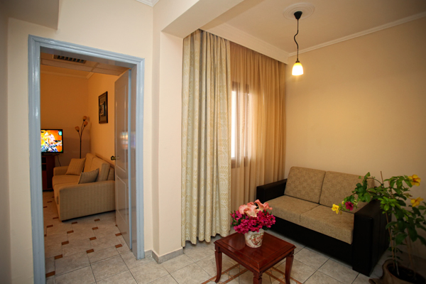 Suite (~50 m2) – 2 sobe: dnevna sa sofom i spavaća sa francuskim ležajem, kupatilo.