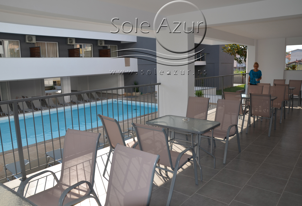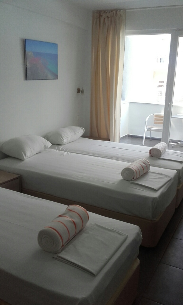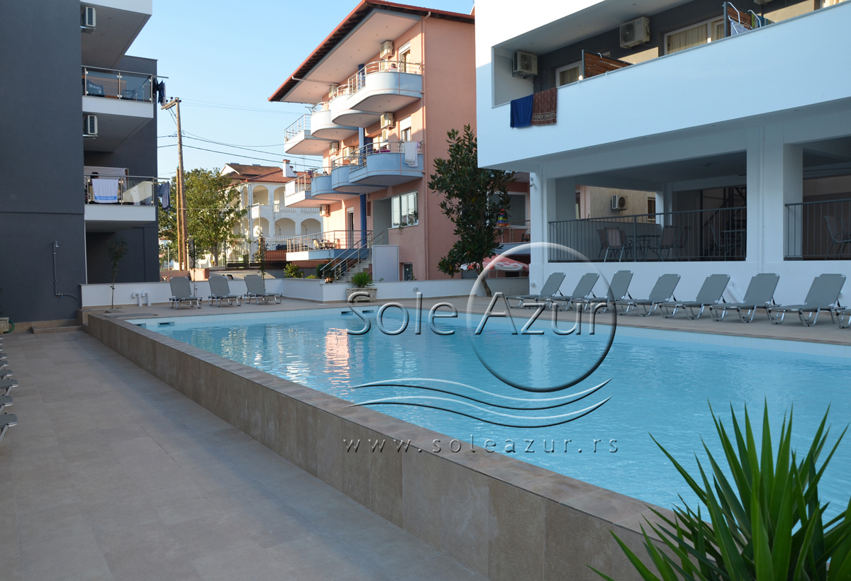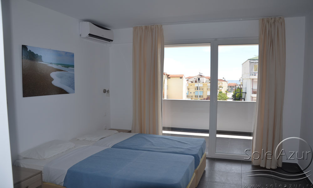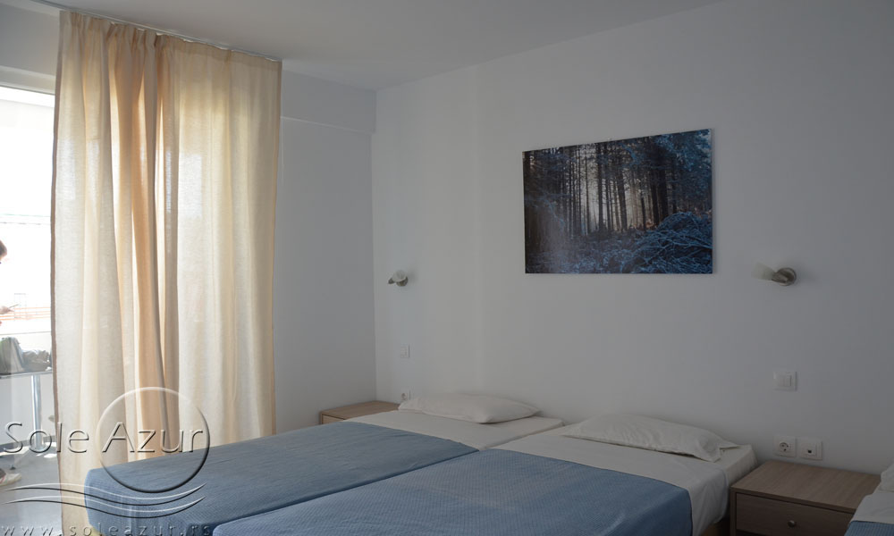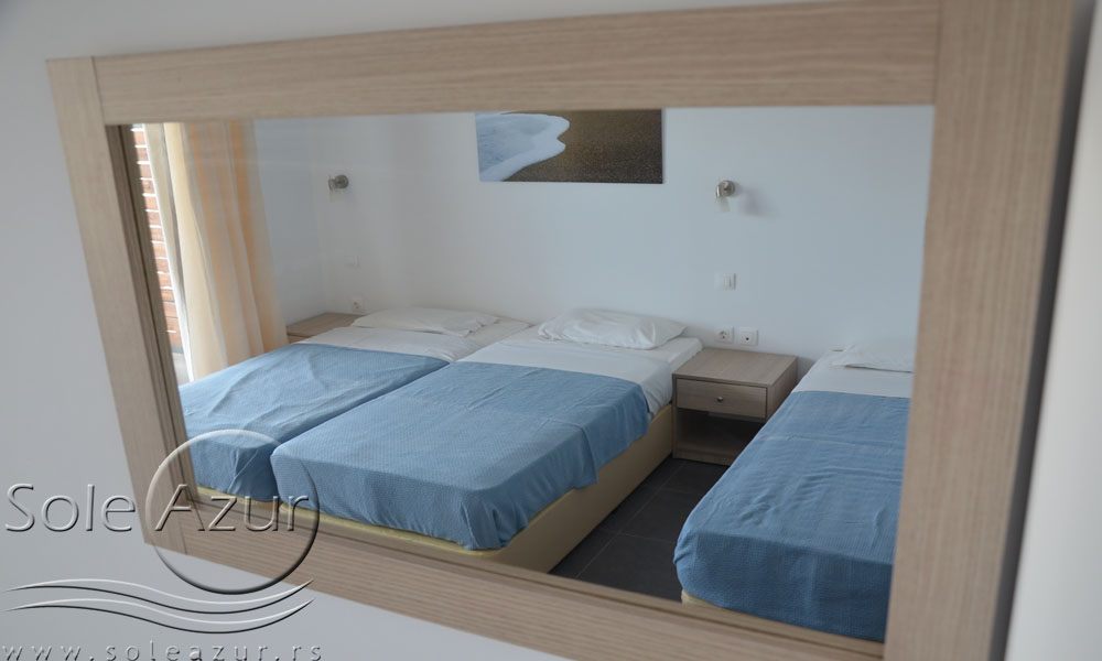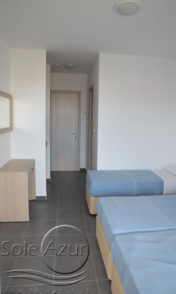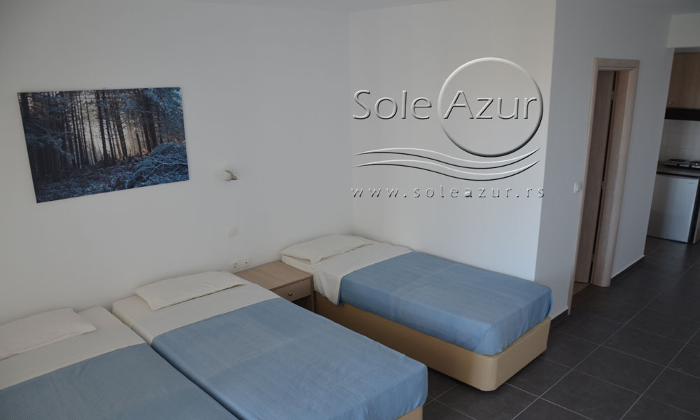 TROKREVETNI STUDIO: Trokrevetni studiji u svom sastavu poseduju ili tri singl standardna ležaja, ili francuski ležaj i jedan odvojeni singl ležaj, TV/KAT, ormar, noćni stočić, A/C (klima uređaj), BESPLATNU wi-fi internet konekciju, opremljenu kuhinju sa rešoom sa dve ringle, frižider. Kupatilo sa TUŠ/WC. Studiji su veoma komforni i svi studiji imaju izuzetno lepu terasu sa stolom i tri stolice, sa koje se pruža pogled na bazen i park.