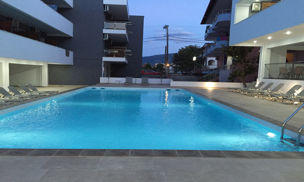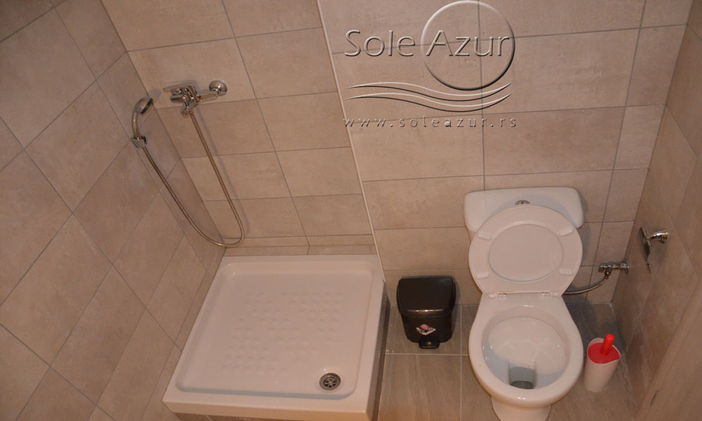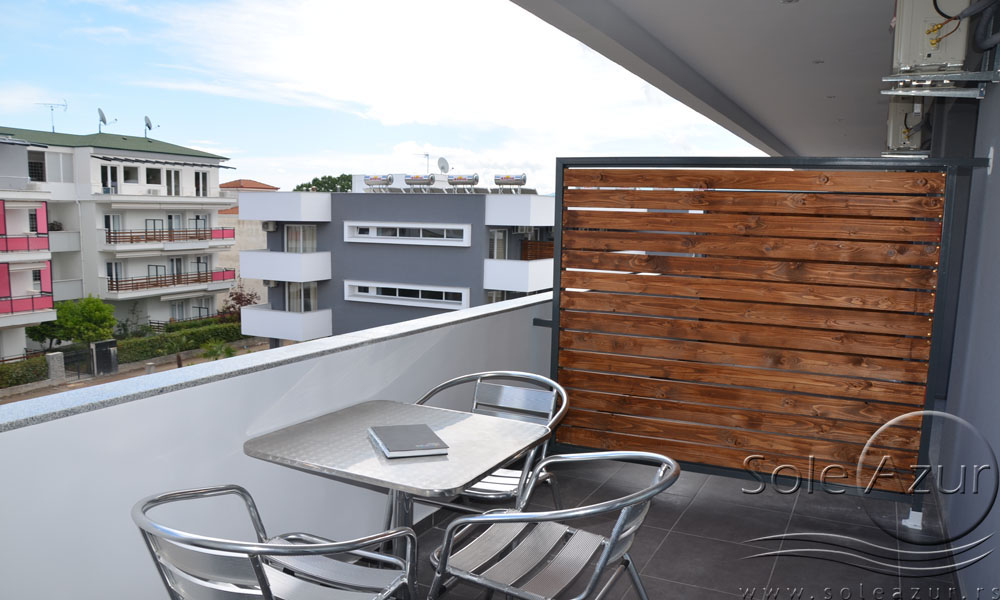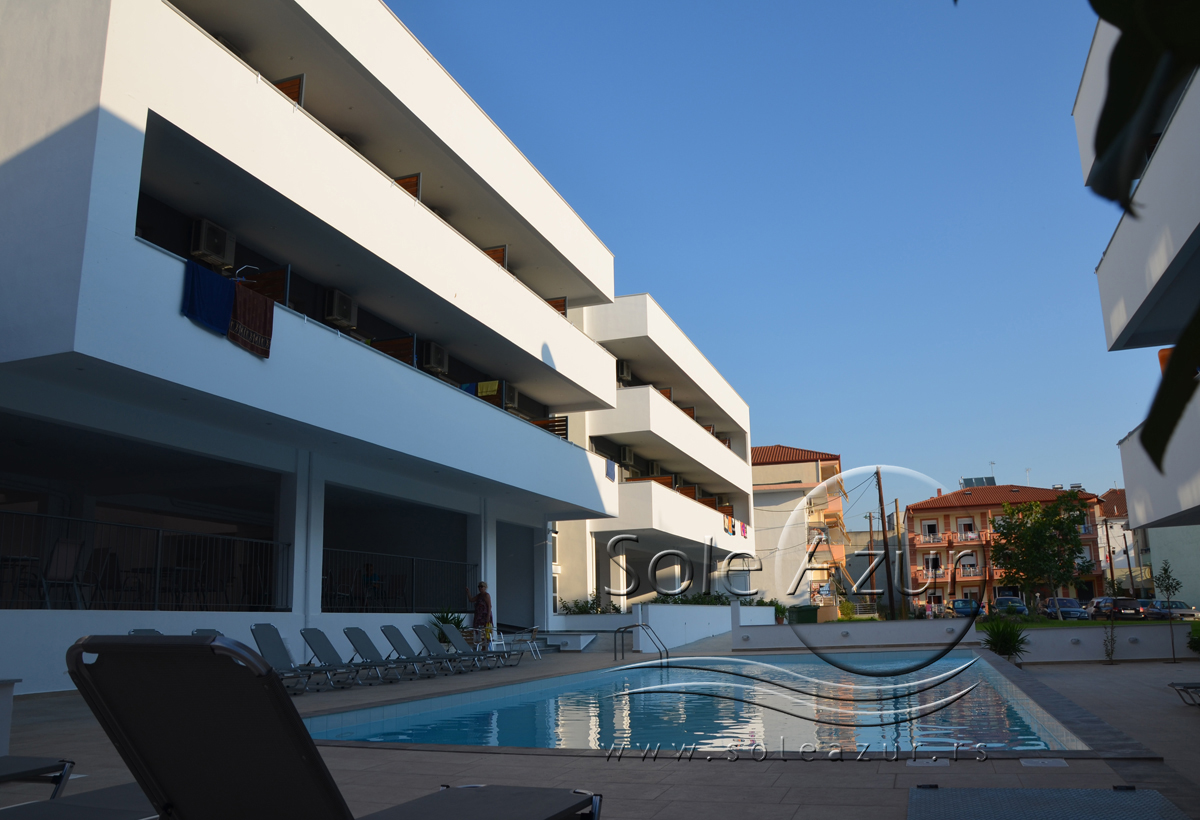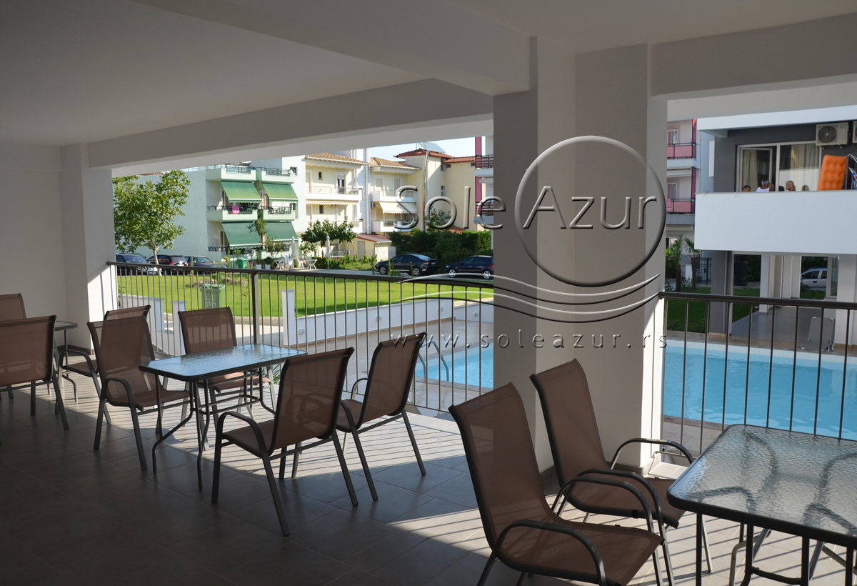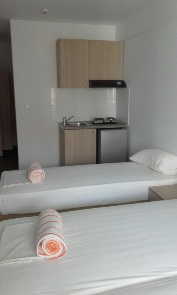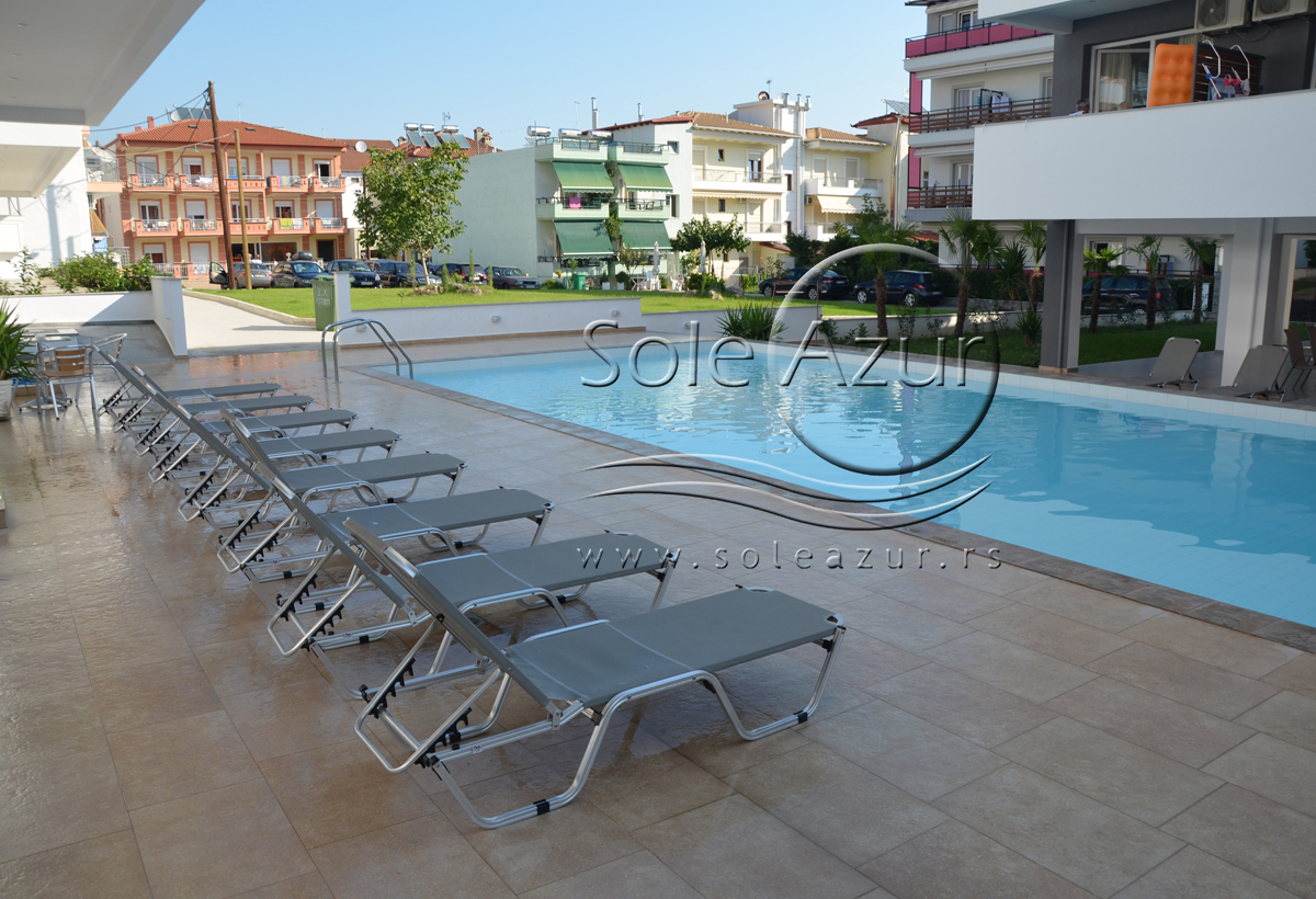 TROKREVETNI STUDIO: Trokrevetni studiji u svom sastavu poseduju ili tri singl standardna ležaja, ili francuski ležaj i jedan odvojeni singl ležaj, TV/KAT, ormar, noćni stočić, A/C (klima uređaj), BESPLATNU wi-fi internet konekciju, opremljenu kuhinju sa rešoom sa dve ringle, frižider. Kupatilo sa TUŠ/WC. Studiji su veoma komforni i svi studiji imaju izuzetno lepu terasu sa stolom i tri stolice, sa koje se pruža pogled na bazen i park.