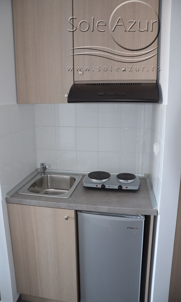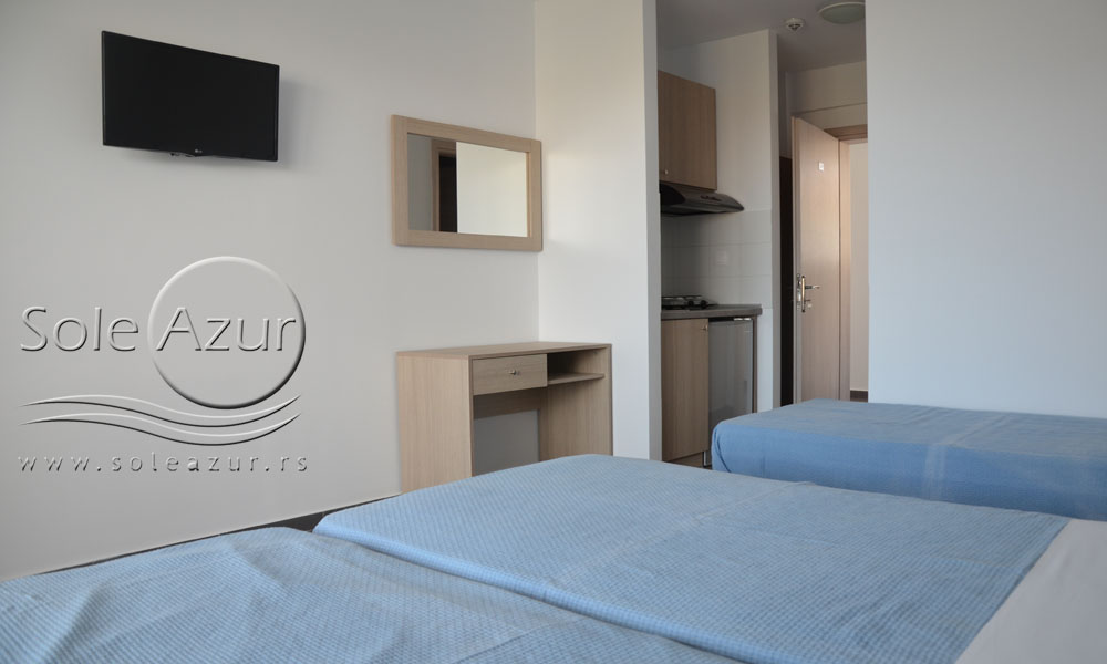 DVOKREVETNI STUDIO - poseduje ili dva standard ležaja ili francuski ležaj, TV/KAT, ormar, noćni stočić, A/C (klima uređaj), BESPLATNU wi-fi internet konekciju, opremljenu kuhinju sa rešoom sa dve ringle, frižider. Kupatilo sa TUŠ/WC, Stidiji su veoma komforni i svi studiji imaju izuzetno lepu terasu sa stolom i dve stolice, sa koje se pruža pogled na bazen i park.