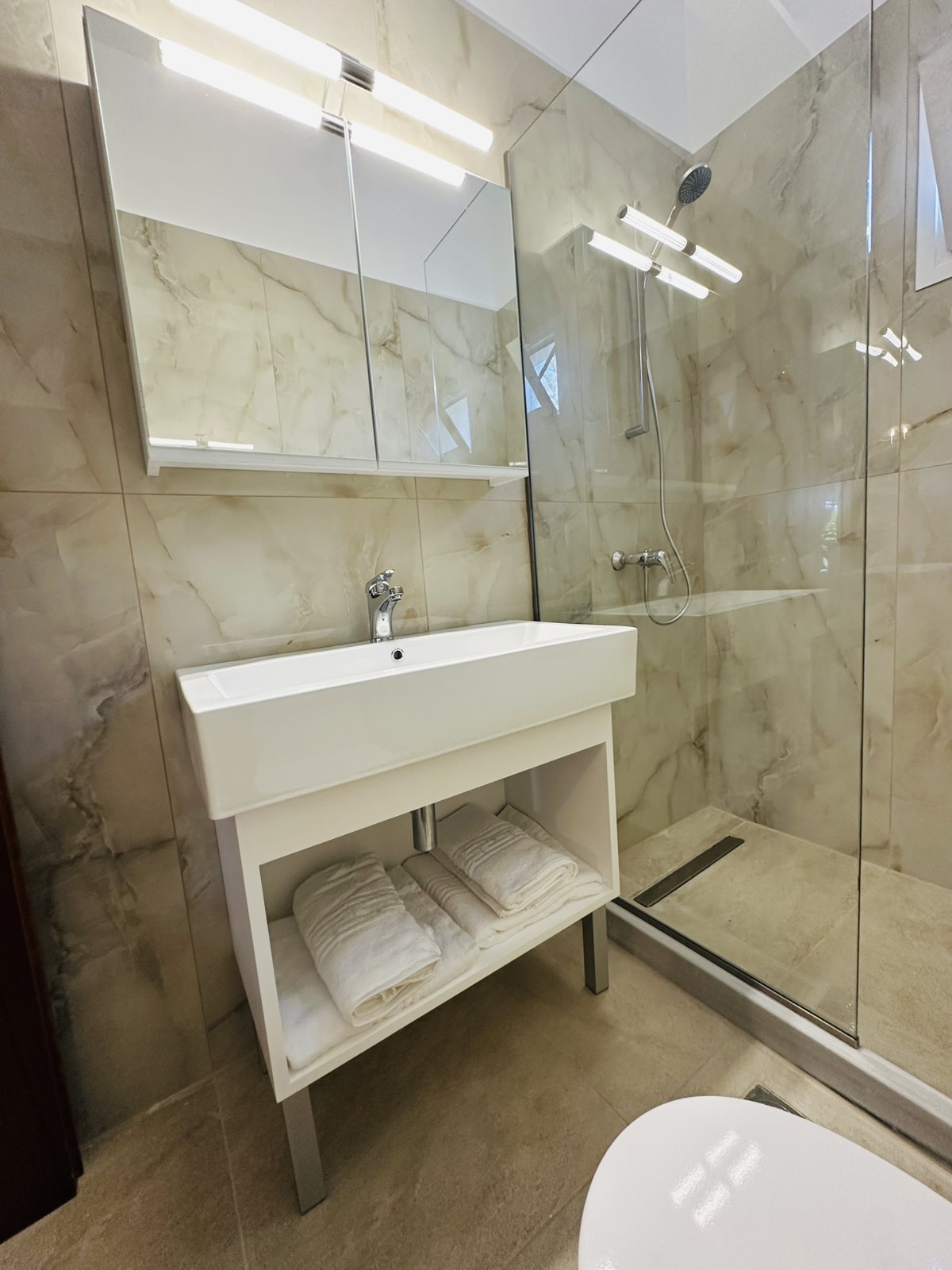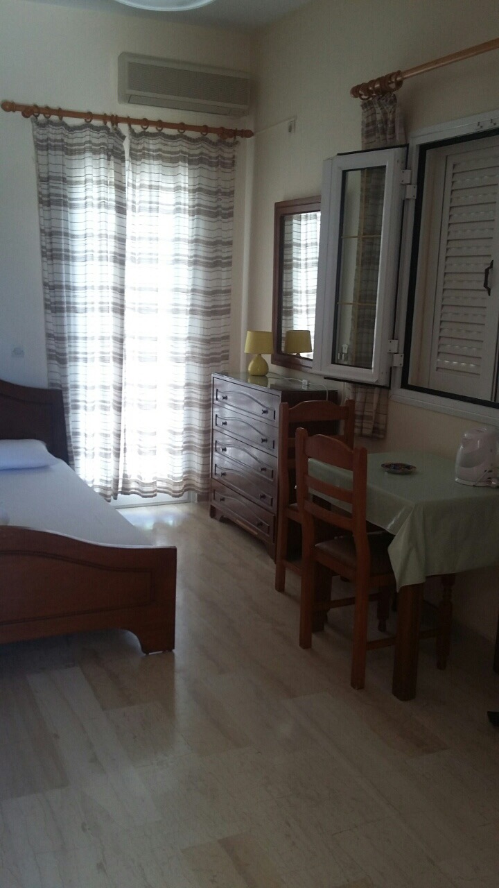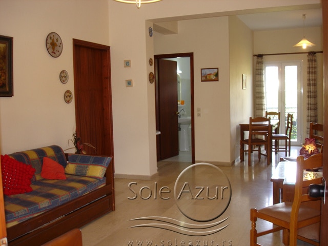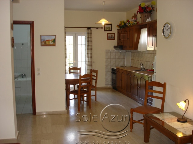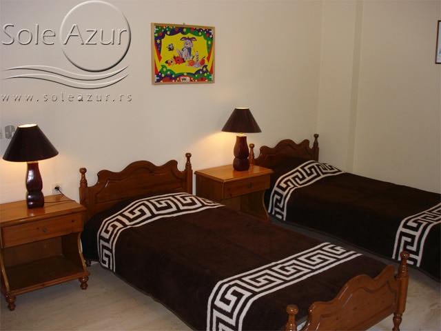 TROKREVETNI APARTMAN / APARTMAN 1/3+1: Apartmani se sastoje od spavaće sobe u kojoj se nalazi ili francuski ležaj dimenzija 190x145cm ili dva singl standardna spojena ležaja dimenzija 190x80cm, TV/KAT, noćni stočić i ormar. U drugoj prostoriji se nalazi kuhinja sa posuđem za tri-četiri osobe, rešo sa dve ringle (mala i velika), frižider. Takođe, tu se nalazi ležaj dimenzija 185x80 cm, a kod app 1/3+1 se nalazi ležaj 185x80 cm iz kog se izvlači jos jedan ležaj dimenzija 185x80. Apartman poseduje kupatilo sa TUŠ/WC, kao i klima uređaj. Apartman poseduje terasu sa garniturom za sedenje.