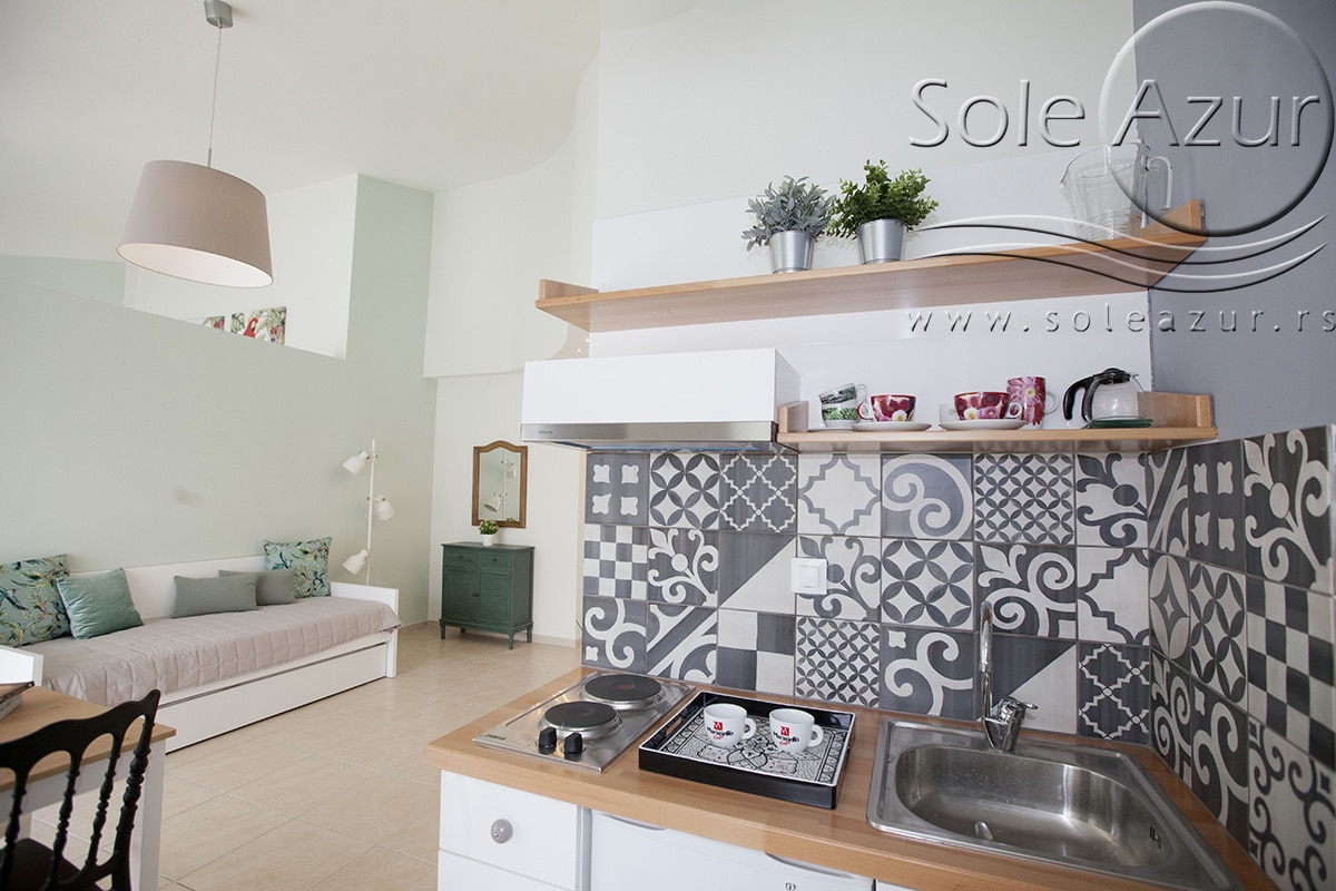TROKREVETNI i ČETVOROKREVETNI STUDIO (2 sprat): trokrevetni i četvorokrevetni studio u svom sastavu poseduju jedan francuski ležaj (dimenzija 200x160cm), prostor za odlaganje stvari (pitati u agenciji), manji ormar, TV, klima uređaj, sofu za sedenje, koja je ujedno i ležaj za treću osobu (dimenzija 190x80cm). Iz sofe se izvlači još jedan ležaj (dimenzija 185x75cm), tako da mogu da spavaju četiri osobe. U sklopu prostorije se nalazi kuhinja, koja je u potpunosti opremljena posuđem za tri/četiri osobe. Poseduje i frižider, šporet sa dve ringle, aspirator. Kupatilo je veliko i sadrži zastakljenu tuš kabinu. Studio poseduje terasu sa stolom i četiri stolice, ali zbog svoje specifičnosti naglasavamo da terasa nema pogled, jer su zidovi sa tri strane, ali postoji i tenda koja zaklanja sunce po potrebi.