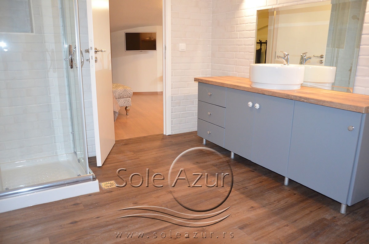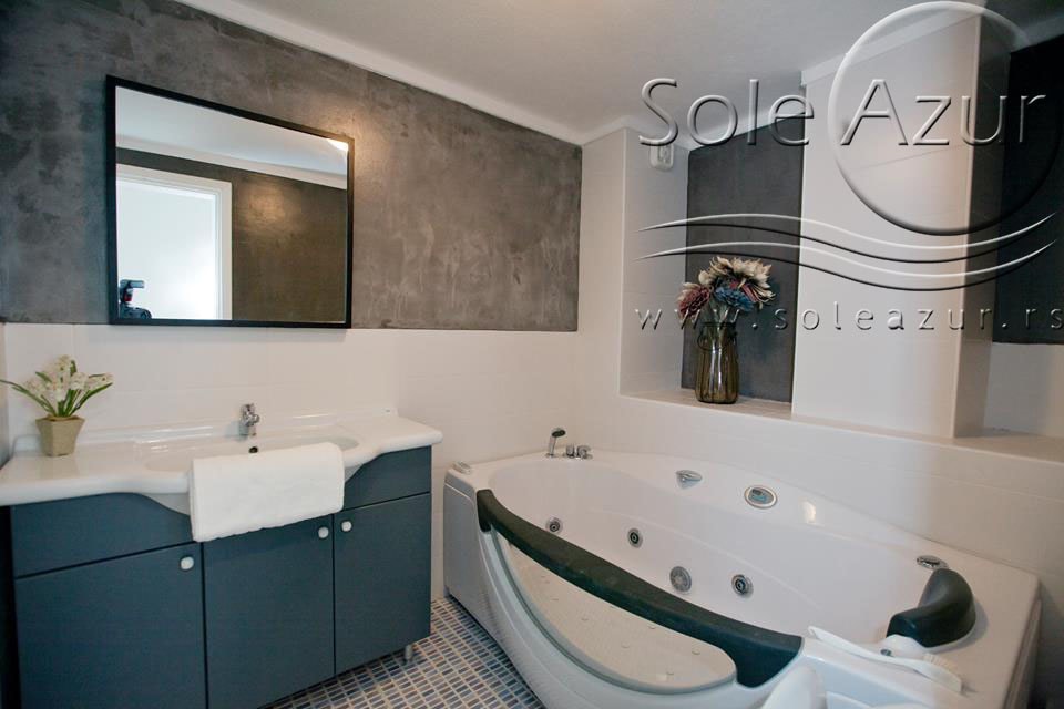 PETOKREVETNI i ŠESTOKREVETNI APARTMANI (1 sprat): Petokrevetni i šestokrevetni apartmani se poseduju jednu spavaću sobu ima francuski ležaj (dimenzija 200x160cm), dva noćna stočića, klima uređaj, noćni sto sa ogledalom. Ova spavaća jedinica je potpuno zasebna. Druga spavaća soba je od dnevnog boravka odvojena zidom do visine vrata, i „kaubojskim vratima“. U drugoj spavaćoj sobi se takodje nalazi francuski ležaj (dimenzija 200x160cm), noćni sto sa ogledalom, ormar, drugi klima uređaj i dva mala noćna stočića pored kreveta. Dosta prostrana soba. Treća prostorija je dnevni boravak, koji u svom sastavu ima sofa krevet (dimenzija 190x80cm) iz kojeg se izvlači još jedan krevet (dimenzija 185x75cm). U dnevnom boravku se pored sofe nalazi i kuhinja sa trpezarijom. Kuhinja se sastoji od resoa sa dve ringle, frizidera i aspiratora, kao i pribora za ručavanje za šest osoba. U prostoriji je takođe i trpezarijski sto. U dnevnom boravku je i TV uređaj. Kupatilo je veoma prostrano i poseduje zatvorenu tuš kabinu. Na terasu se izlazi iz dnevnog boravka, i ima pogled ka susednoj zgradi i hotelu. Terase su uske i manjih su dimenzija, Topla preporuka za putnike sa ukusom.