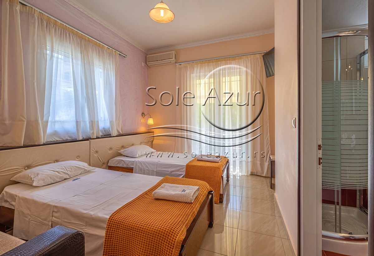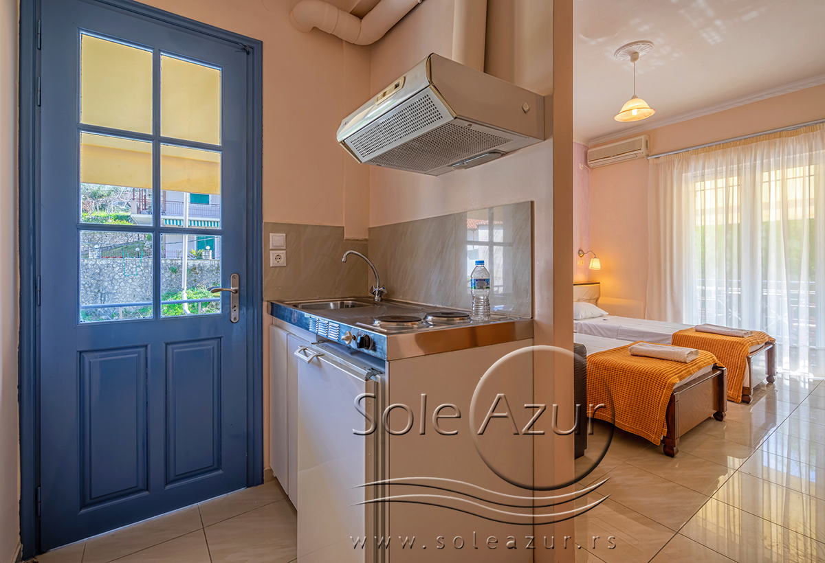 DVOKREVETNI STUDIO: Dvokrevetni studio se sastoji od jednog francuskog ležaja ili dva singl standardna ležaja, dva noćna stočića pored kreveta, dve lampe, TV, klima uređaj, ormar. Kuhinja se sastoji od šporeta sa dve ringle, frižidera, aspiratora i neophodnog posuđa za dve osobe. Kupatilo je moderno i prostrano i u svom sastavu sadrži tuš kabinu. Na terasu se izlazi iz spavaće sobe. Terasa je takođe prostrana i sastoji se od stola sa dve stolice. Smeštajne jedinice u vili George su prostrane i posebna pažnja se poklanja na čistoću.