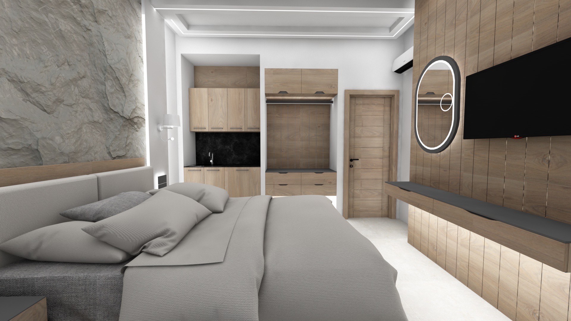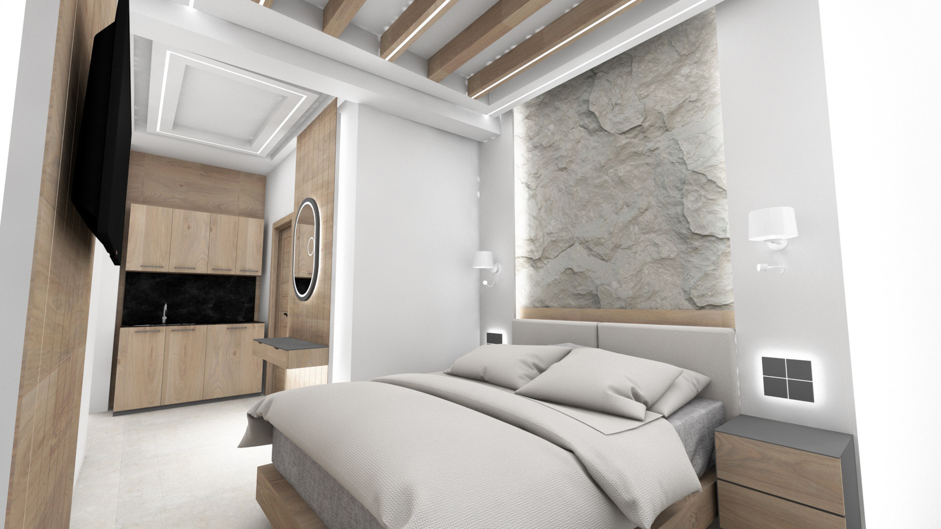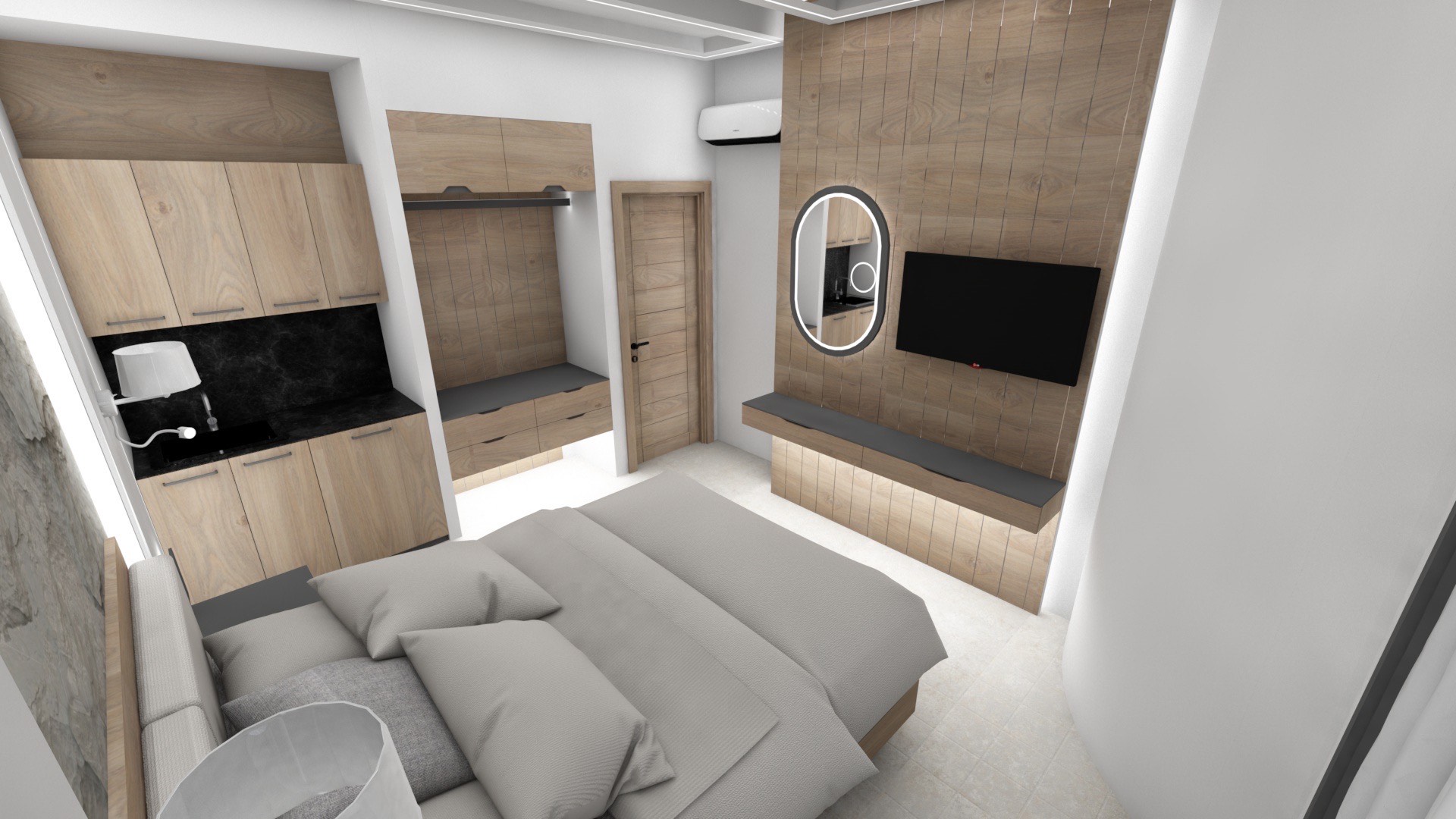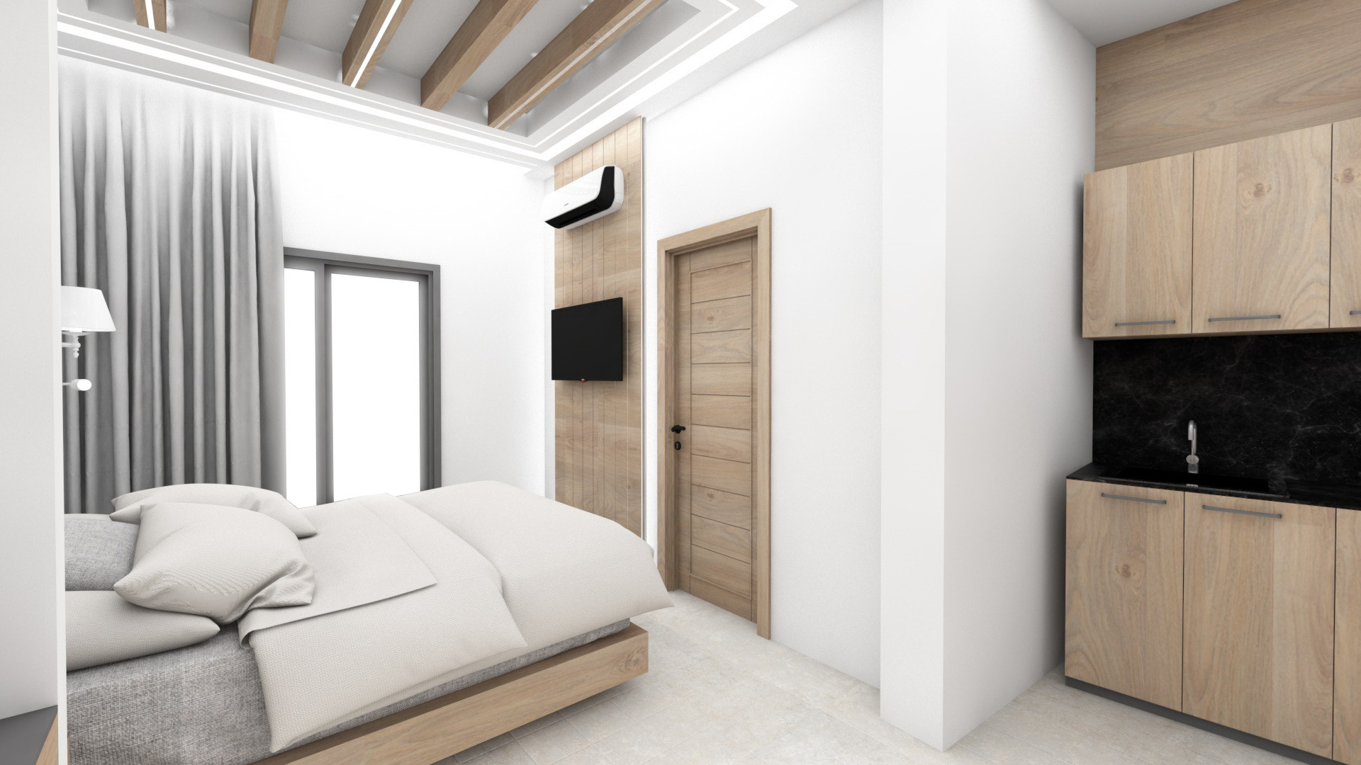DVOKREVETNI STUDIJI: Studiji se nalaze na prvom i drugom spratu i sastoje se od francuskog ležaja dimenzija 200x140cm ili dva standardna sing ležaja, TV/KAT, klima uređaj (korišćenje je besplatno), noćni stočić, orman, kao i kuhinjski deo koji je u potpunosti opremljen sa posuđem, rešo sa dve ringle, frižider, aspirator. Kupatila imaju tuš/wc.