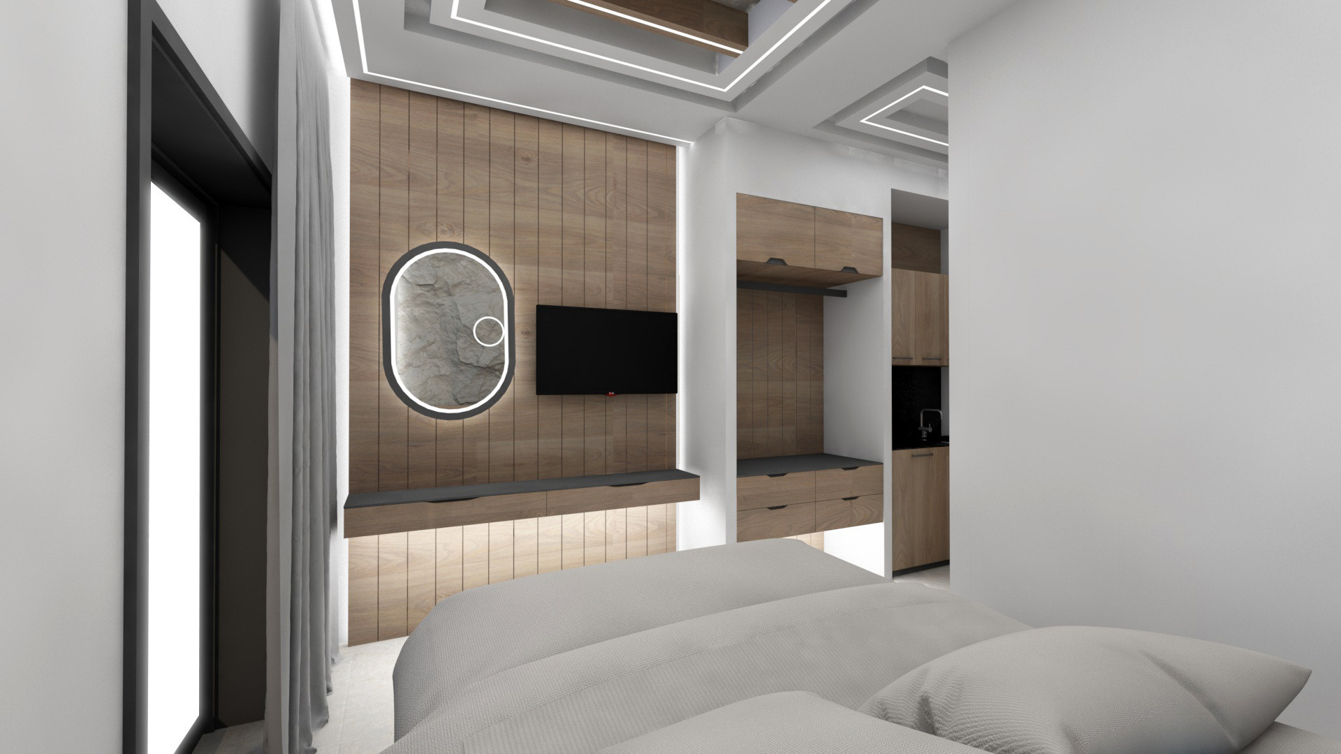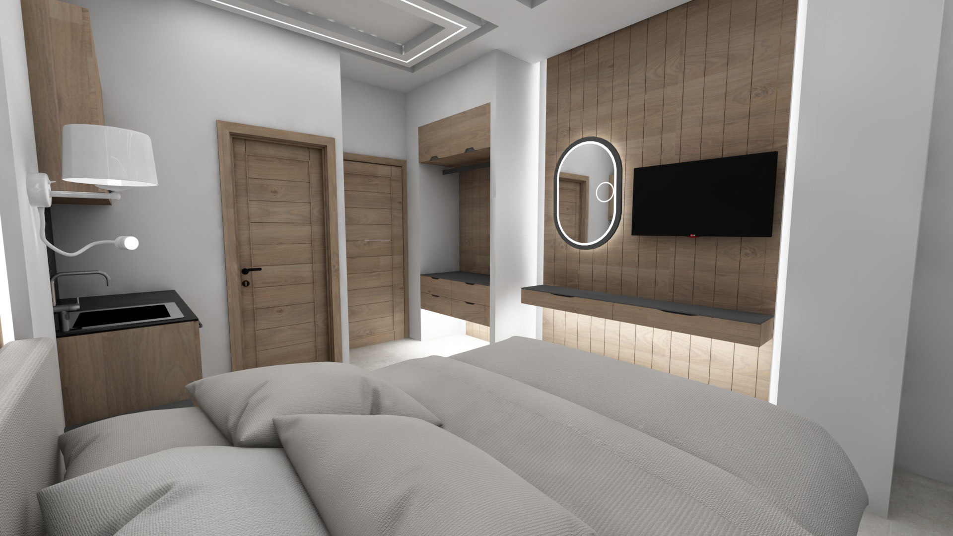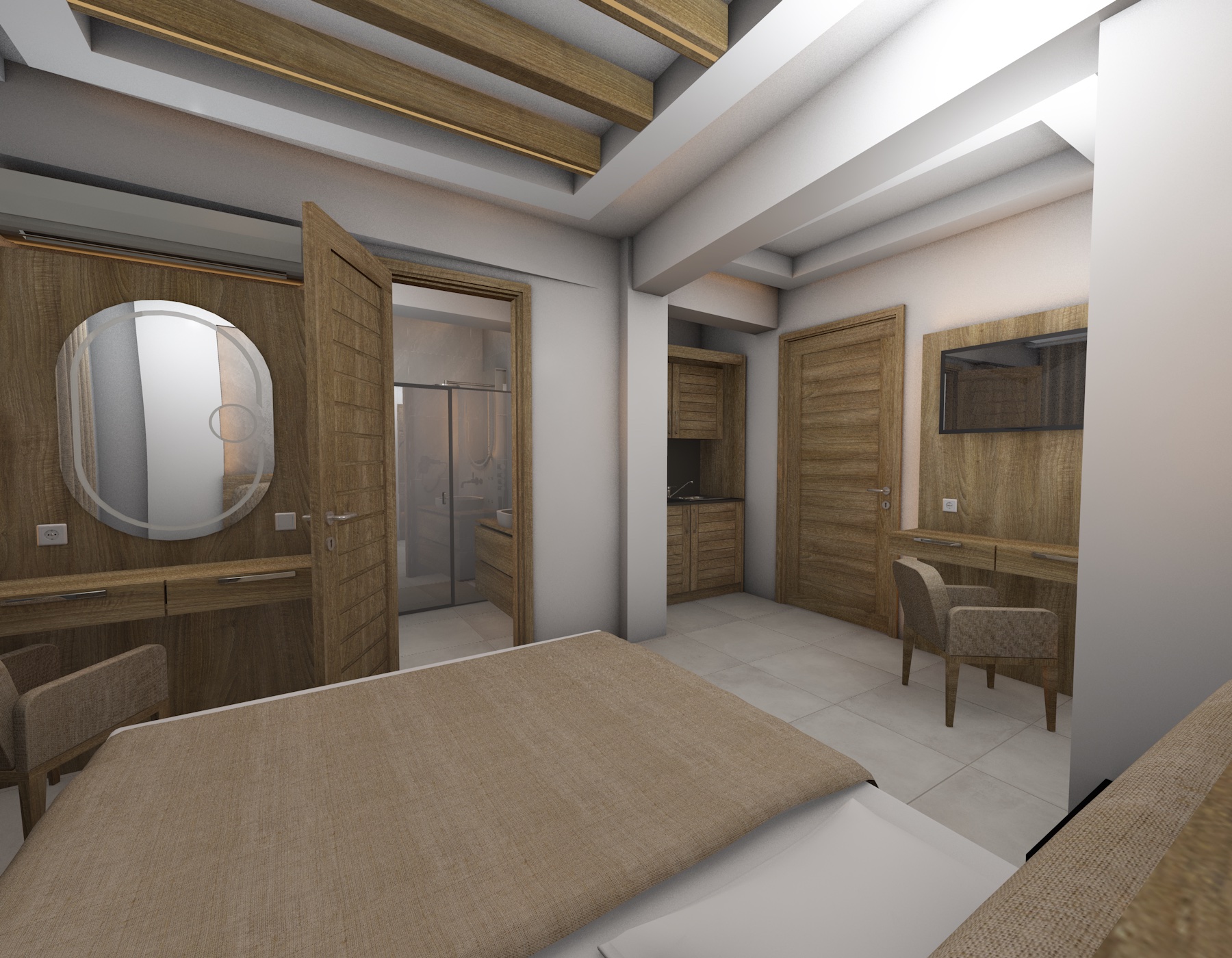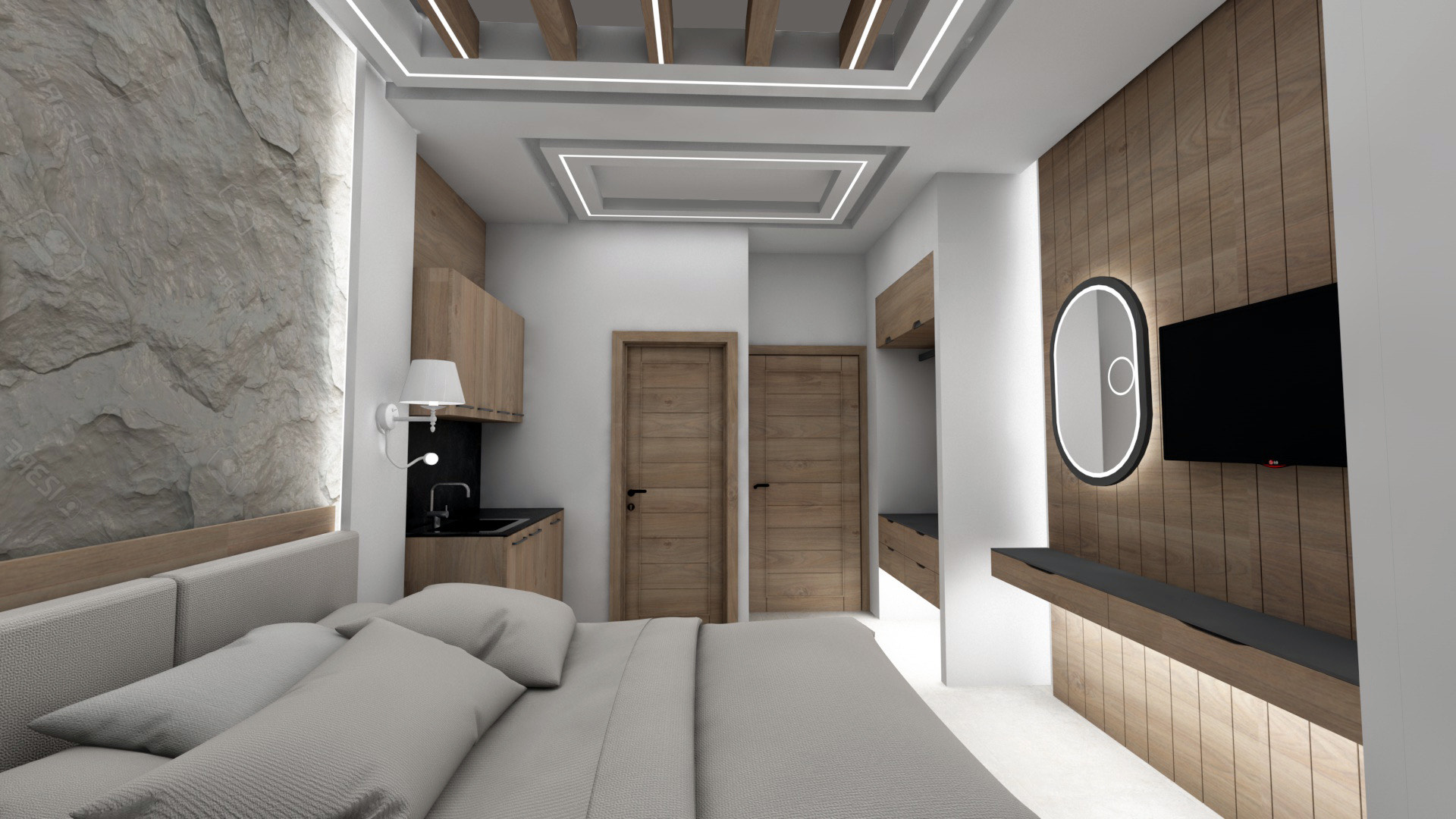DVOKREVETNI STUDIJI: Studiji se nalaze na prvom i drugom spratu i sastoje se od francuskog ležaja dimenzija 200x140cm ili dva standardna sing ležaja, TV/KAT, klima uređaj (korišćenje je besplatno), noćni stočić, orman, kao i kuhinjski deo koji je u potpunosti opremljen sa posuđem, rešo sa dve ringle, frižider, aspirator. Kupatila imaju tuš/wc.
