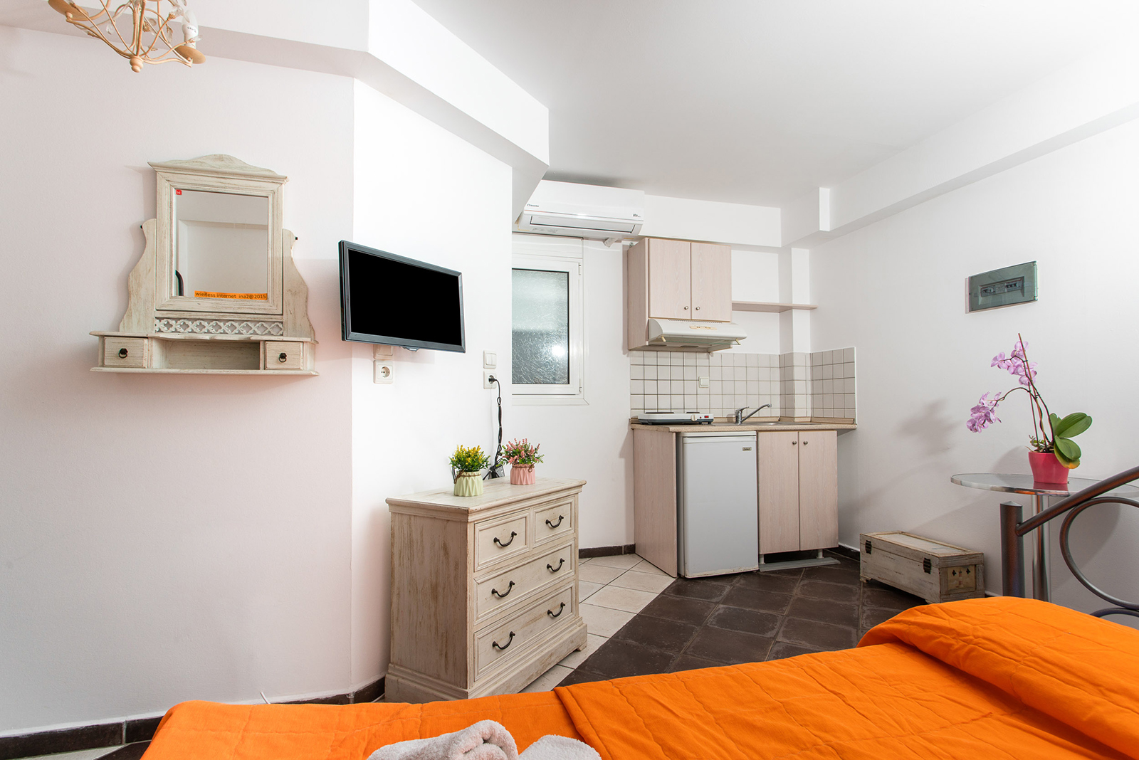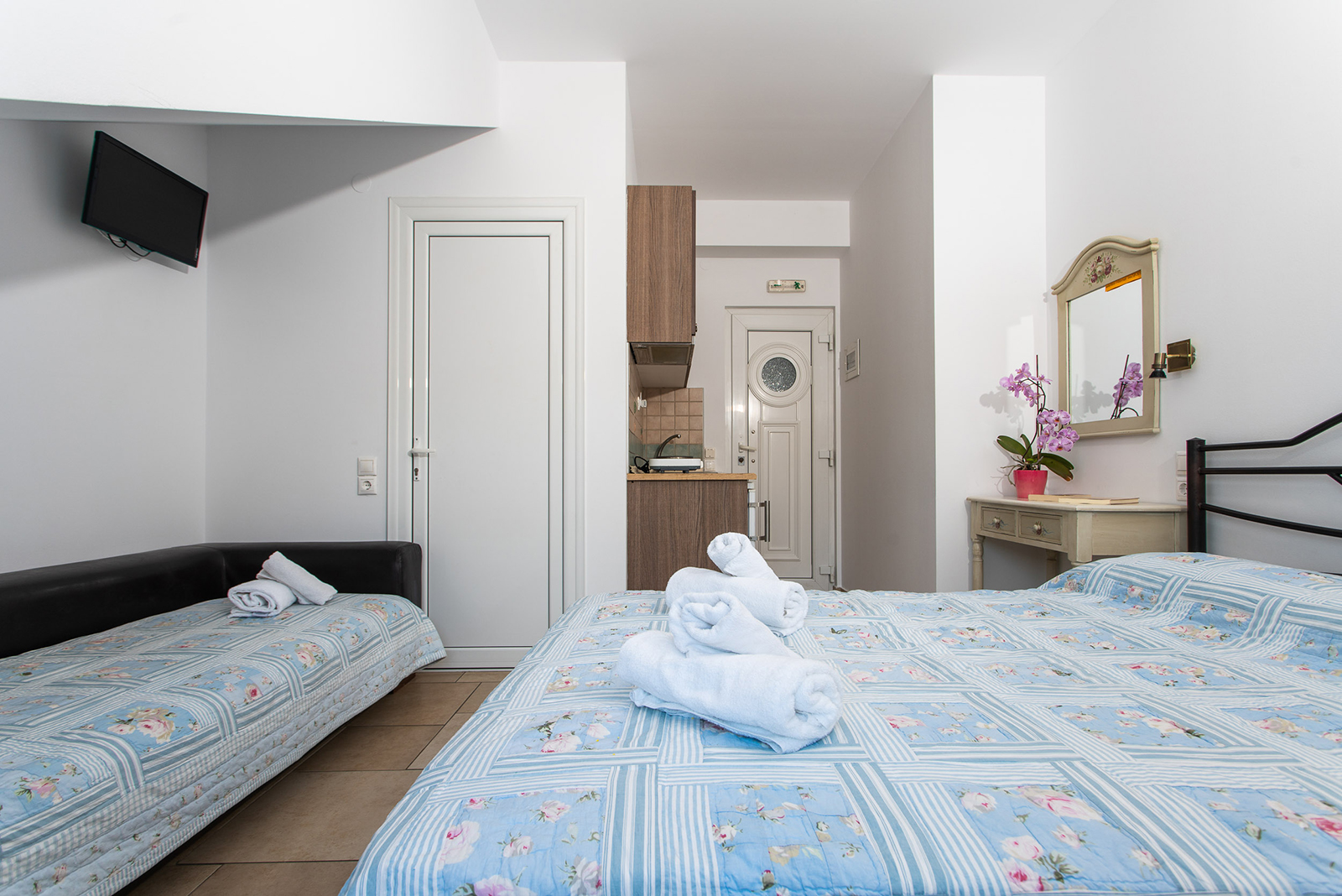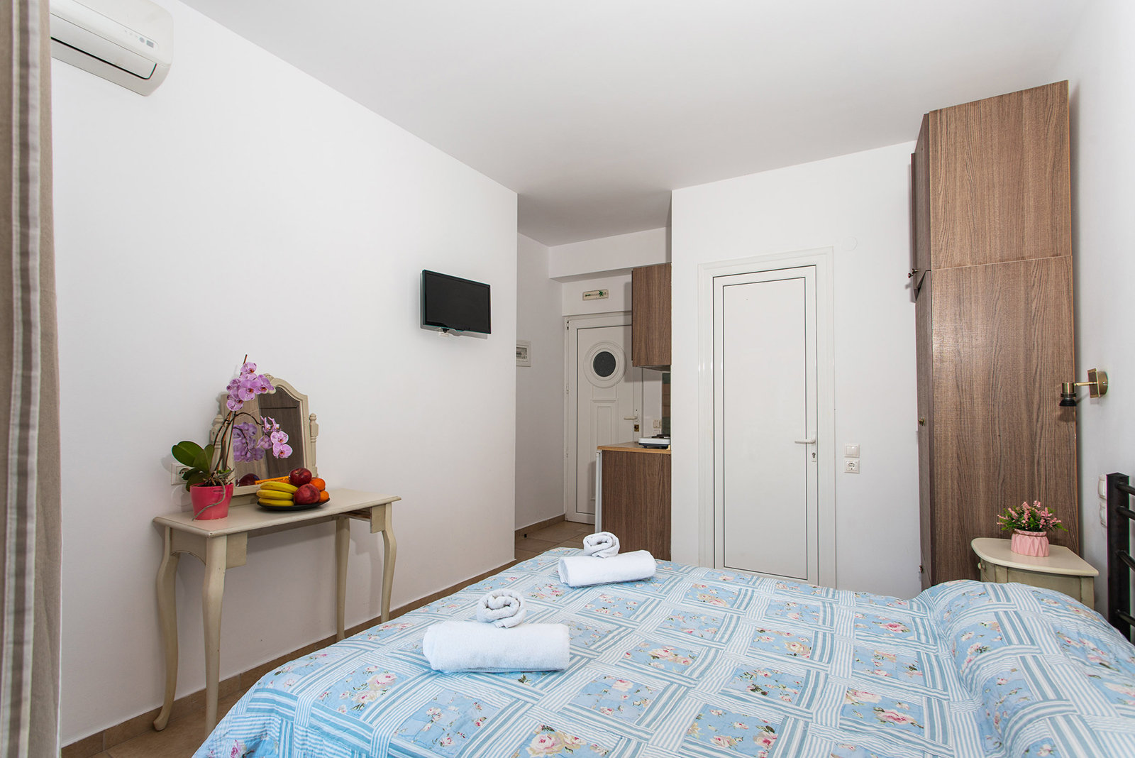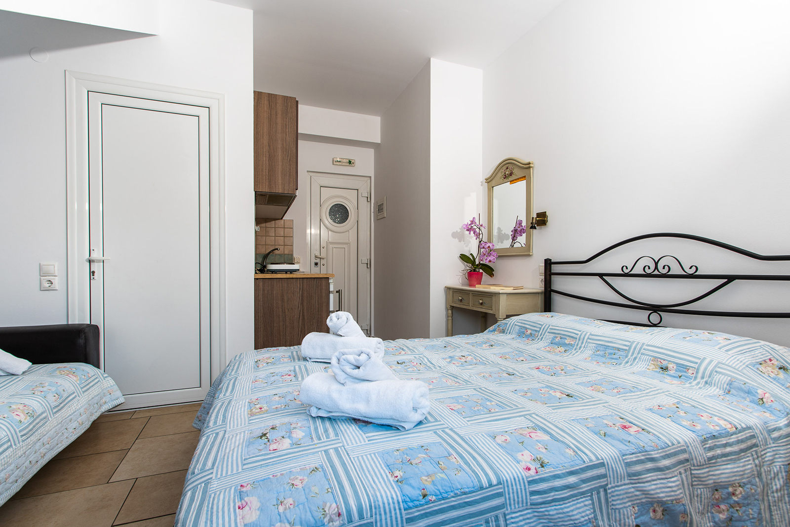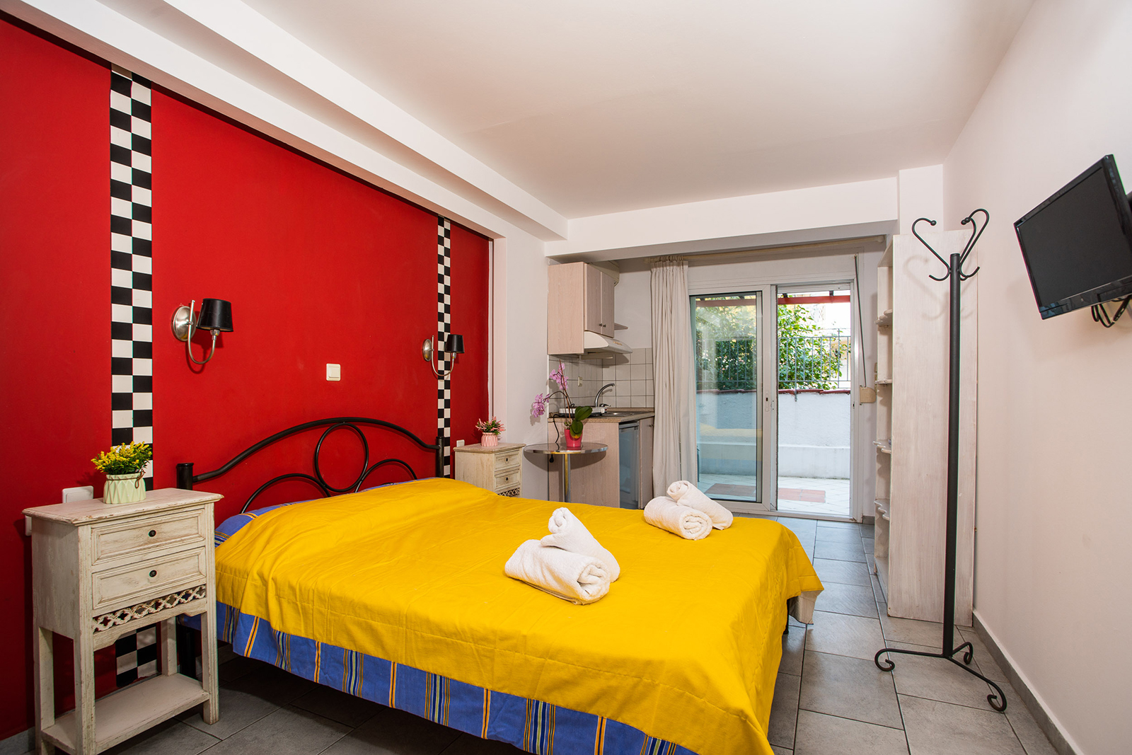 TROKREVETNI STUDIJI: Studiji se nalaze u dvorišnom delu kuće, ili u prizemlju, sastoje se od francuskog ležaja i još jednog ležaja ili fotelje na razvlačenje, TV/KAT, klima uređaj (korišćenje je besplatno), noćni stočić, orman, kao i kuhinjski deo koji je u potpunosti opremljen sa posuđem, rešo sa dve ringle, frižider, aspirator. Kupatila su sa ukusom napravljena i imaju tuš/wc.