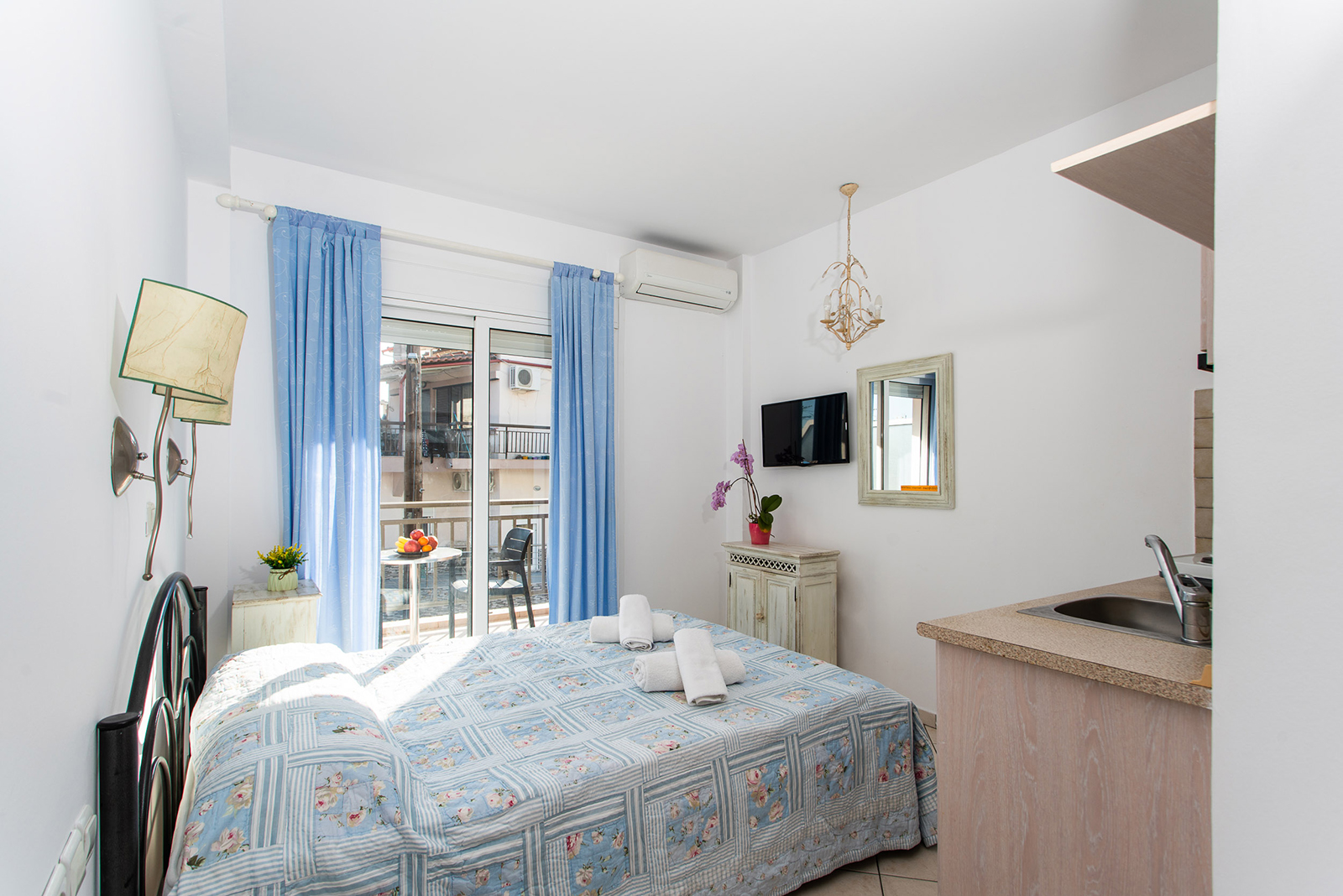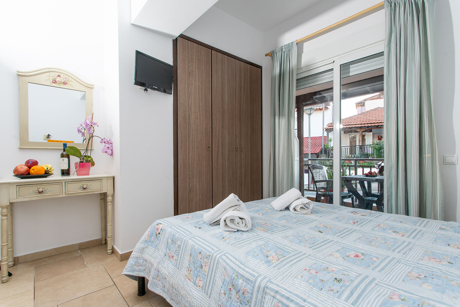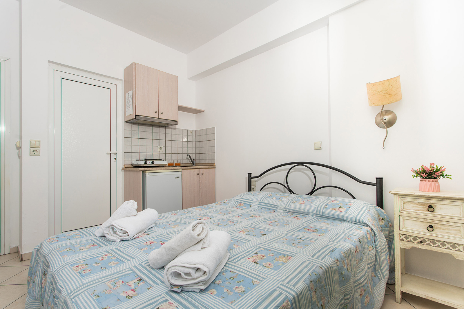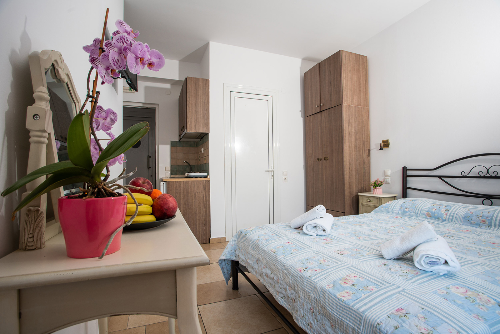 TROKREVETNI STUDIJI: Studiji se nalaze u dvorišnom delu kuće, ili u prizemlju, sastoje se od francuskog ležaja i još jednog ležaja ili fotelje na razvlačenje, TV/KAT, klima uređaj (korišćenje je besplatno), noćni stočić, orman, kao i kuhinjski deo koji je u potpunosti opremljen sa posuđem, rešo sa dve ringle, frižider, aspirator. Kupatila su sa ukusom napravljena i imaju tuš/wc.