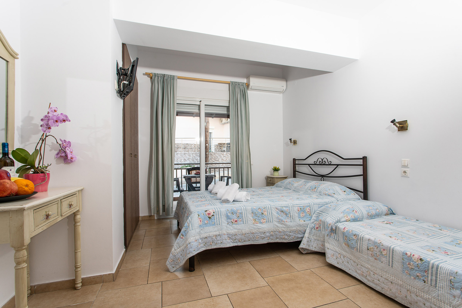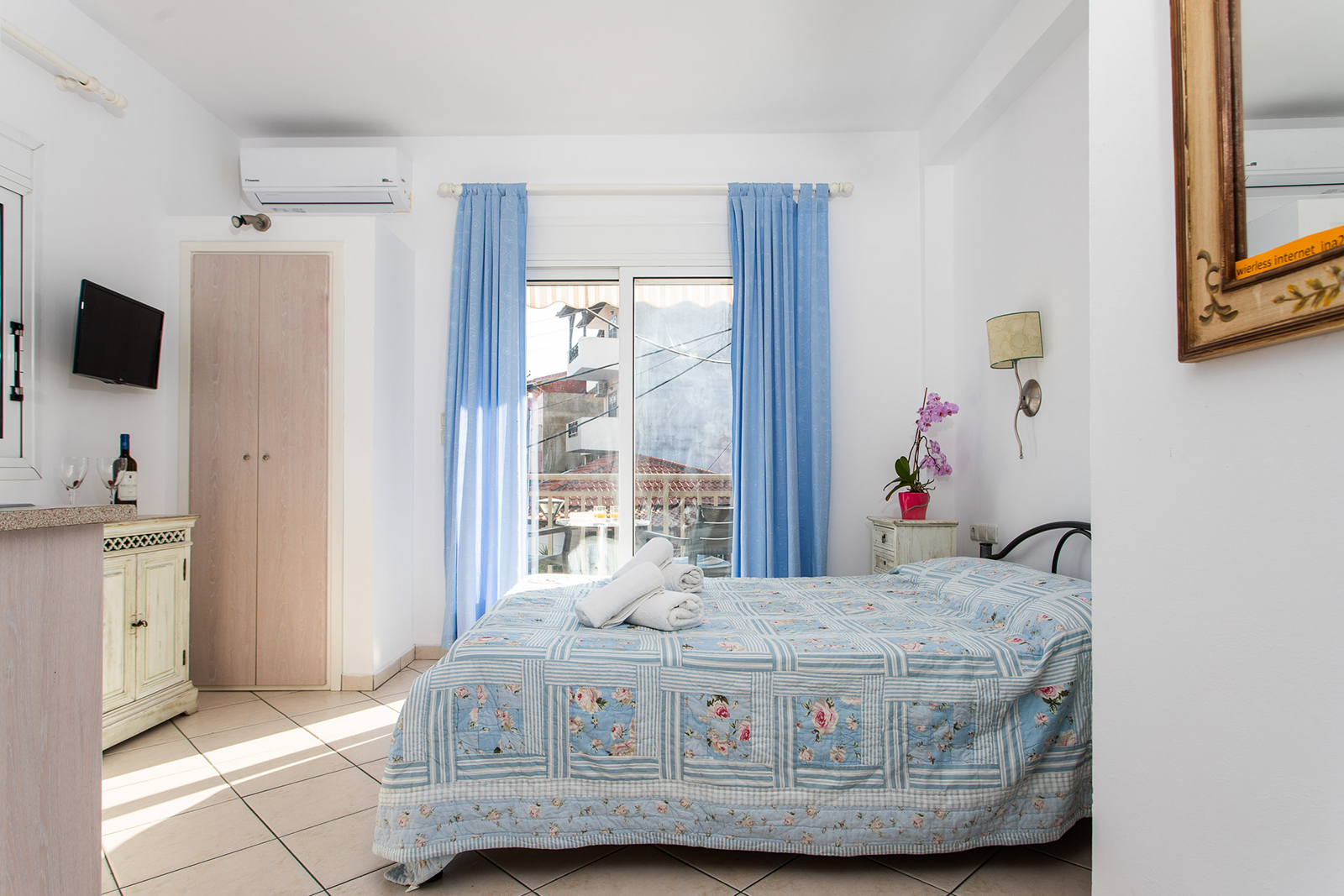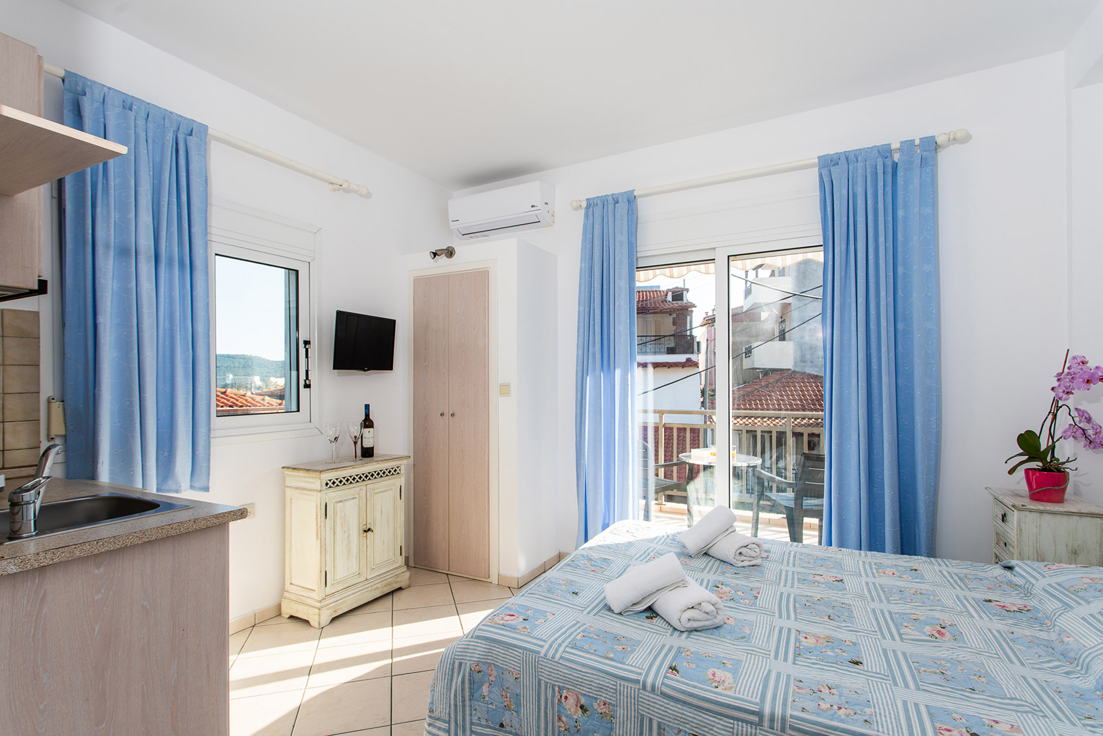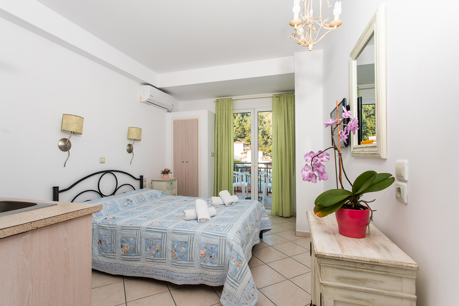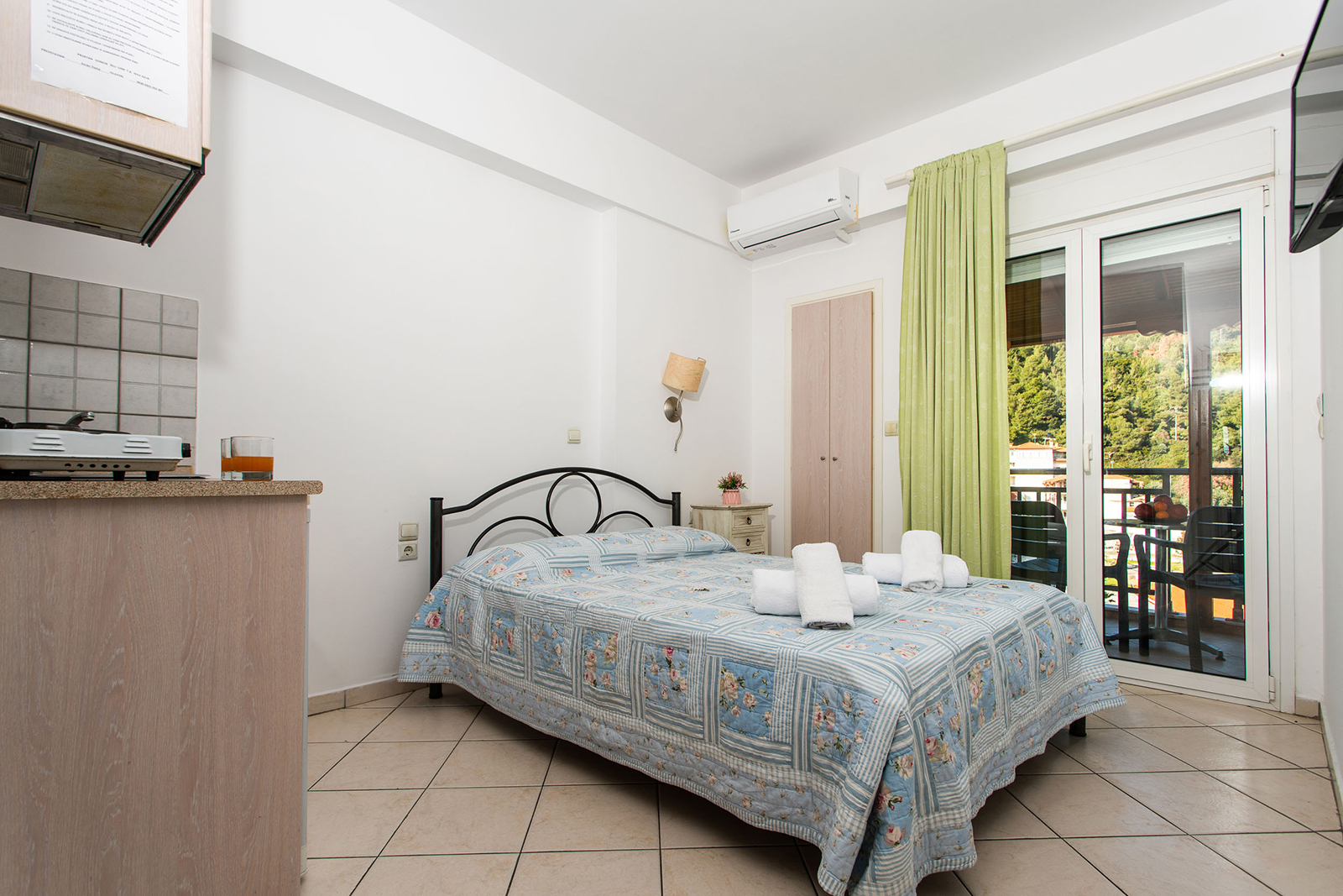 TROKREVETNI STUDIJI: Studiji se nalaze u dvorišnom delu kuće, ili u prizemlju, sastoje se od francuskog ležaja i još jednog ležaja ili fotelje na razvlačenje, TV/KAT, klima uređaj (korišćenje je besplatno), noćni stočić, orman, kao i kuhinjski deo koji je u potpunosti opremljen sa posuđem, rešo sa dve ringle, frižider, aspirator. Kupatila su sa ukusom napravljena i imaju tuš/wc.