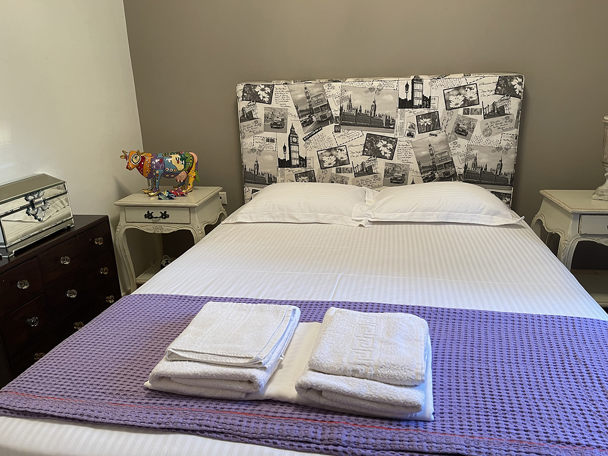 U spavaćoj sobi se nalazi francuski ležaj, dve natkasne pored kreveta i komoda.