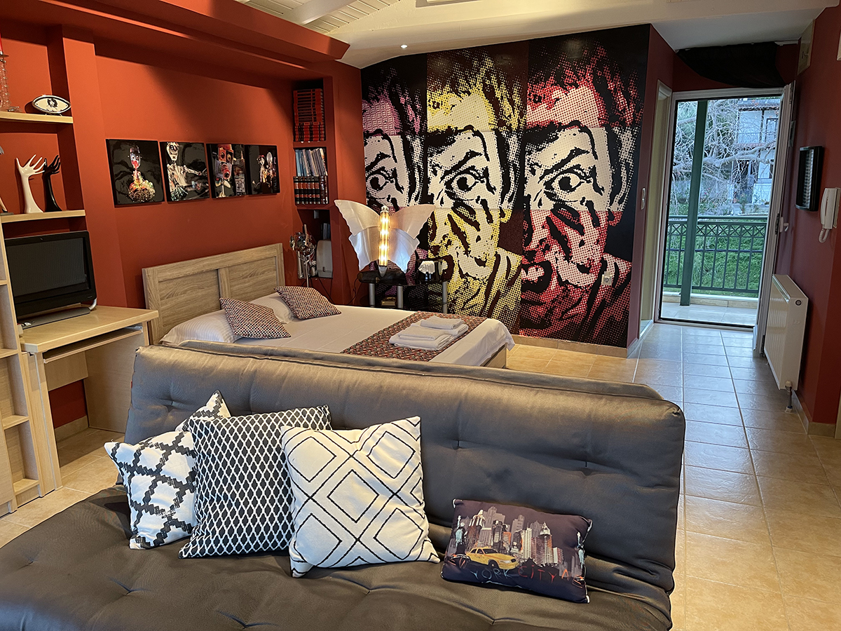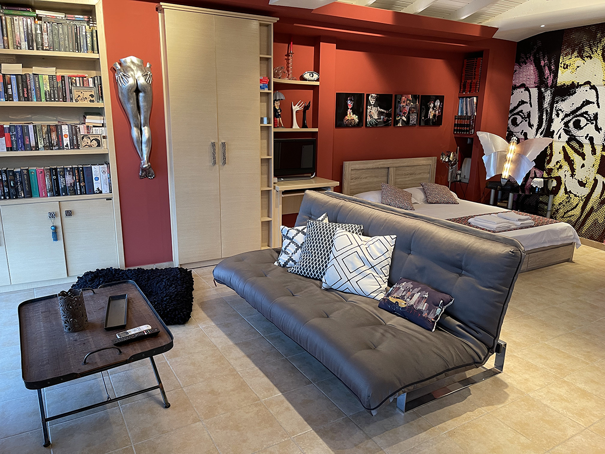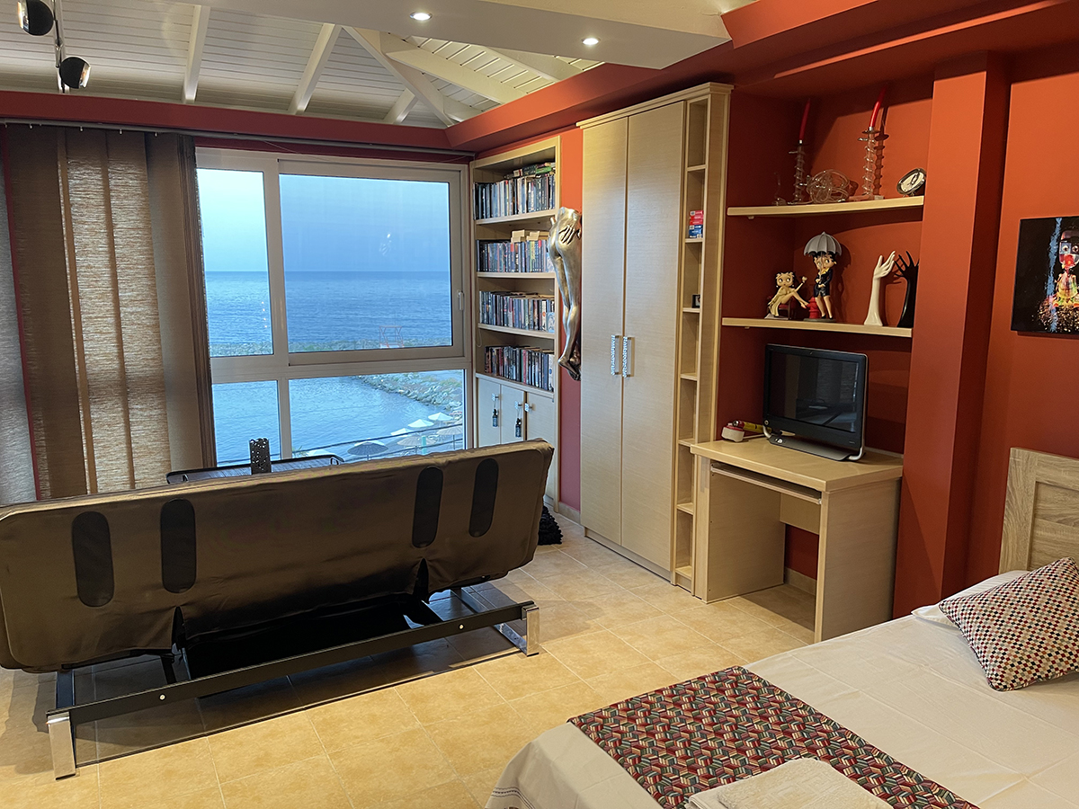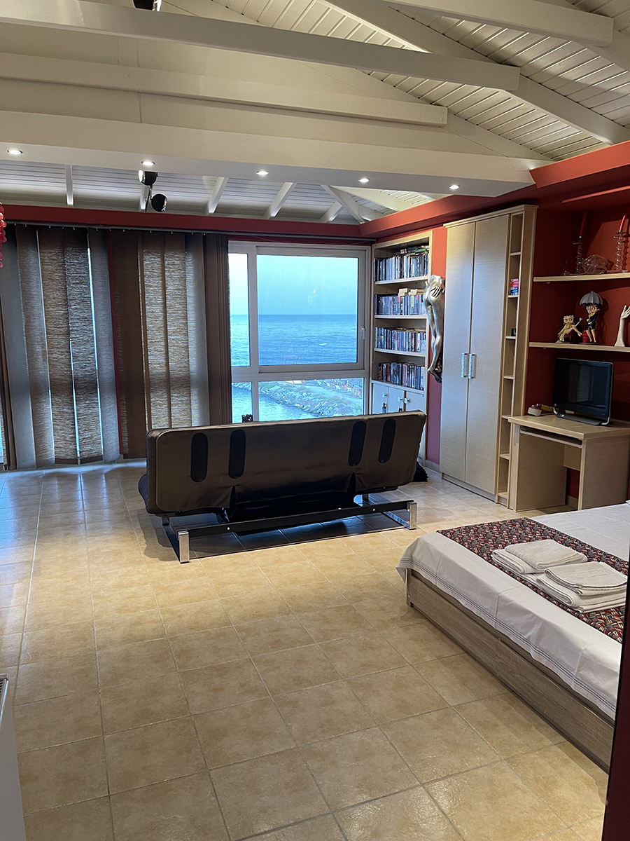 1/3+1 studio se nalazi na trećem spratu i sastoji se od velikog studija (open space), u kome se nalazi bračni krevet, jedna sofa na razvlačenje, kuhinjom sa frižiderom, šporetom sa ravnom pločom, rernom, posuđem, kao i TV, sto za ručavanje, ormari... Ono što je značajno i posebno u ovoj smeštajnom objektu je strana koja gleda na more, a koja je od poda do plafona od stakla, tako da gostima pruža mogučnost pogleda na more i iz kreveta, a tokom celog dana možete uživati takođe na prelepom pogledu na more. U sklopu se takođe nalazi i terasa koja je na zadnjoj strani i gleda na šumu i parking za automobile..