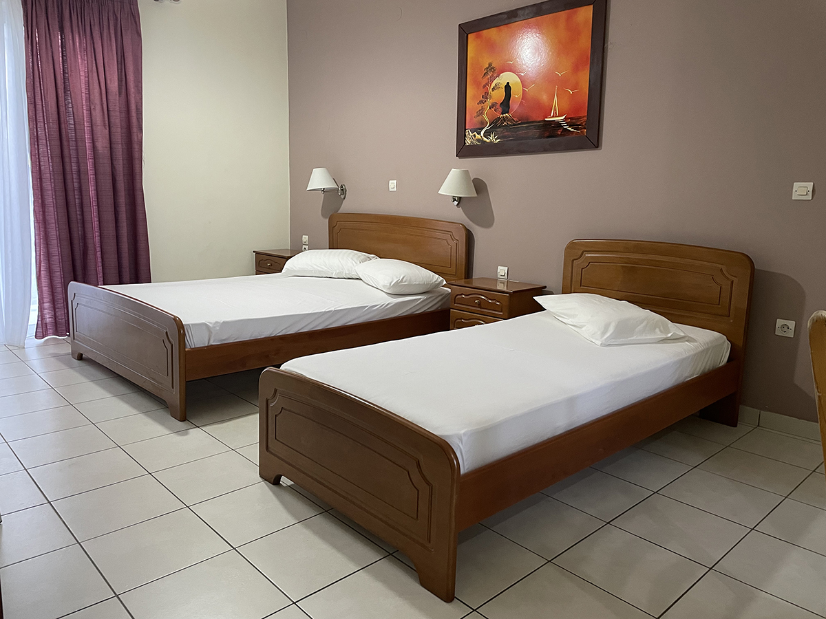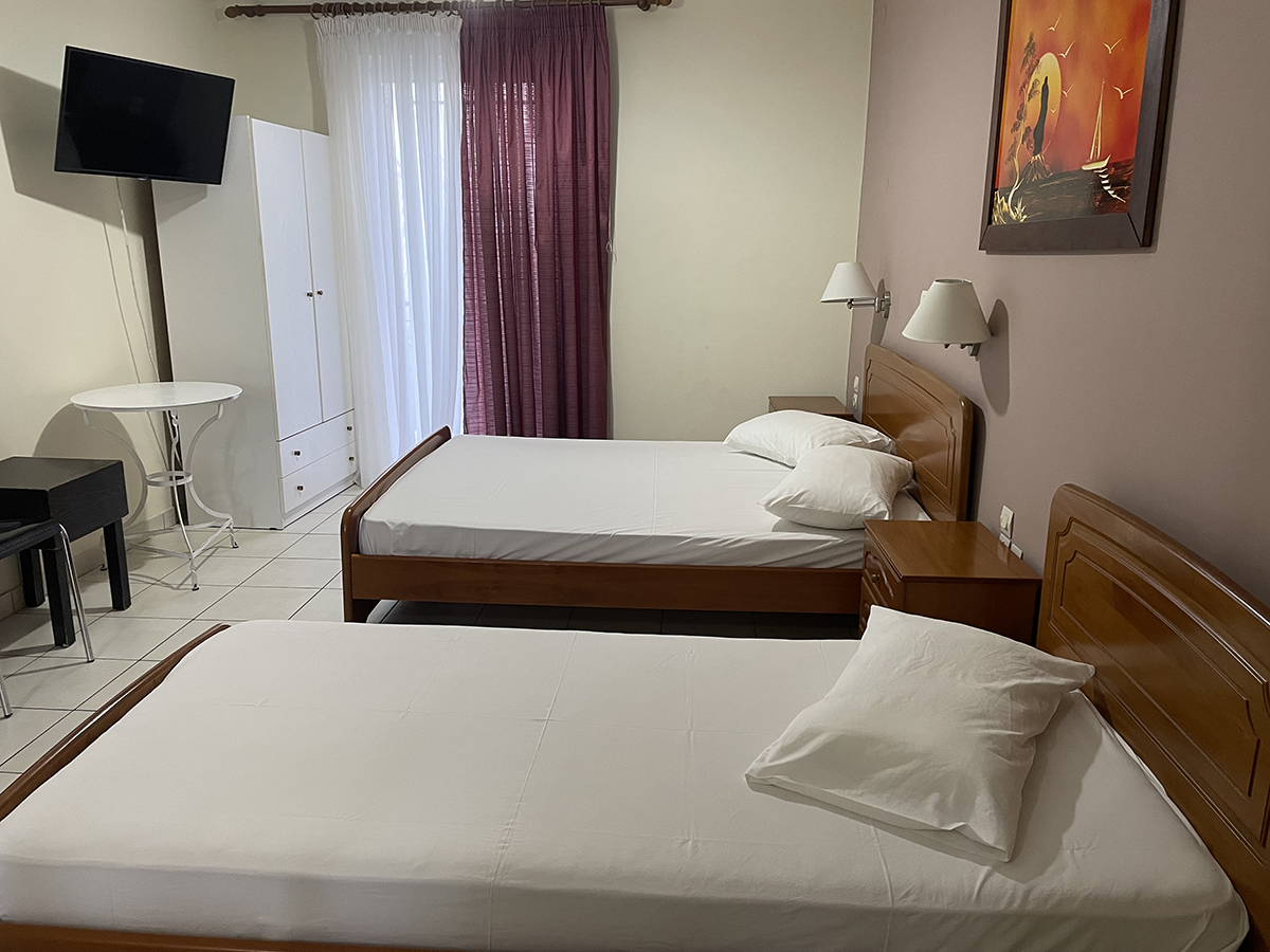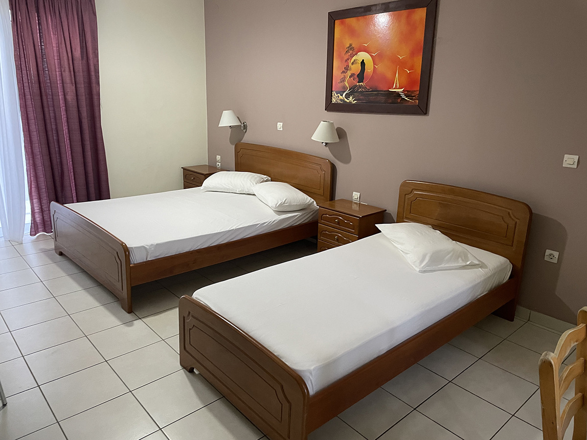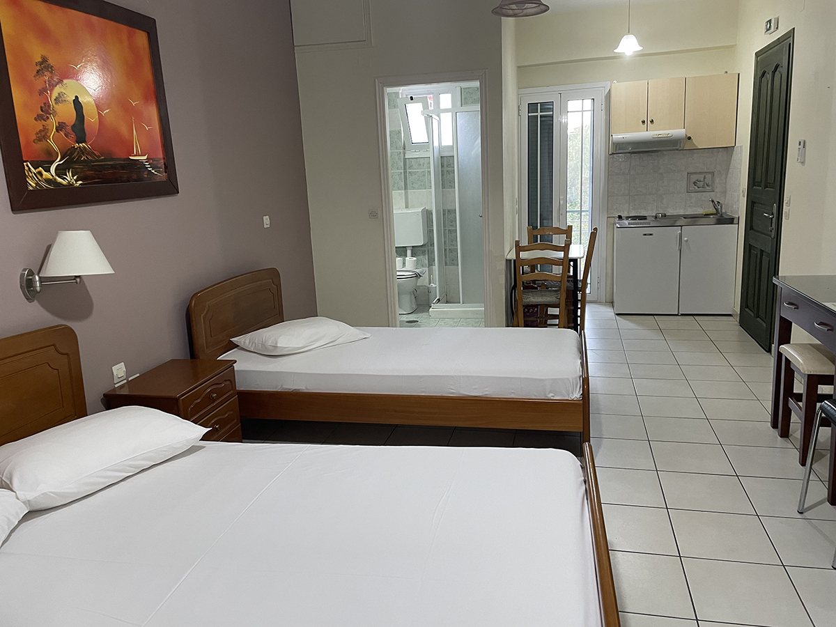 Dvokrevetni/trokrevetni studio: Svaki studio se sastoji od jednog francuskog i jednog singl ležaja ili tri singl standardna ležaja, dva noćna stočića pored kreveta, dve lampe, TV, klima uređaj, ormar. Kuhinja se sastoji od šporeta sa dve ringle, frižidera, aspiratora i neophodnog posuđa za dve/tri osobe. Kupatilo sadrži tuš kabinu. Na terasu se izlazi iz spavaće sobe. Terasa se sastoji od stola sa dve/tri stolice.