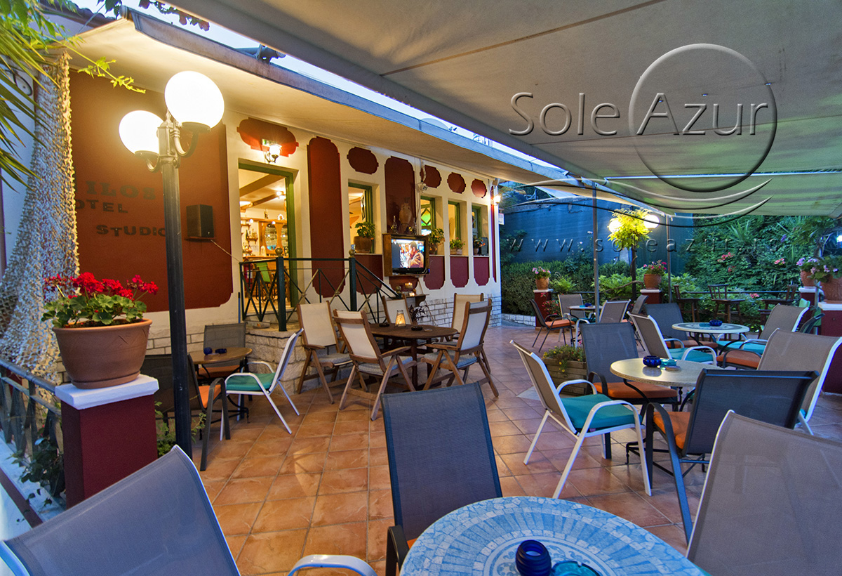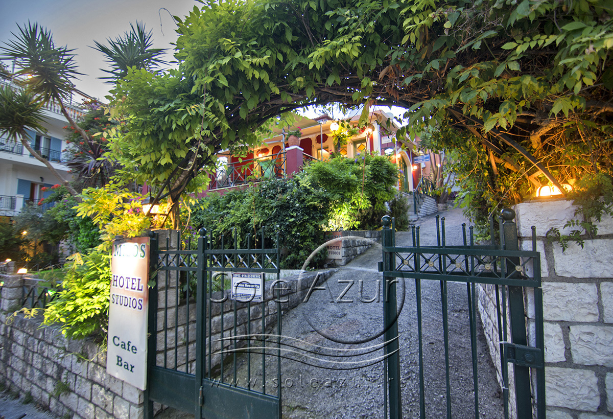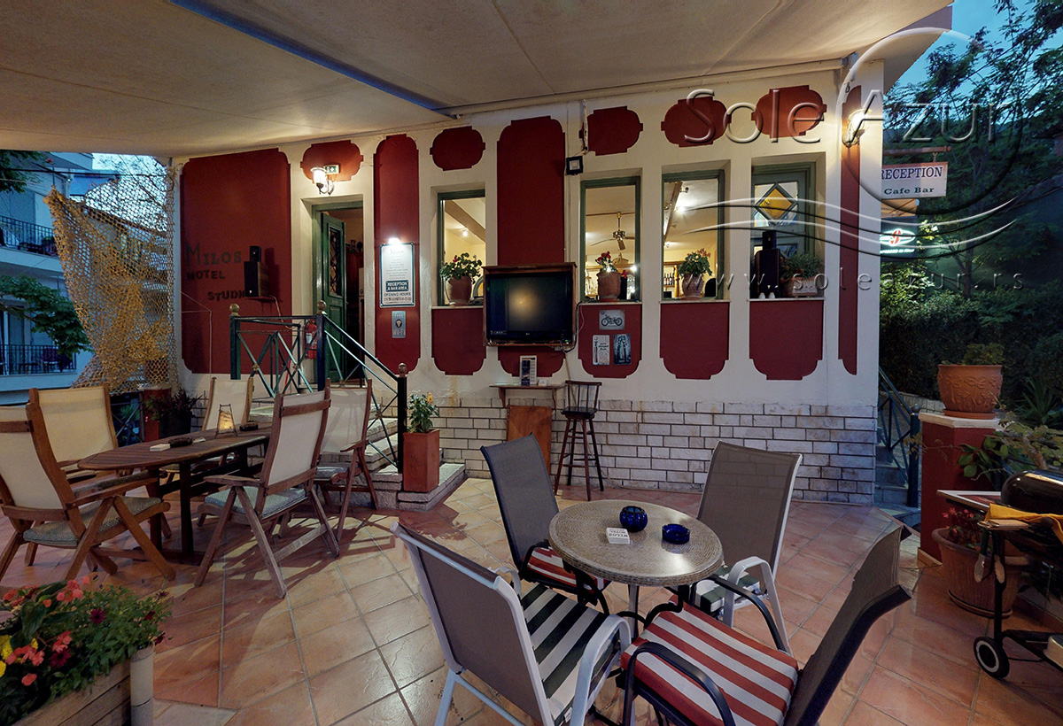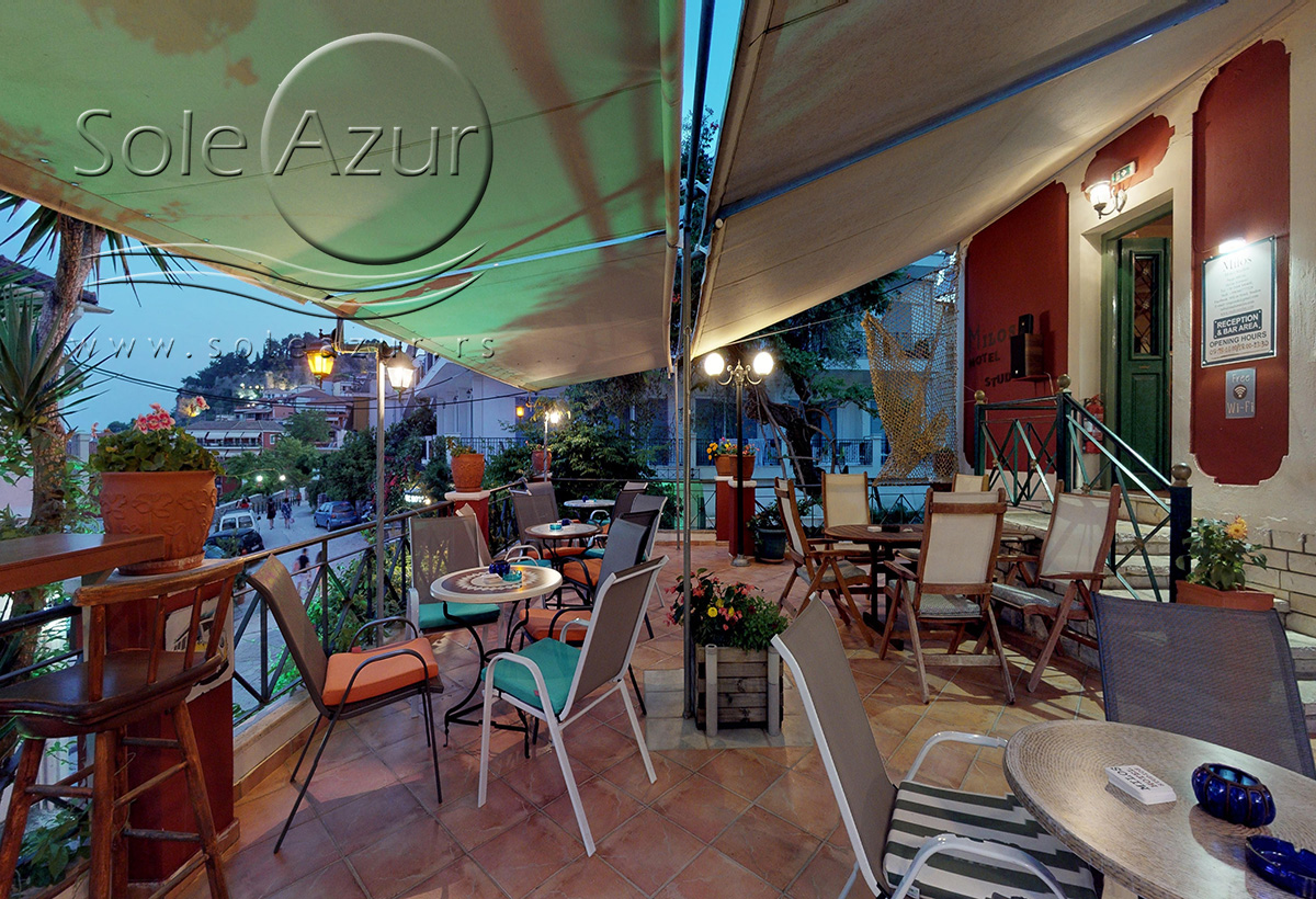 U sastavu Vile Milos studios se nalaze dve zgrade gde su smešteni studiji, kao i treći objekat gde je recepcija i prelepi restoran bar gde gosti mogu uživati uz meze i piće i odgledati aktuelnu utakmicu. Sam objekat je okružen zelenilom, tako da imate osećaj kao da ste u nekom parku, a ne u strogom centru Parge. U ogromnom dvorištu Vile postavljeni su stolovi sa stolicama tako da gosti mogu uživati u prirodi.