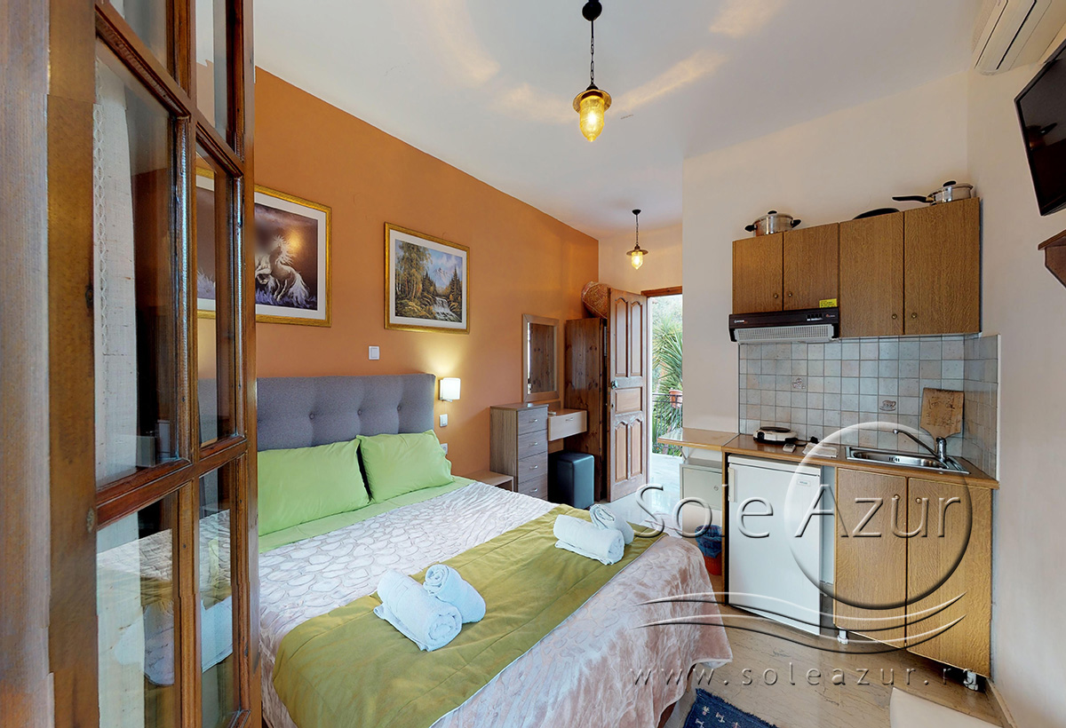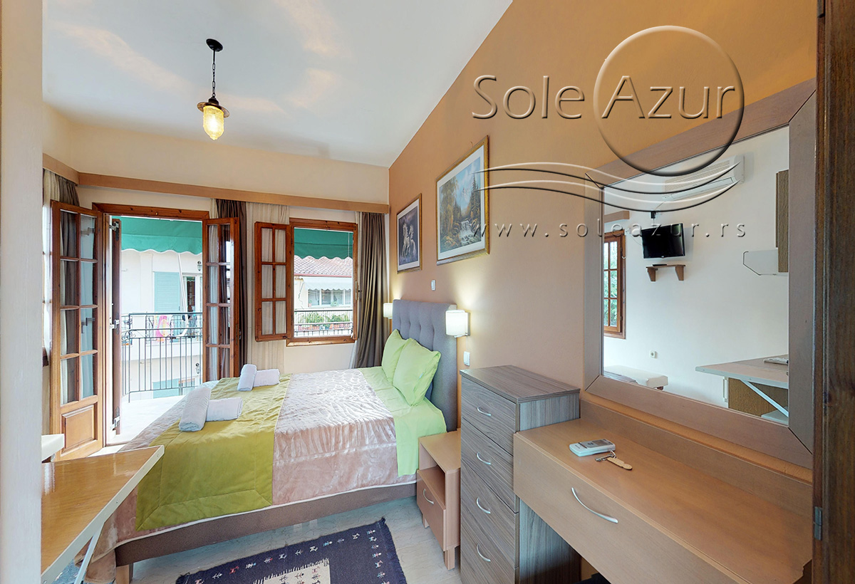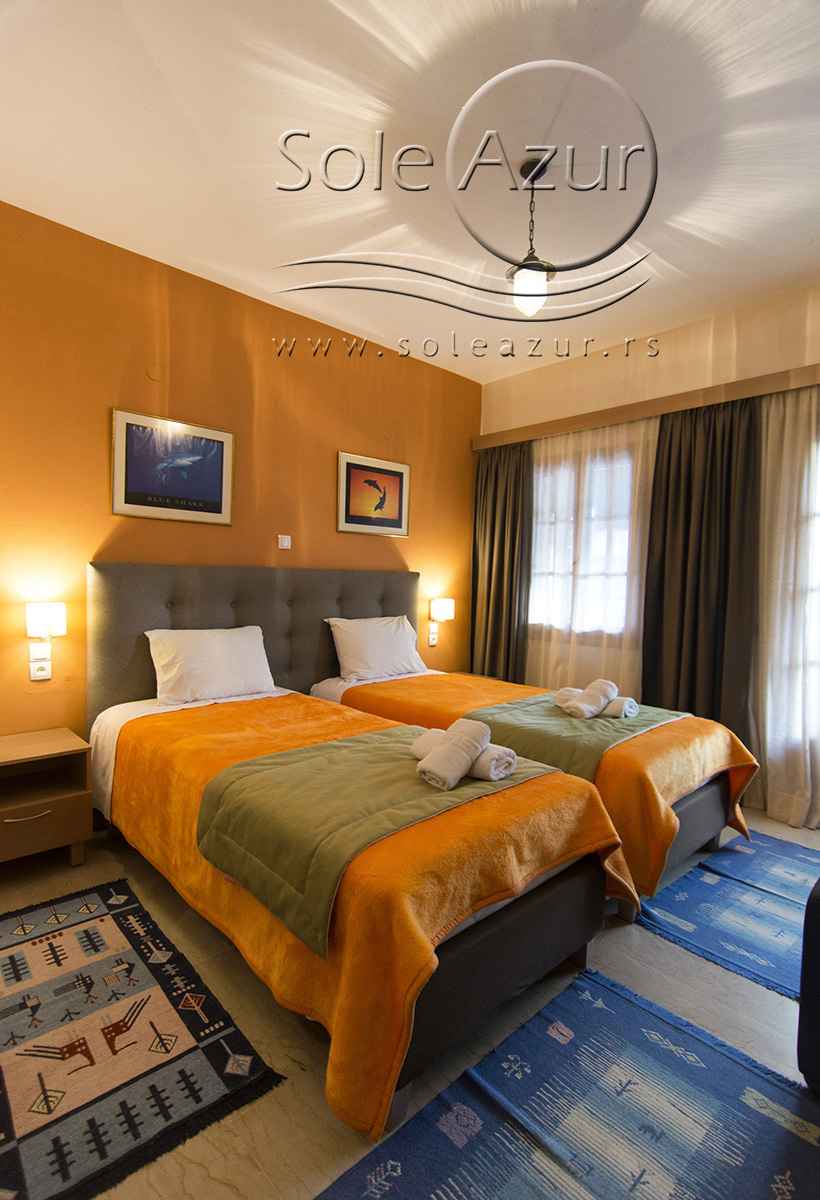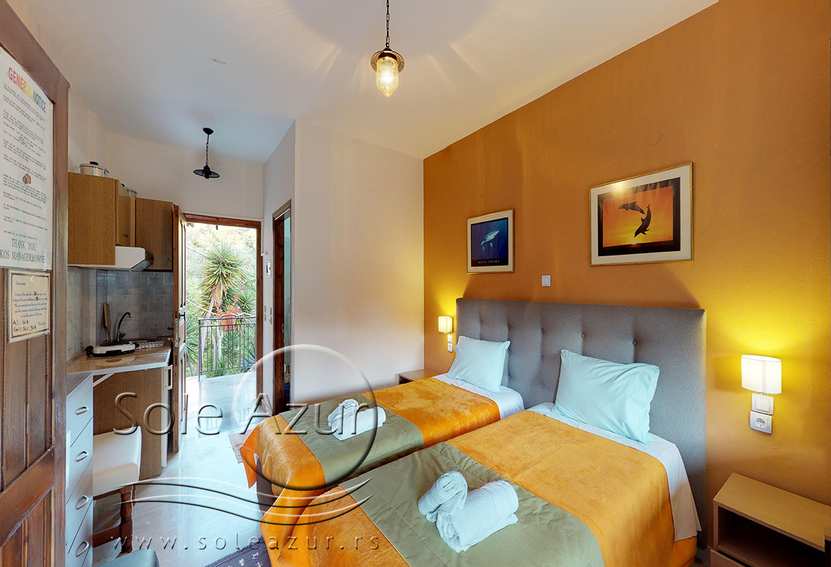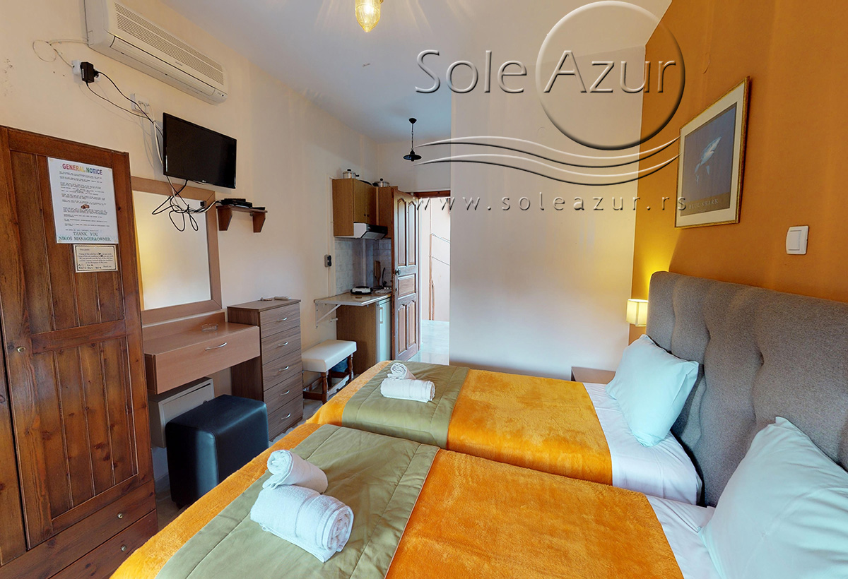 DVOKREVETNI STUDIJI: Dvokrevetni studiji u svom sastavu poseduju ili francuski ležaj dimenzija 190x155cm ili dva singl standardna ležaja dimenzija 190x90cm, dva noćna stočića, stočić sa ogledalom, TV, klima uređaj (5 eura/dnevno, plaća se na licu mesta – opciono), orman, WI-FI internet konekcija (BESPLATNO korišćenje). Kuhinja se sastoji od rešo sa jednom ringlom, frižidera, aspiratora, posuđa za dve osobe. Kupatila u svom sastavu poseduju tuš, jedan mali i jedan veliki peškir po osobi. Svaki studio poseduje terasu na kojoj se nalazi sto sa dve stolice.