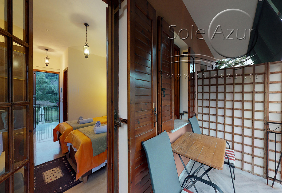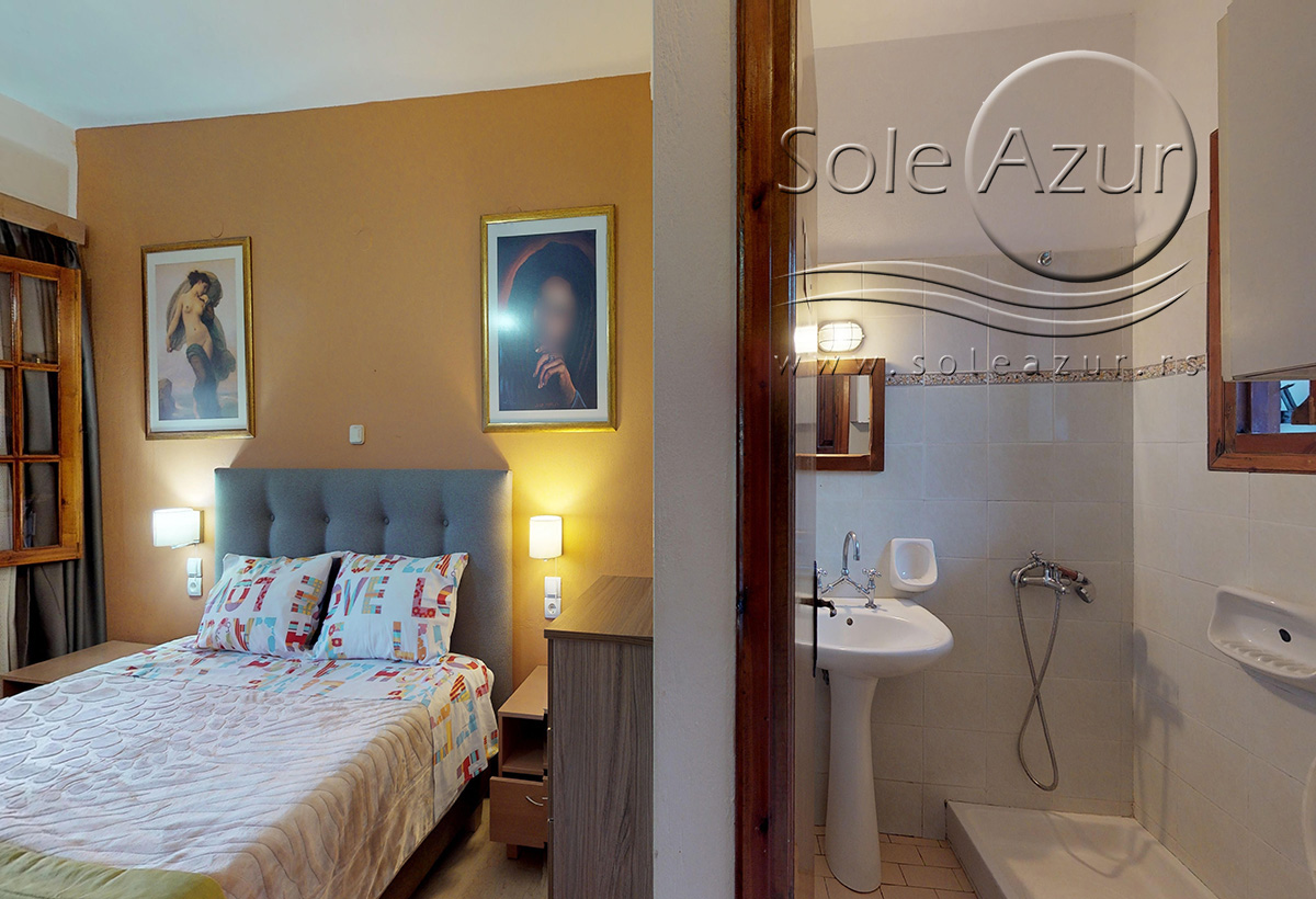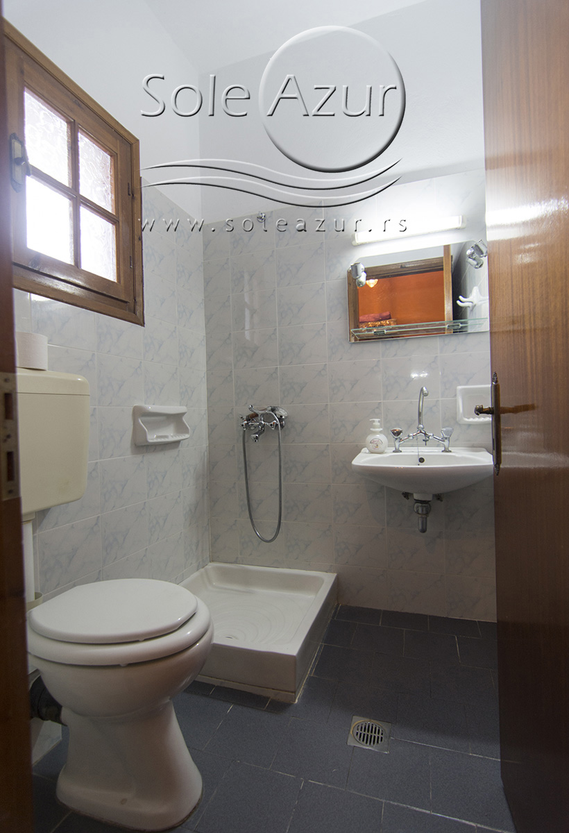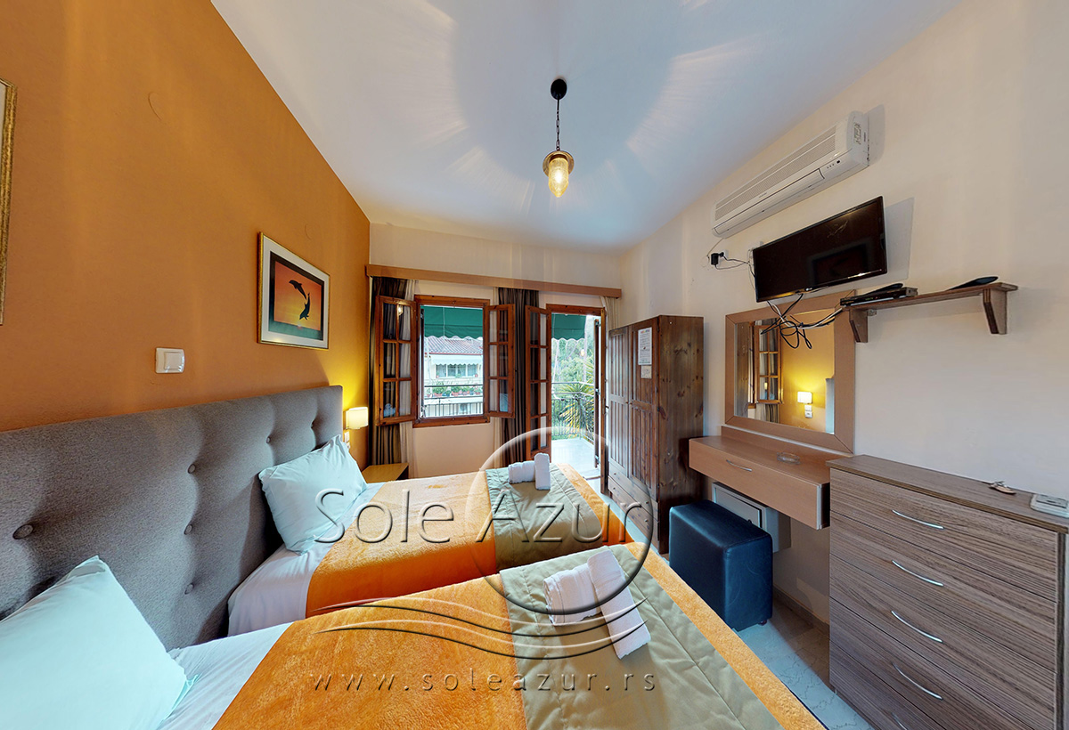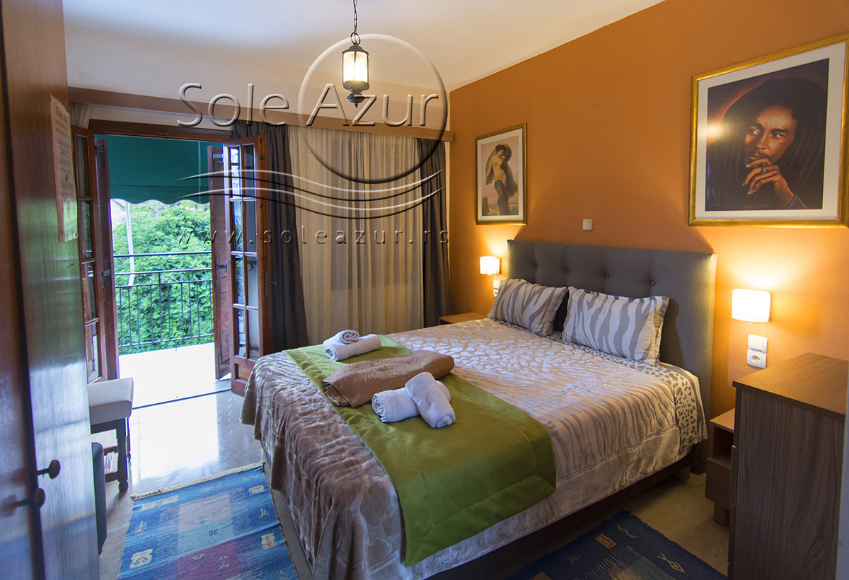 DVOKREVETNI STUDIJI: Dvokrevetni studiji u svom sastavu poseduju ili francuski ležaj dimenzija 190x155cm ili dva singl standardna ležaja dimenzija 190x90cm, dva noćna stočića, stočić sa ogledalom, TV, klima uređaj (5 eura/dnevno, plaća se na licu mesta – opciono), orman, WI-FI internet konekcija (BESPLATNO korišćenje). Kuhinja se sastoji od rešo sa jednom ringlom, frižidera, aspiratora, posuđa za dve osobe. Kupatila u svom sastavu poseduju tuš, jedan mali i jedan veliki peškir po osobi. Svaki studio poseduje terasu na kojoj se nalazi sto sa dve stolice.