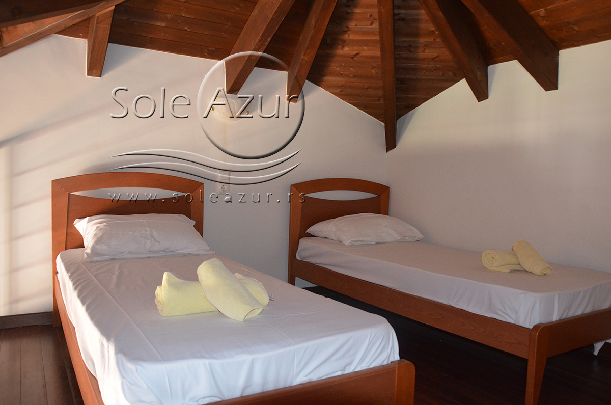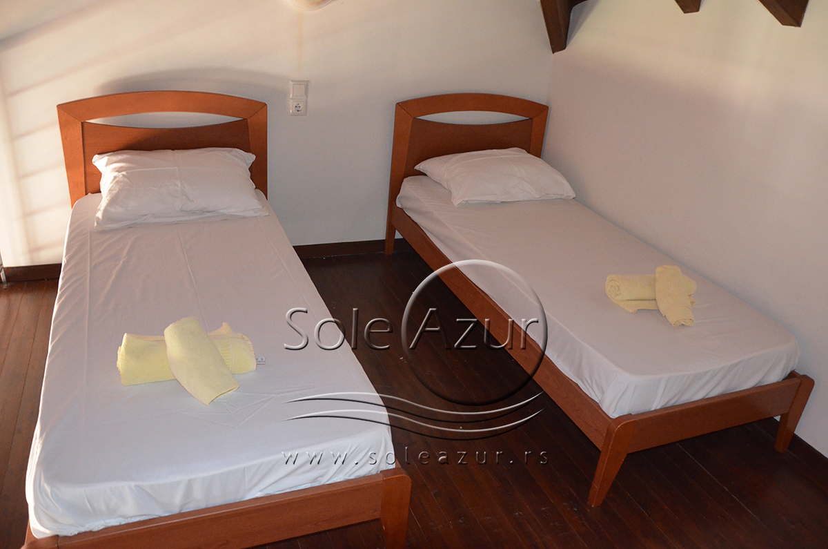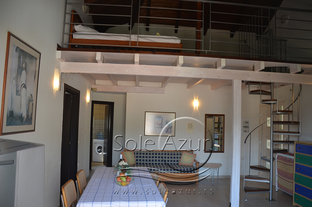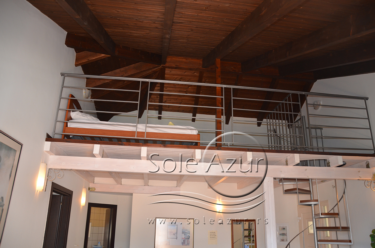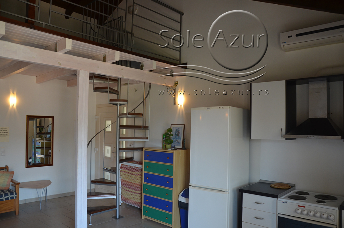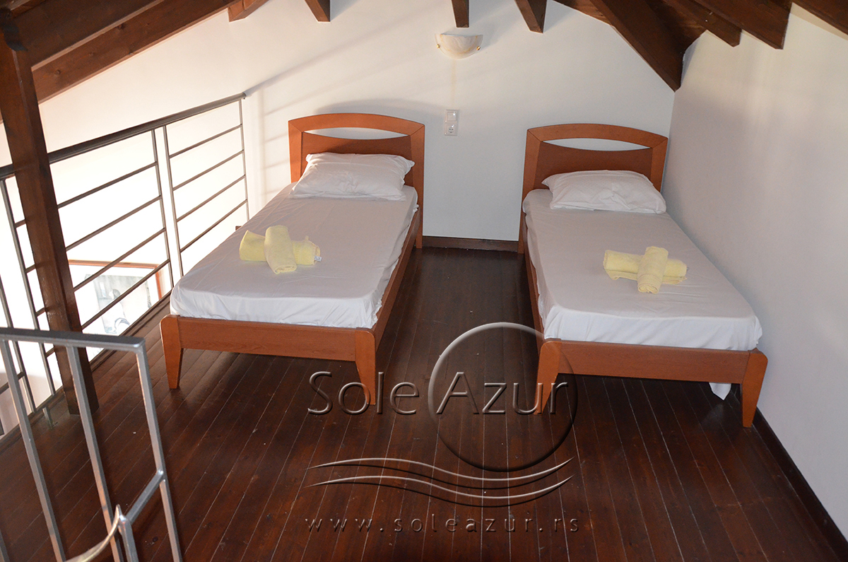 Duplex se sastoji od veoma prostranog dnevnog boravka iz koga se ulazi u dve spavaće sobe, kupatilo, toalet, i iz koga se stepenicama penje na galeriju na kojoj se nalaze dva singl ležaja dimenzija 90x200cm. U sklopu dnevnog boravka je kuhinja koja se sastoji od velikog šporeta sa 4 ringle i rernom za pečenje, velikim kombinovanim frižiderom sa komorom za zamrzavanje i aspiratorom kao i neophodnim posuđem za 6 osoba. Tu je i trpezarijski deo sa velikim stolom sa 6 stolica, TV, klima uređaj (besplatno), kao i jednim kaučem za sedenje. Izlaz na veliku terasu. Prva spavaća soba ima dva spojena singl ležaja od kojih je svaki dimenzija 90x200cm, dva noćna stočića sa lampama, ormarom i dve stolice, klima uređaj (besplatno), izlaz na terasu. Druga spavaća soba ima francuski ležaj dimenzija180x200cm, dva noćna stočića sa dve lampe, klima uređaj (besplatno), ormar i izlaz na terasu. U malom toaletu se nalazi i veš mašina, dok je u kupatilu i tuš kabina.