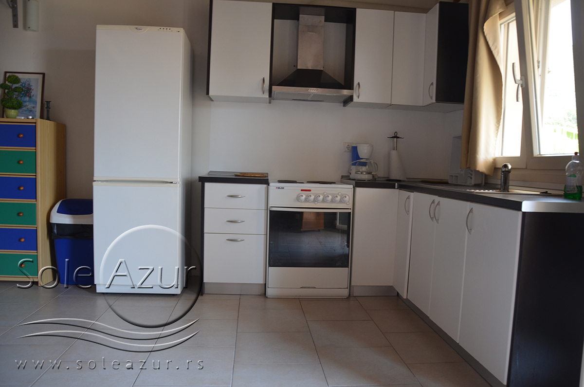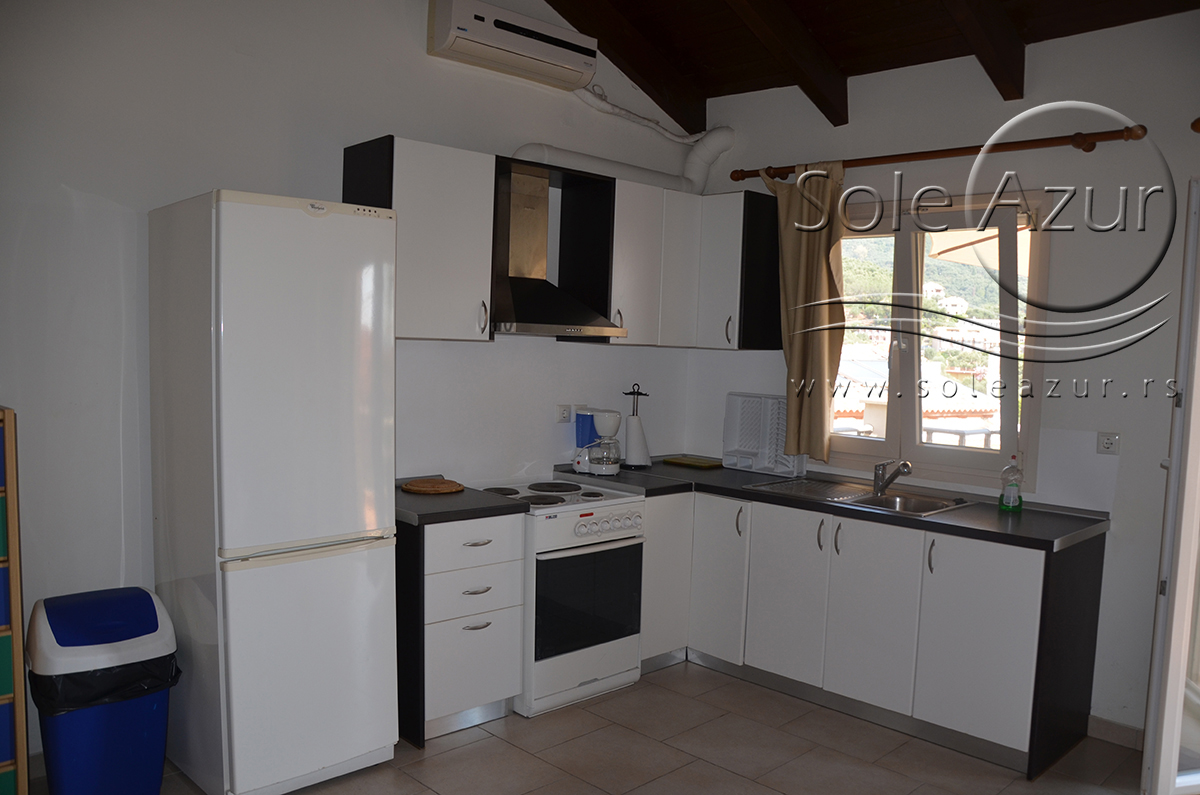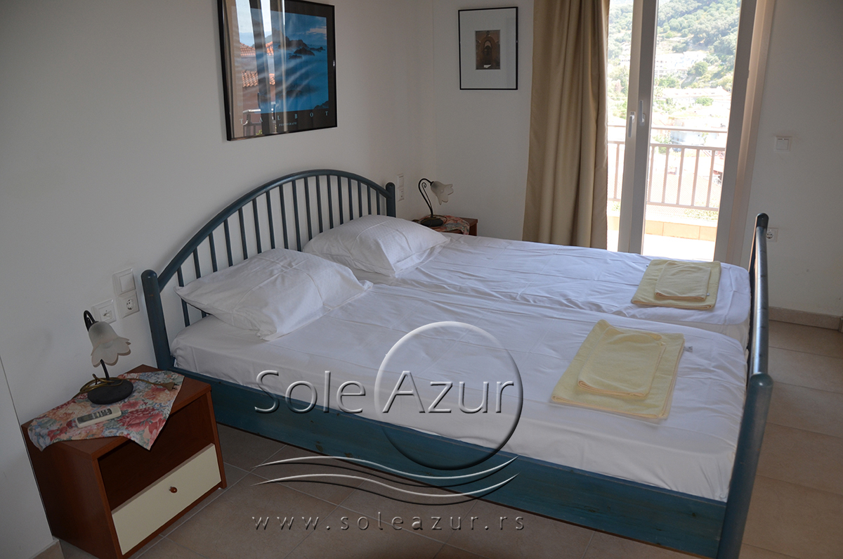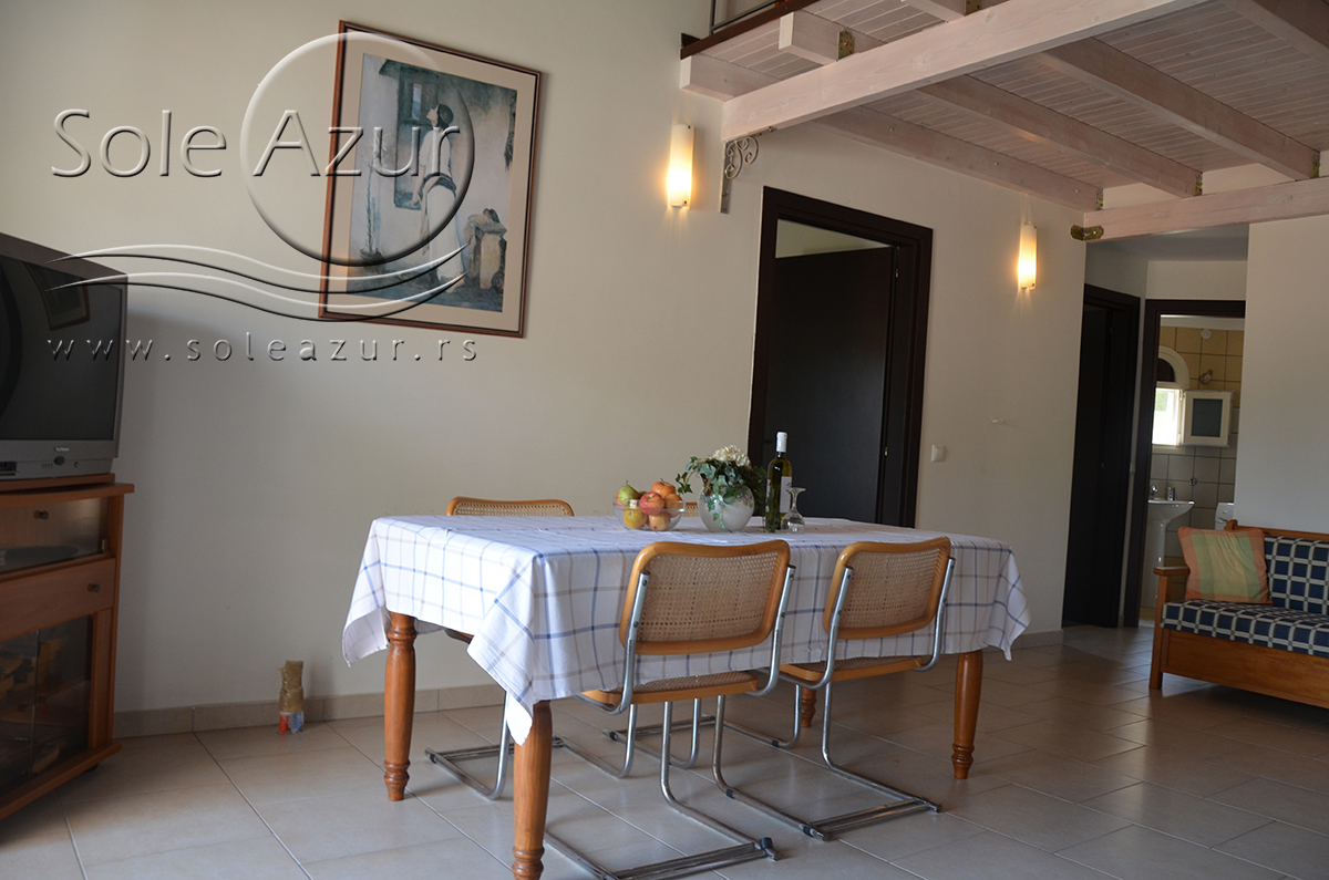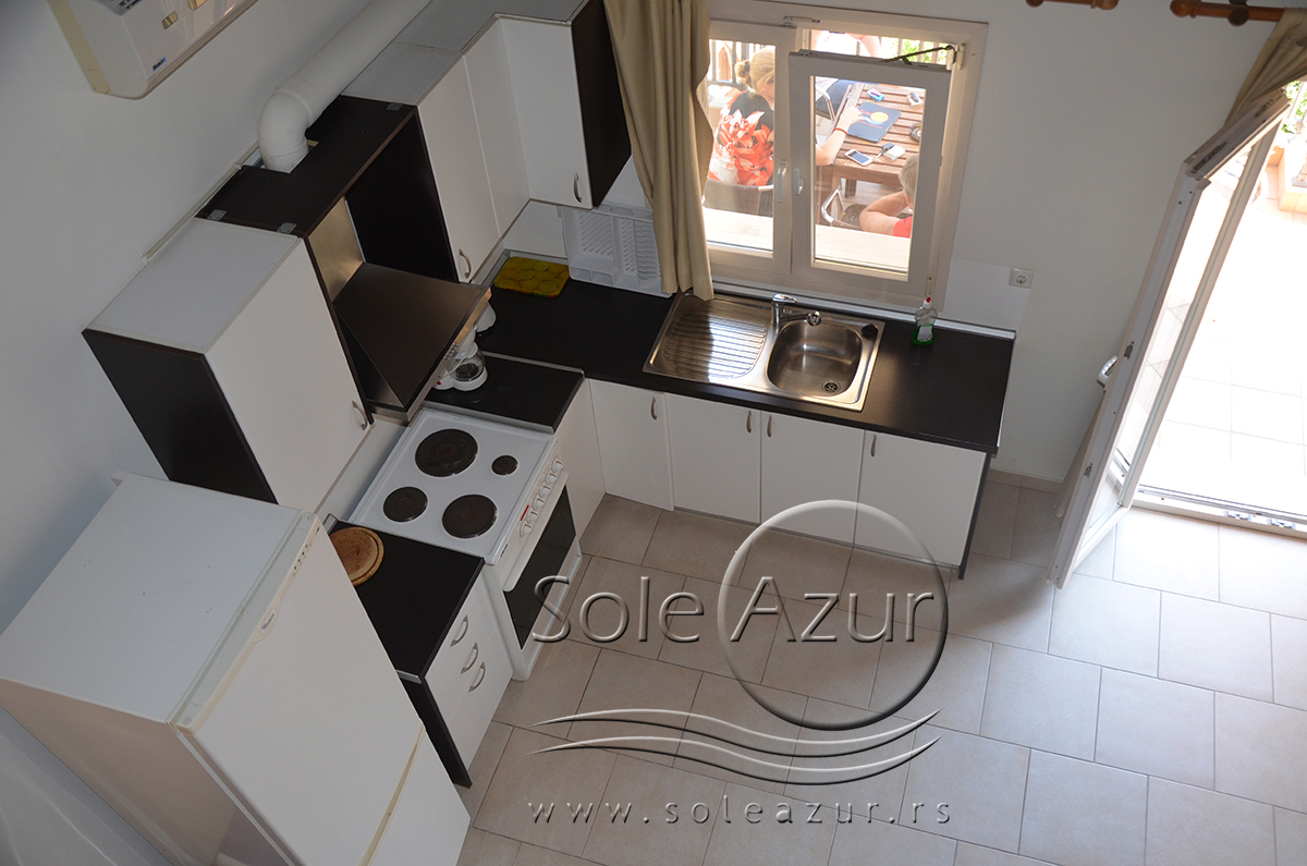 Duplex se sastoji od veoma prostranog dnevnog boravka iz koga se ulazi u dve spavaće sobe, kupatilo, toalet, i iz koga se stepenicama penje na galeriju na kojoj se nalaze dva singl ležaja dimenzija 90x200cm. U sklopu dnevnog boravka je kuhinja koja se sastoji od velikog šporeta sa 4 ringle i rernom za pečenje, velikim kombinovanim frižiderom sa komorom za zamrzavanje i aspiratorom kao i neophodnim posuđem za 6 osoba. Tu je i trpezarijski deo sa velikim stolom sa 6 stolica, TV, klima uređaj (besplatno), kao i jednim kaučem za sedenje. Izlaz na veliku terasu. Prva spavaća soba ima dva spojena singl ležaja od kojih je svaki dimenzija 90x200cm, dva noćna stočića sa lampama, ormarom i dve stolice, klima uređaj (besplatno), izlaz na terasu. Druga spavaća soba ima francuski ležaj dimenzija180x200cm, dva noćna stočića sa dve lampe, klima uređaj (besplatno), ormar i izlaz na terasu. U malom toaletu se nalazi i veš mašina, dok je u kupatilu i tuš kabina.