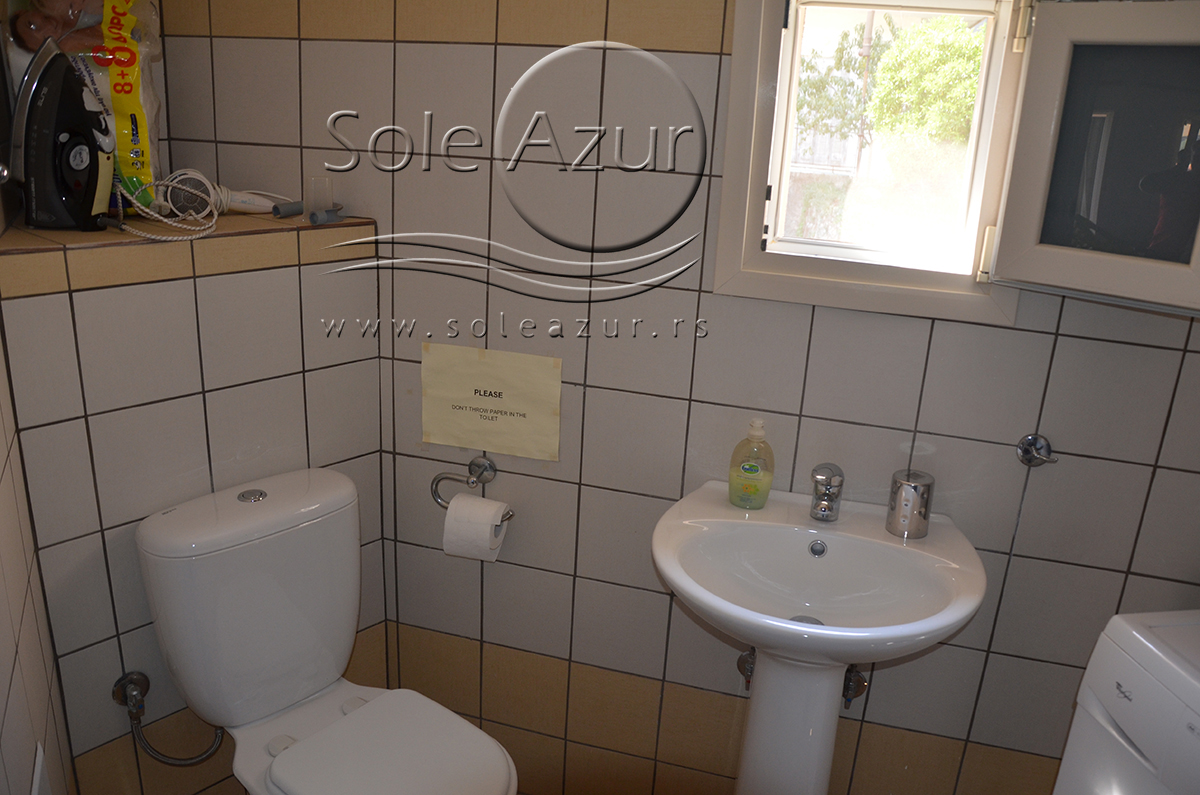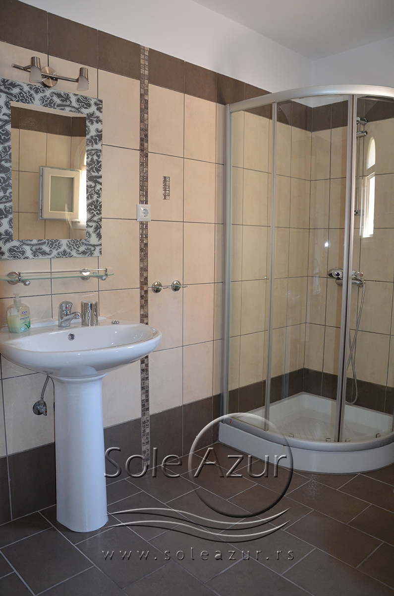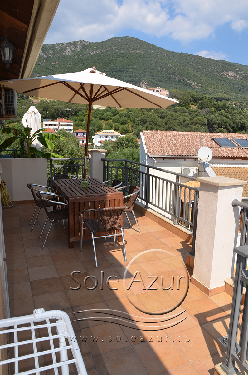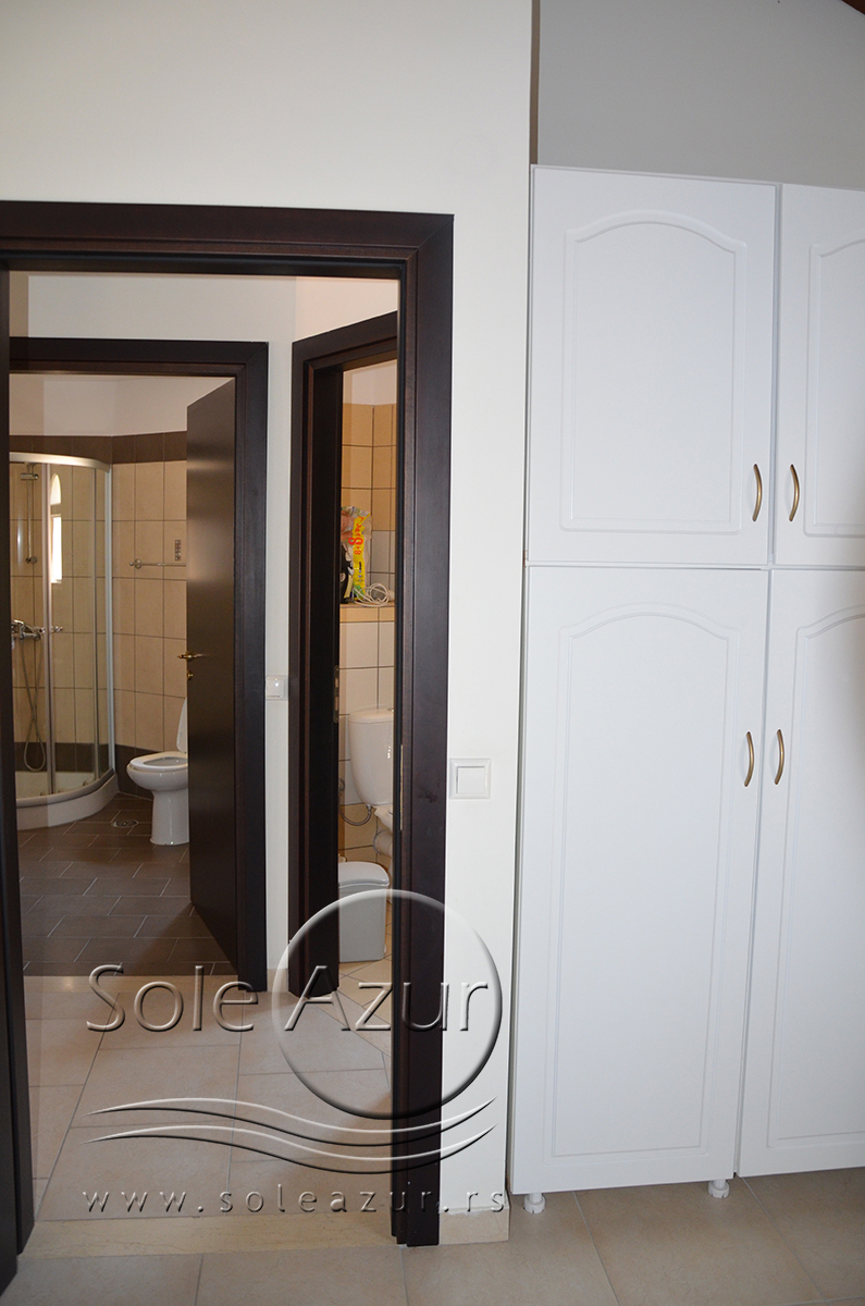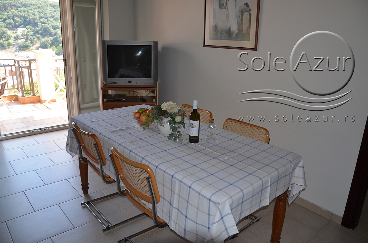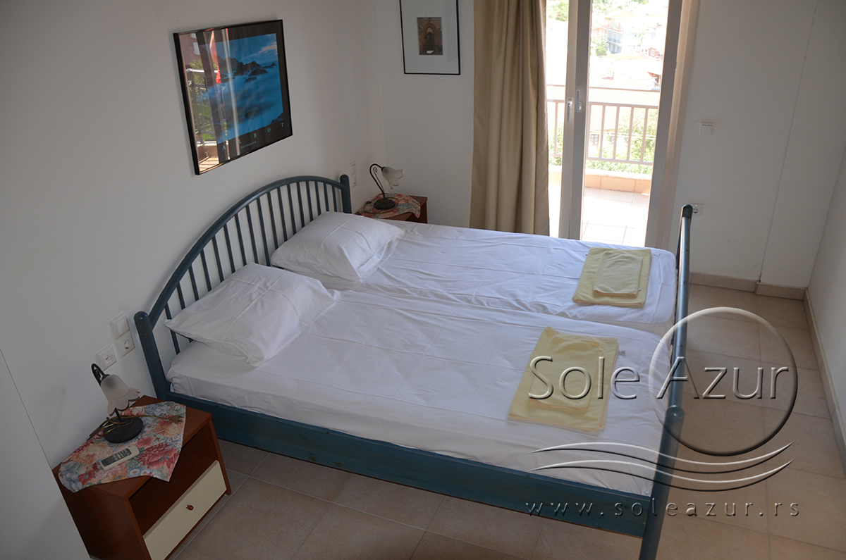 Duplex se sastoji od veoma prostranog dnevnog boravka iz koga se ulazi u dve spavaće sobe, kupatilo, toalet, i iz koga se stepenicama penje na galeriju na kojoj se nalaze dva singl ležaja dimenzija 90x200cm. U sklopu dnevnog boravka je kuhinja koja se sastoji od velikog šporeta sa 4 ringle i rernom za pečenje, velikim kombinovanim frižiderom sa komorom za zamrzavanje i aspiratorom kao i neophodnim posuđem za 6 osoba. Tu je i trpezarijski deo sa velikim stolom sa 6 stolica, TV, klima uređaj (besplatno), kao i jednim kaučem za sedenje. Izlaz na veliku terasu. Prva spavaća soba ima dva spojena singl ležaja od kojih je svaki dimenzija 90x200cm, dva noćna stočića sa lampama, ormarom i dve stolice, klima uređaj (besplatno), izlaz na terasu. Druga spavaća soba ima francuski ležaj dimenzija180x200cm, dva noćna stočića sa dve lampe, klima uređaj (besplatno), ormar i izlaz na terasu. U malom toaletu se nalazi i veš mašina, dok je u kupatilu i tuš kabina.