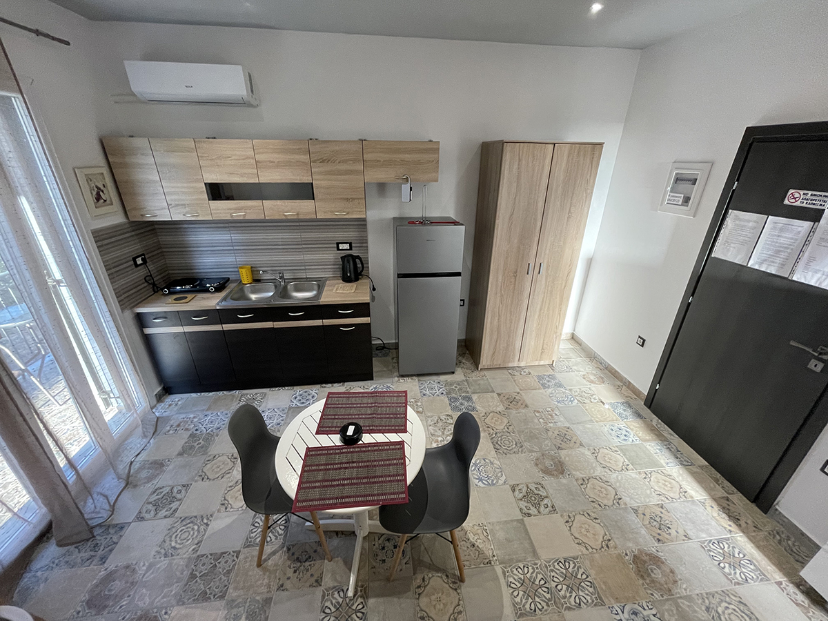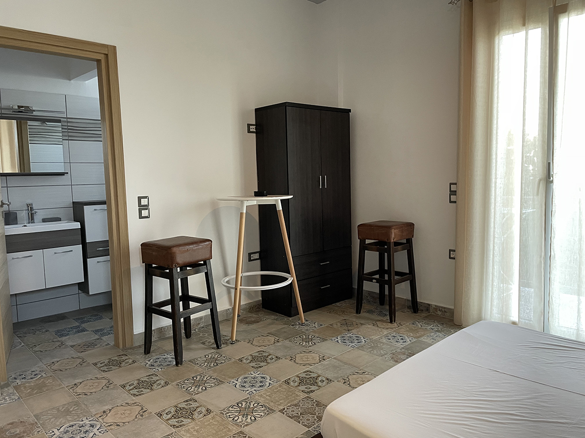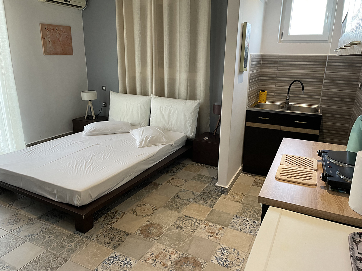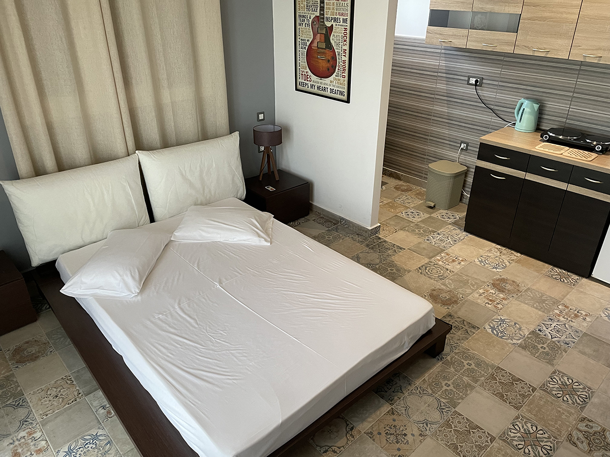Dvokrevetni studio – poseduje 1 francuski ili 2 sing ležaja, orman za stvari, noćni stočić i klima uređaje, kuhinju opremljenu osnovnim posuđem. Takođe, studio poseduje i kupatilo sa tuš/WC, kao i terasu sa garniturom za sedenje.