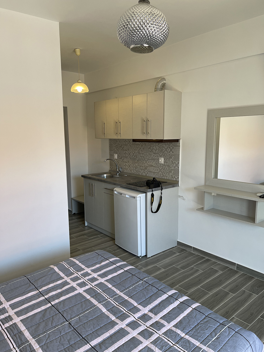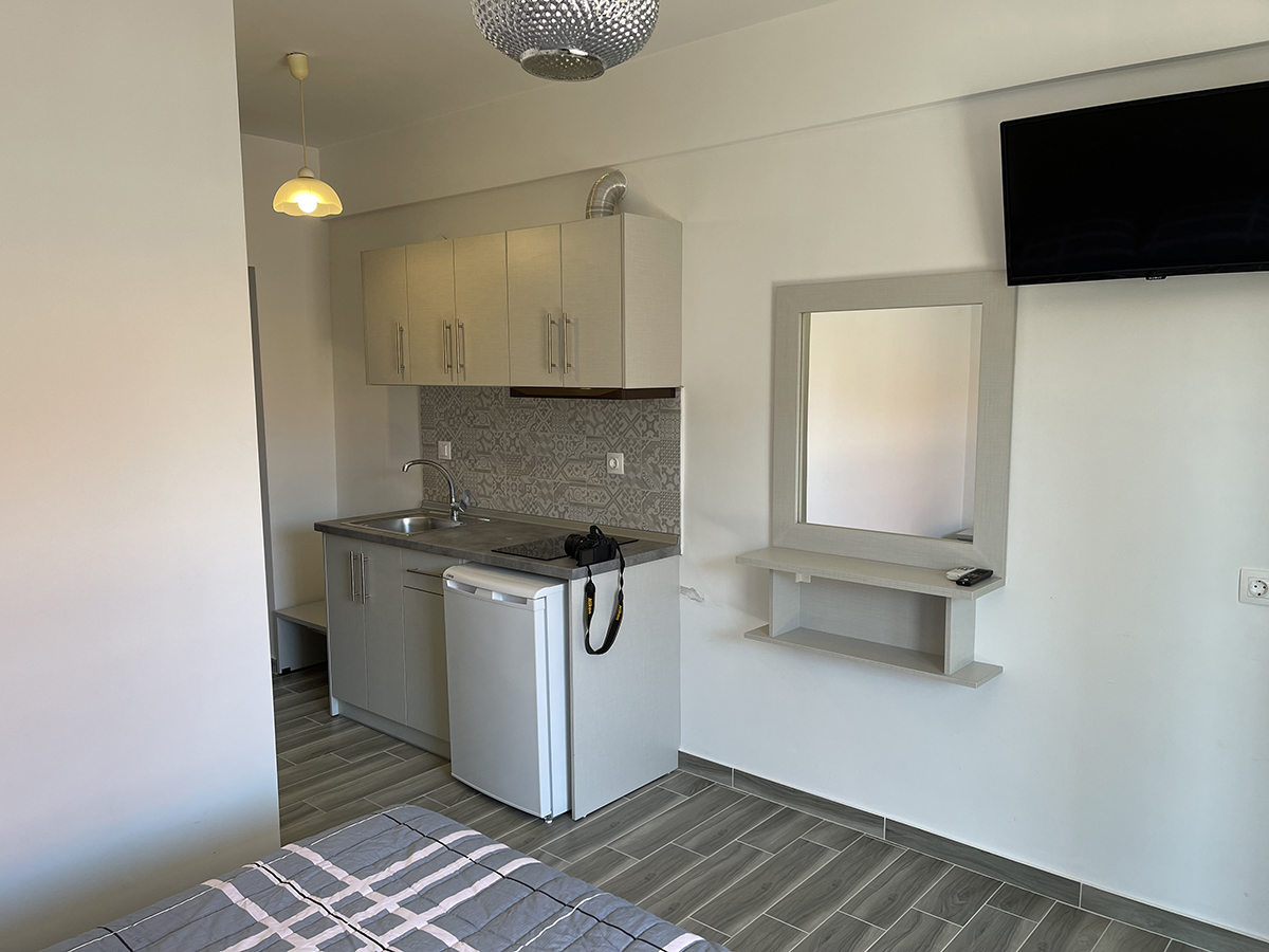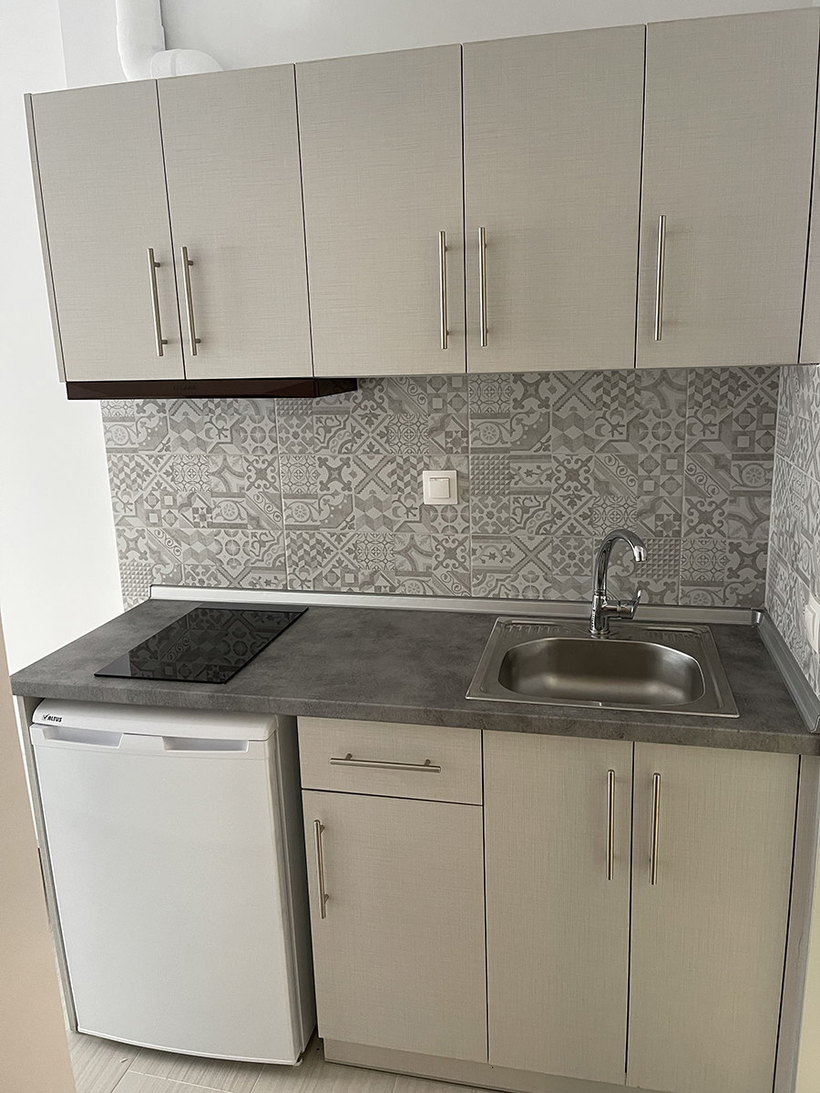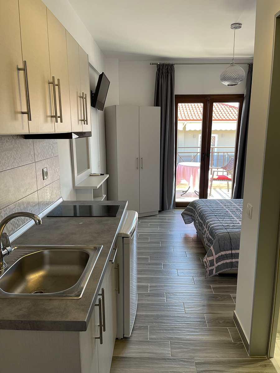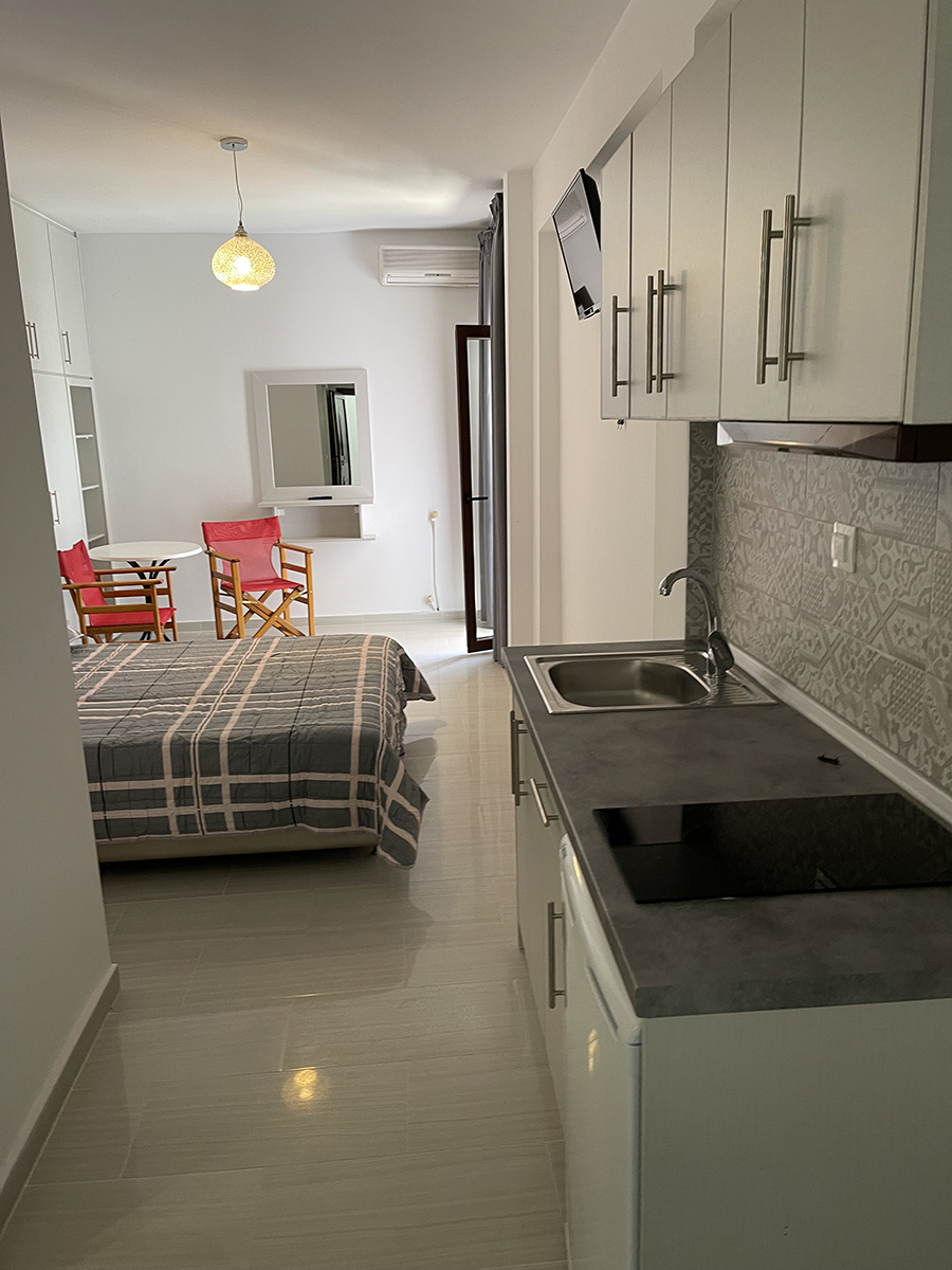 DVOKREVETNI STUDIO: Sastoji se od francuskog ležaja dimenzija (160X200cm), ormara, noćnog stočića sa ogledalom, TV/KAT, klima uređaja (BESPLATNO). Kuhinja je u potpunosti opremljena posuđem za dve osobe, aspiratorom, šporetom sa dve ringle i frižiderom. Prelepo kupatilo je sa tuš kabinom, fenom za kosu. Svaki studio poseduje terasu sa stolom i dve stolice.